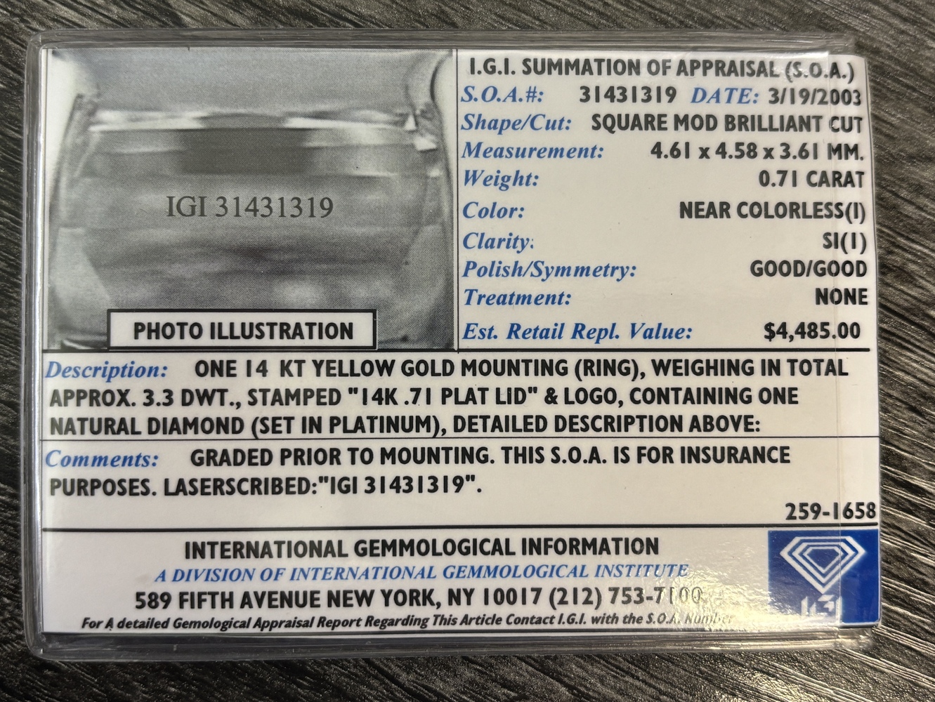 Stone: .71ct Princess Diamond SI1 I IGI 31431319 (Can be purchased separately 1349364)