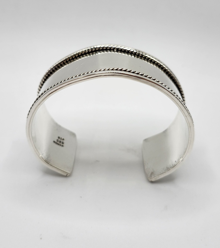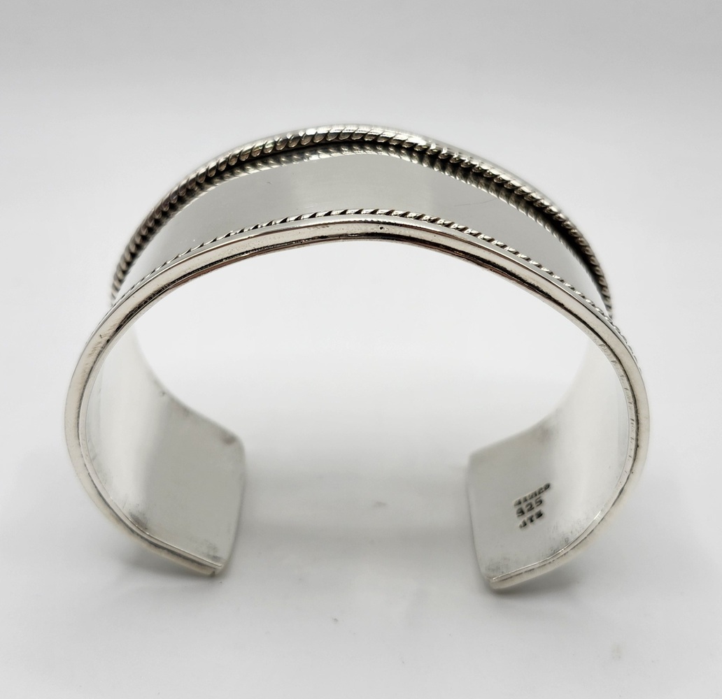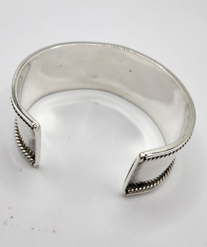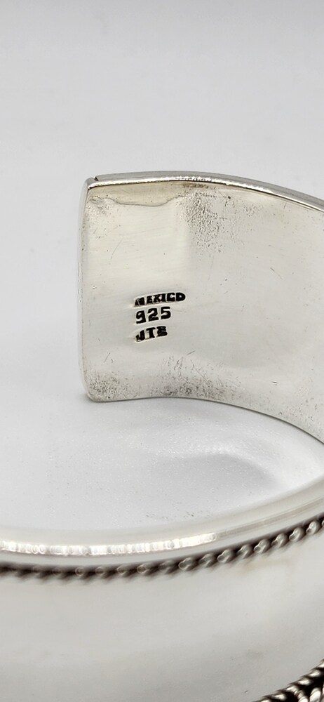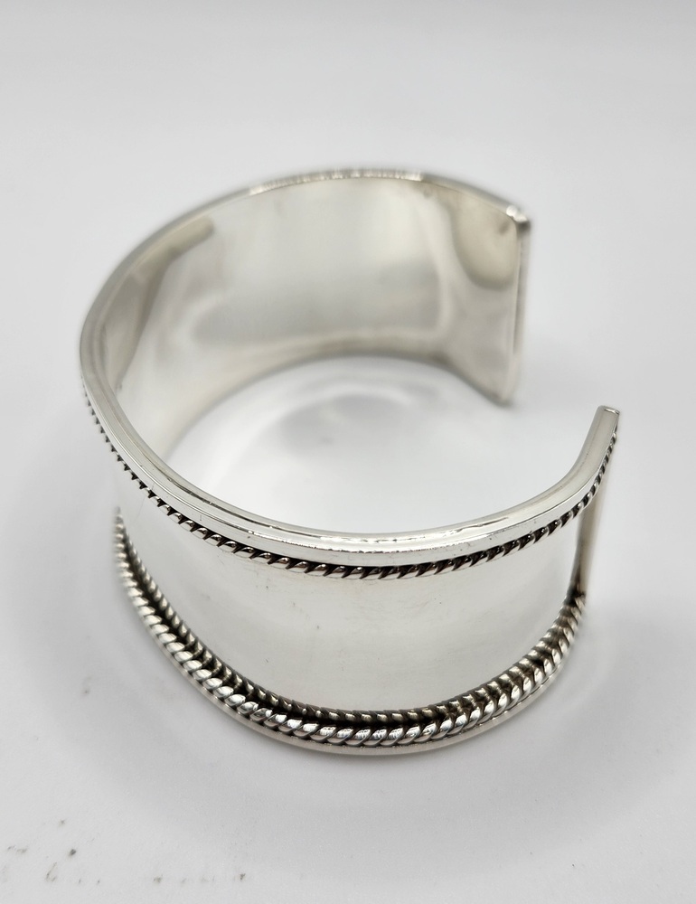 Beautiful handcrafted Mexican sterling silver cuff bracelet with twisted rope edge design. Marked “MEXICO 925 JTE.” Weighs 51.2 grams and measures approximately 7" around including the gap. Classic polished finish with minimal signs of wear.