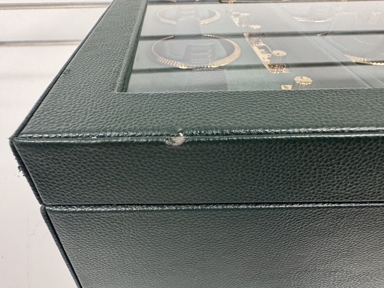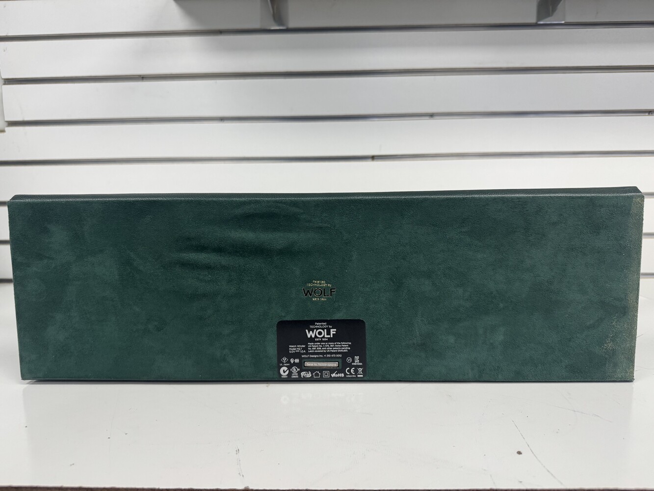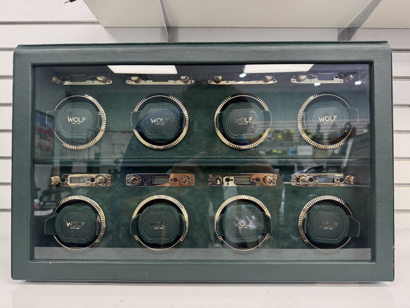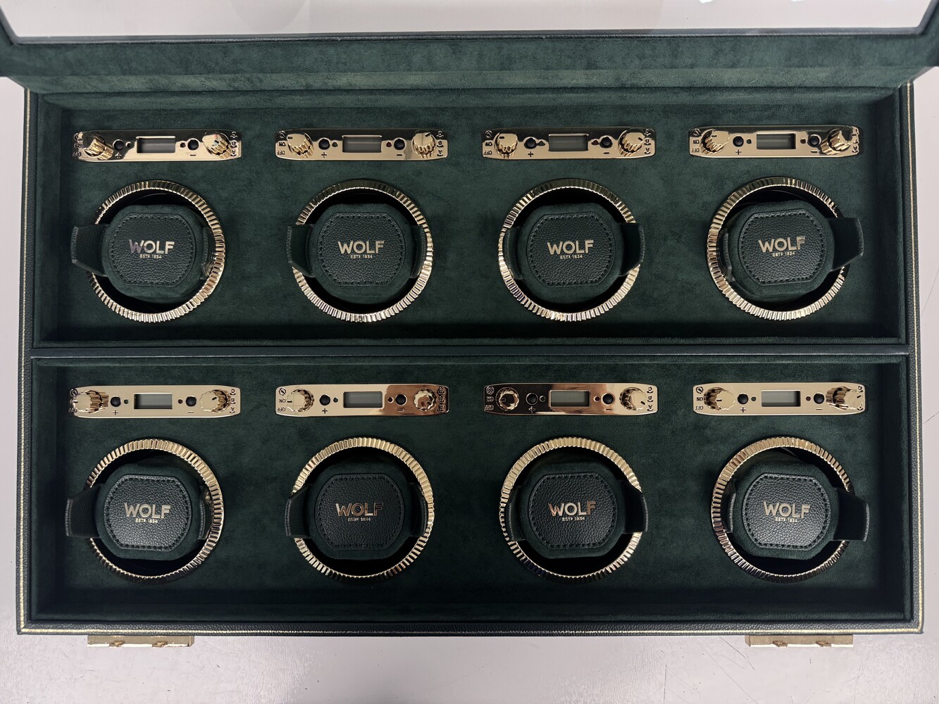 Handmade throughout, British Racing melds the green international motor racing colour of the UK’s cars raced in Ireland in the early 1900’s with a revolutionary quad angled panelled lid. Fine work detailing includes hand-pressed gold foil lines on vegan friendly pebble-grained leather. Gold hardware accents throughout with cushion close hinges and fluted bezel. Another design first from WOLF. Take your watches for a spin in the 8 piece watch winder.