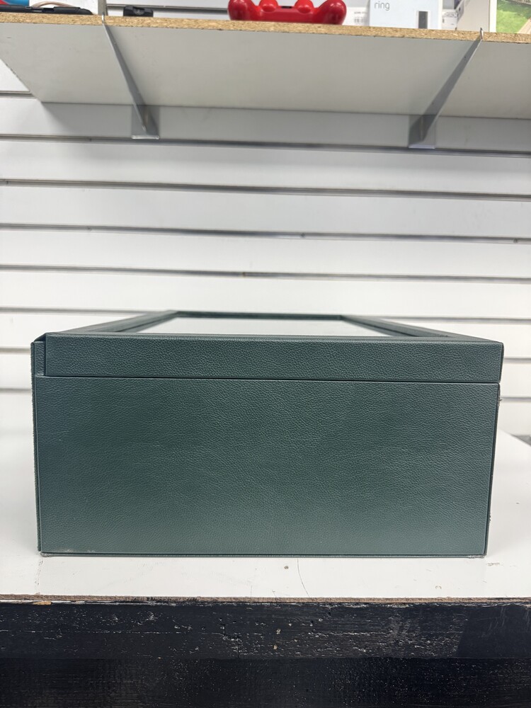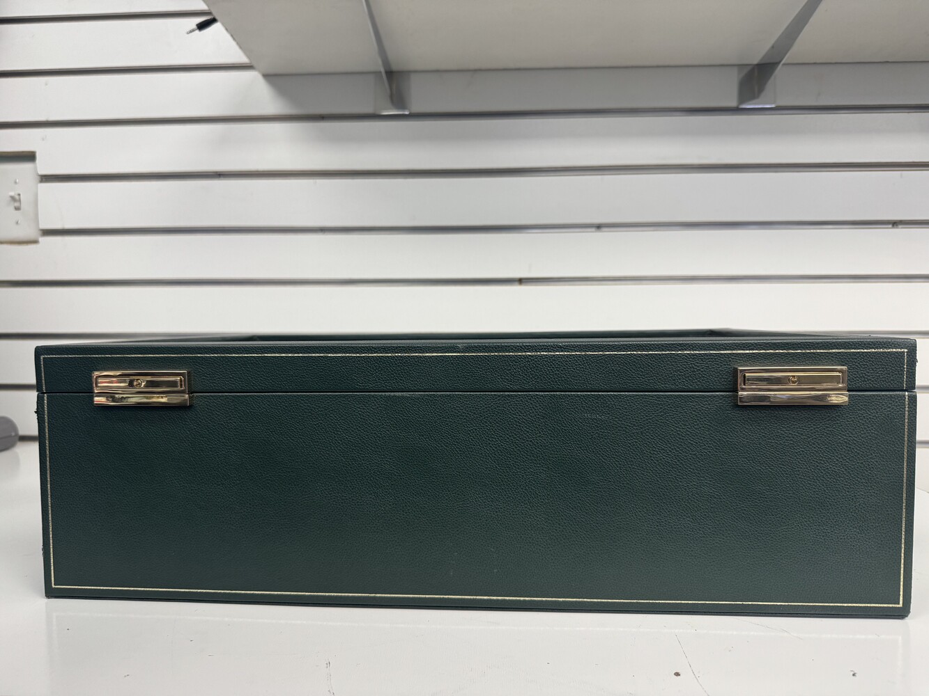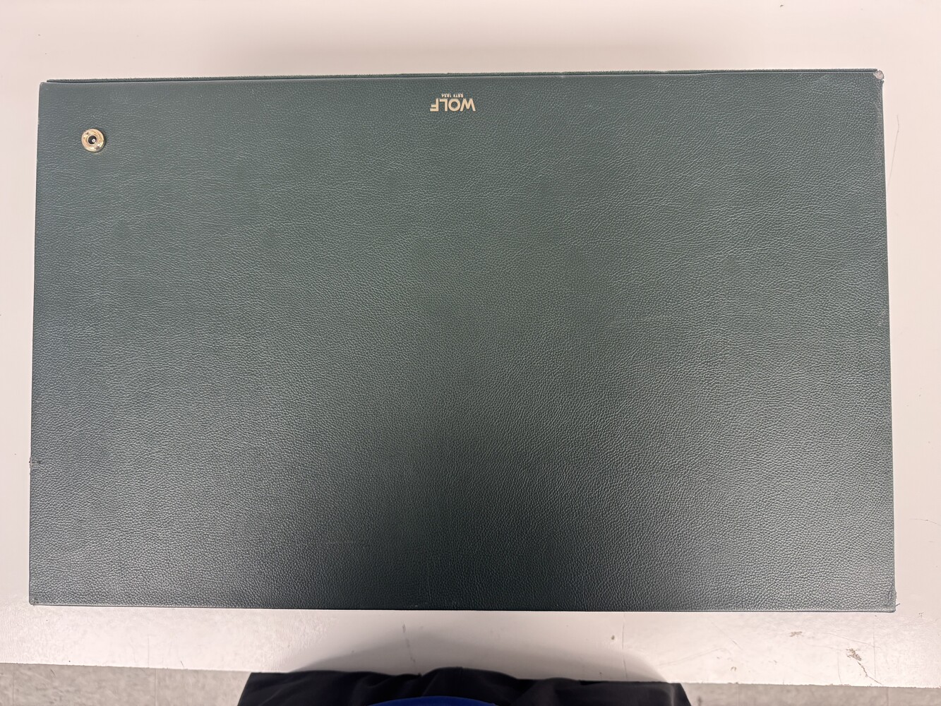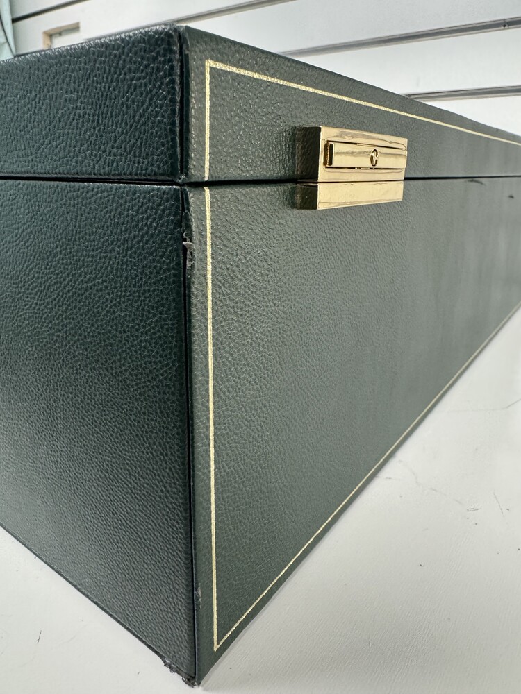 Handmade throughout, British Racing melds the green international motor racing colour of the UK’s cars raced in Ireland in the early 1900’s with a revolutionary quad angled panelled lid. Fine work detailing includes hand-pressed gold foil lines on vegan friendly pebble-grained leather. Gold hardware accents throughout with cushion close hinges and fluted bezel. Another design first from WOLF. Take your watches for a spin in the 8 piece watch winder.
