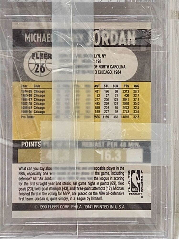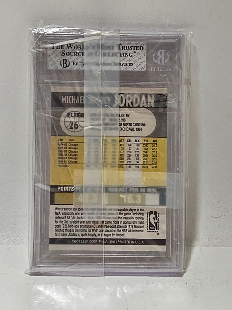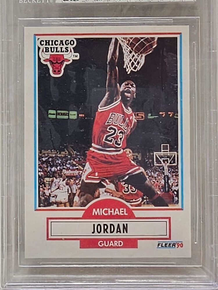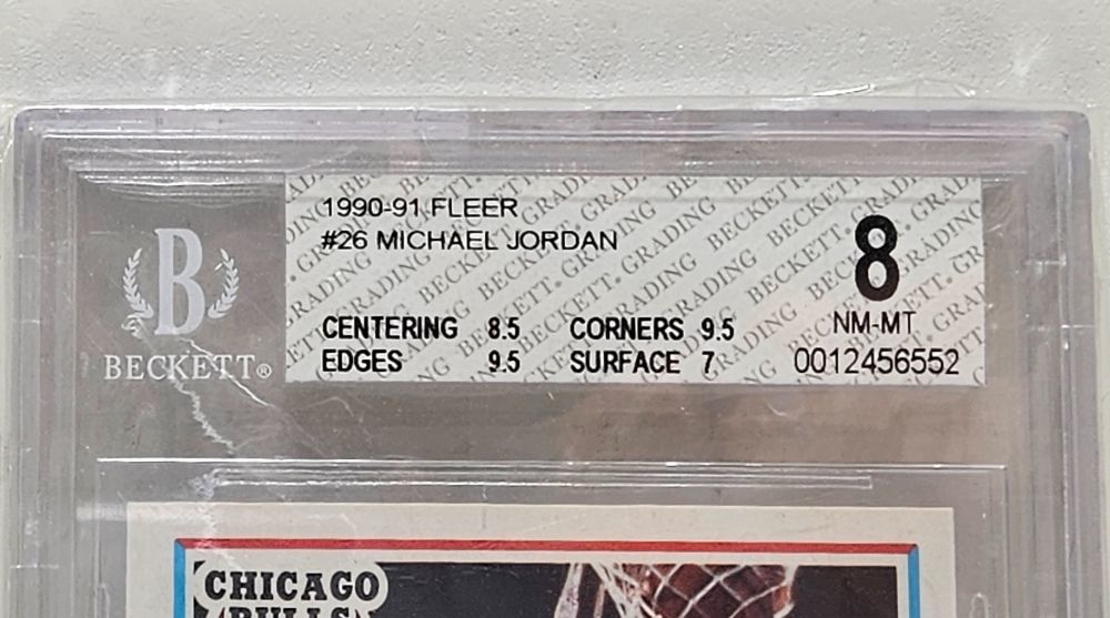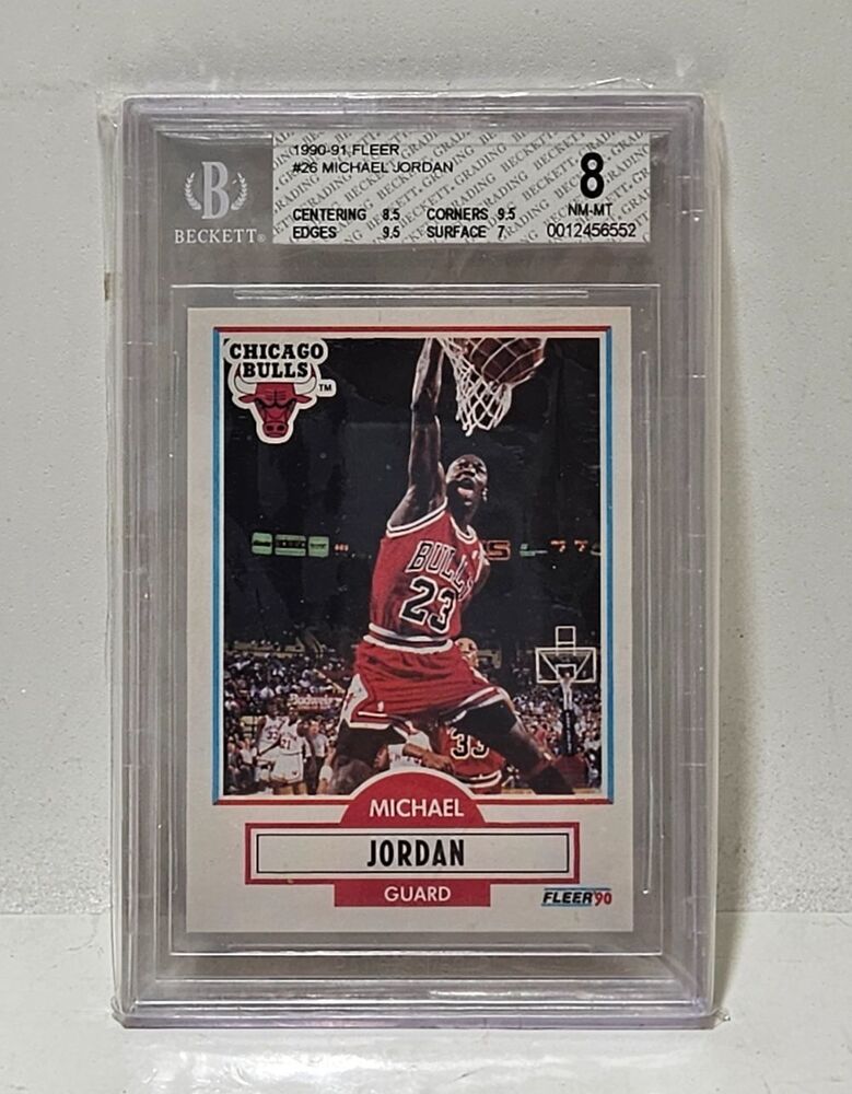 Player: Michael Jordan Team: Chicago Bulls Year: 1990–91 Brand: Fleer Card Number: #26 Grading Company: Beckett Grading Services (BGS) Grade: 8 — Near Mint-Mint Hall of Fame: Inducted 2009
