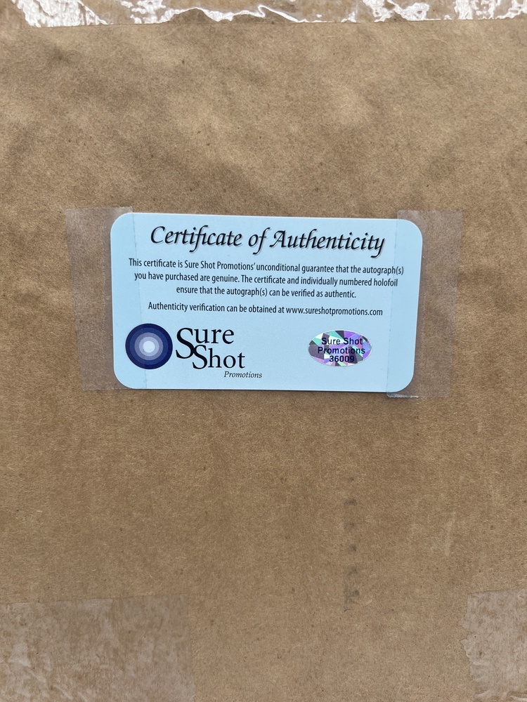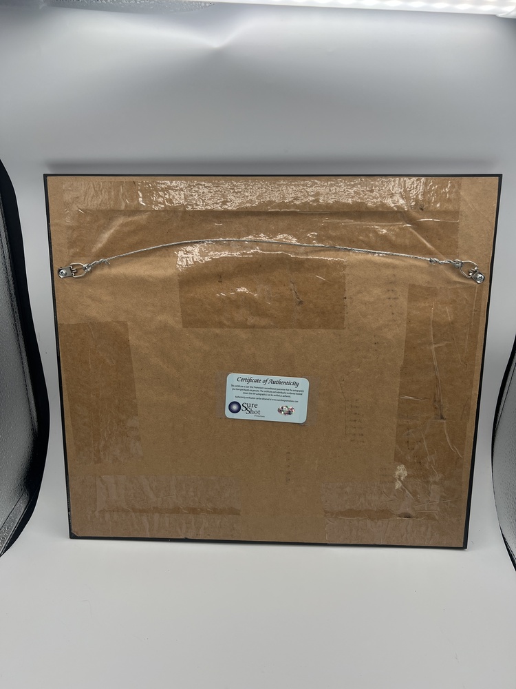 This is a collector's display piece featuring a high-quality wood frame, suede-style matting, and a metal nameplate.