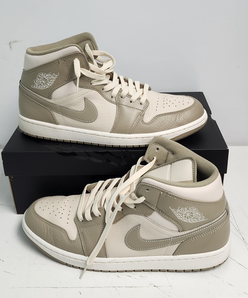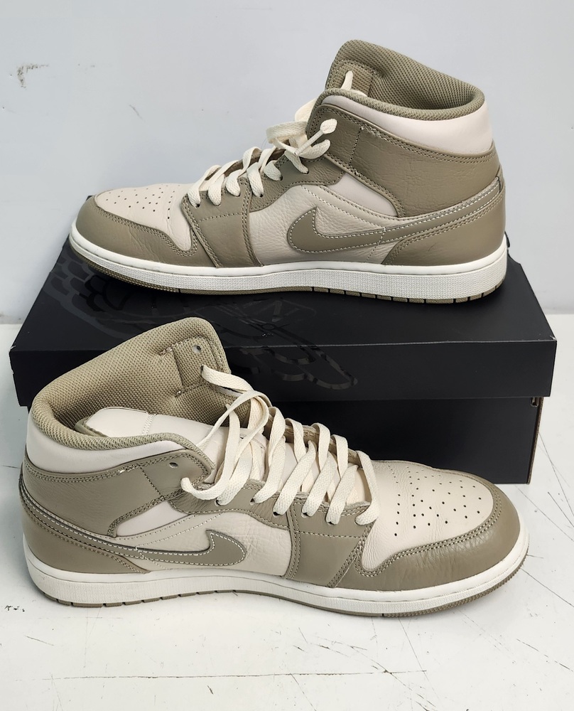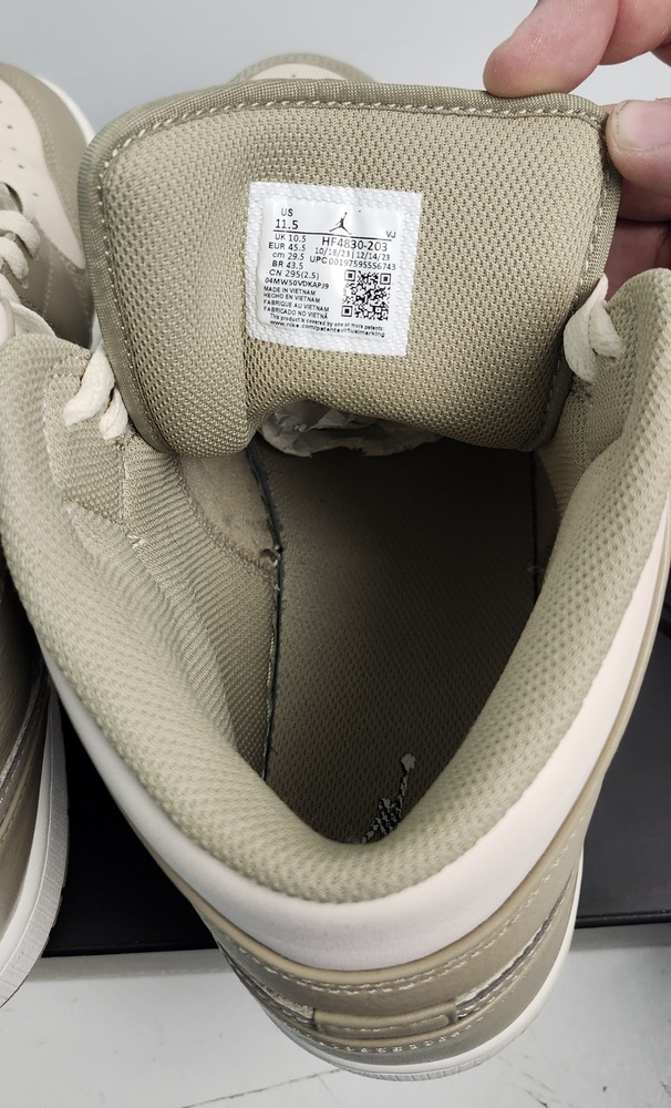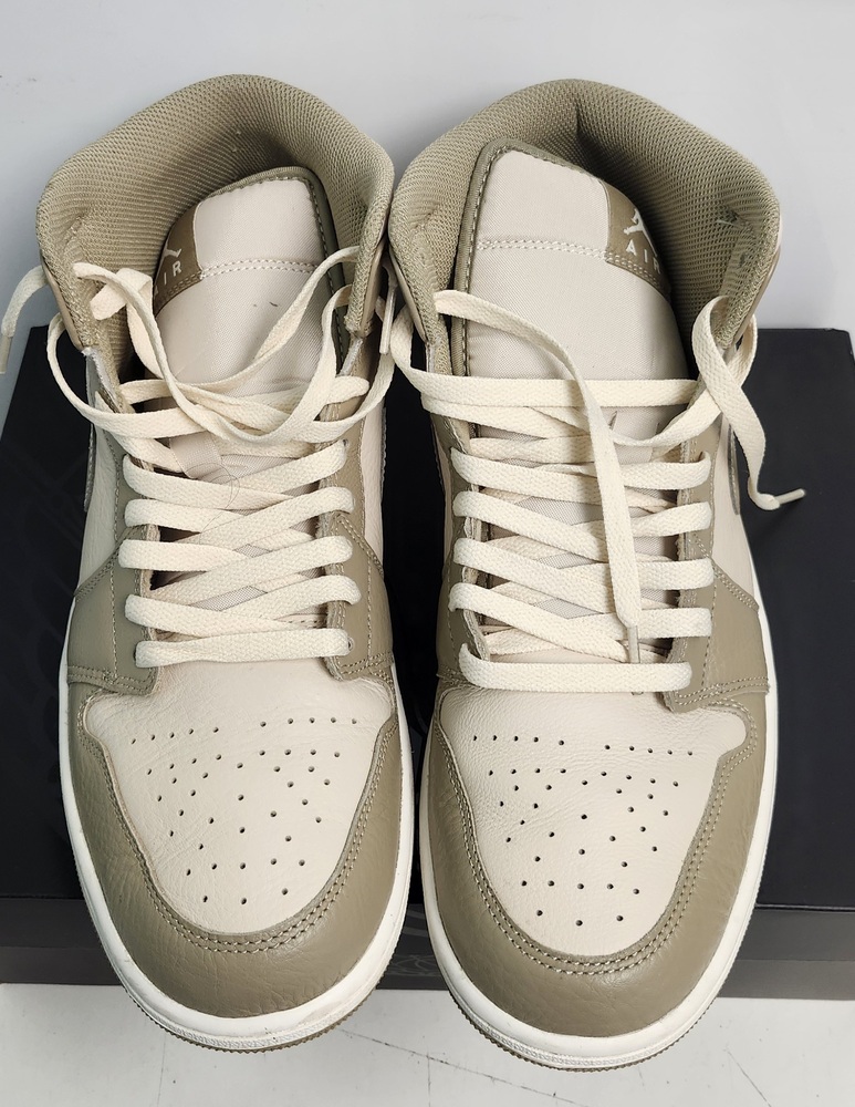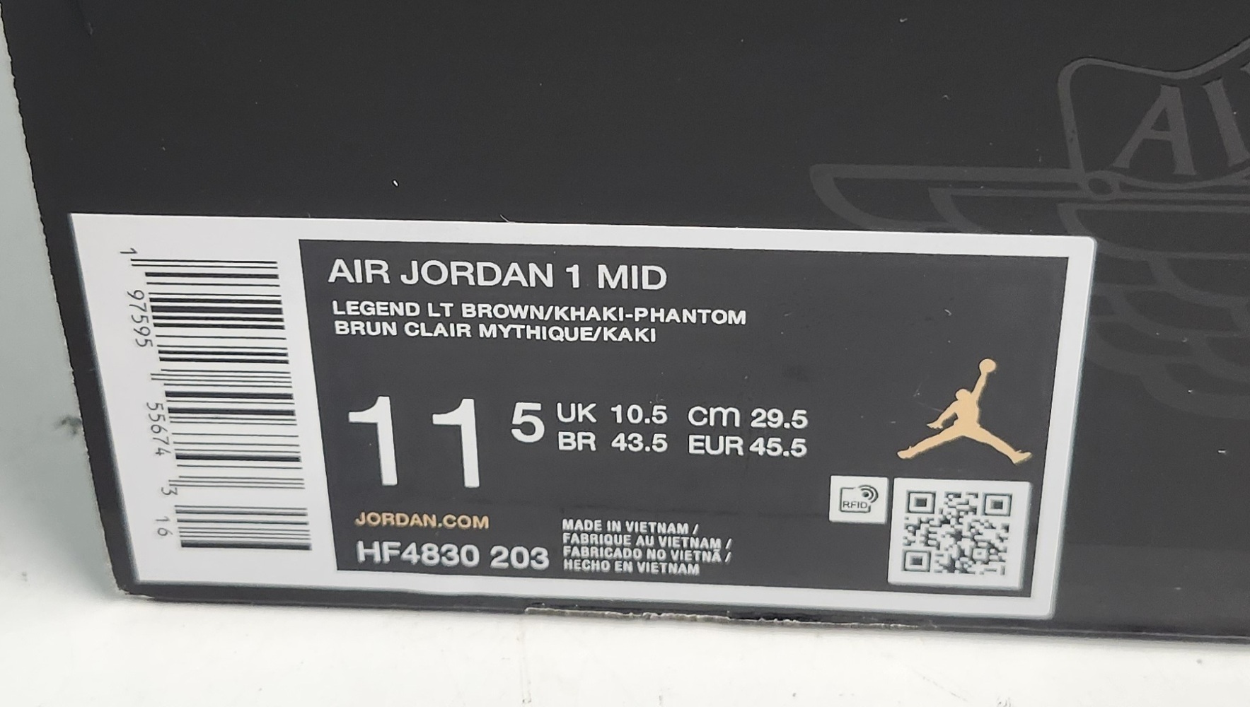 Men’s Air Jordan 1 Mid in the Legend Light Brown / Khaki / Phantom colorway. Style code HF4830-203, size US 11.5. Nice neutral tones, clean presentation, and includes the original box. See photos for exact condition.