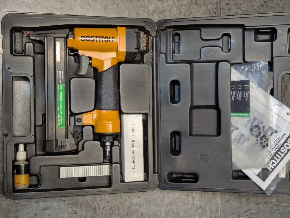 Reliable and built to last, this Bostitch 150SX staple gun is in good used condition and comes with its original box. Known for its solid construction and smooth performance, it's great for upholstery, DIY projects, and professional tasks alike. A dependable tool that’s ready to work.