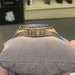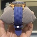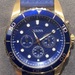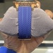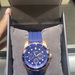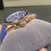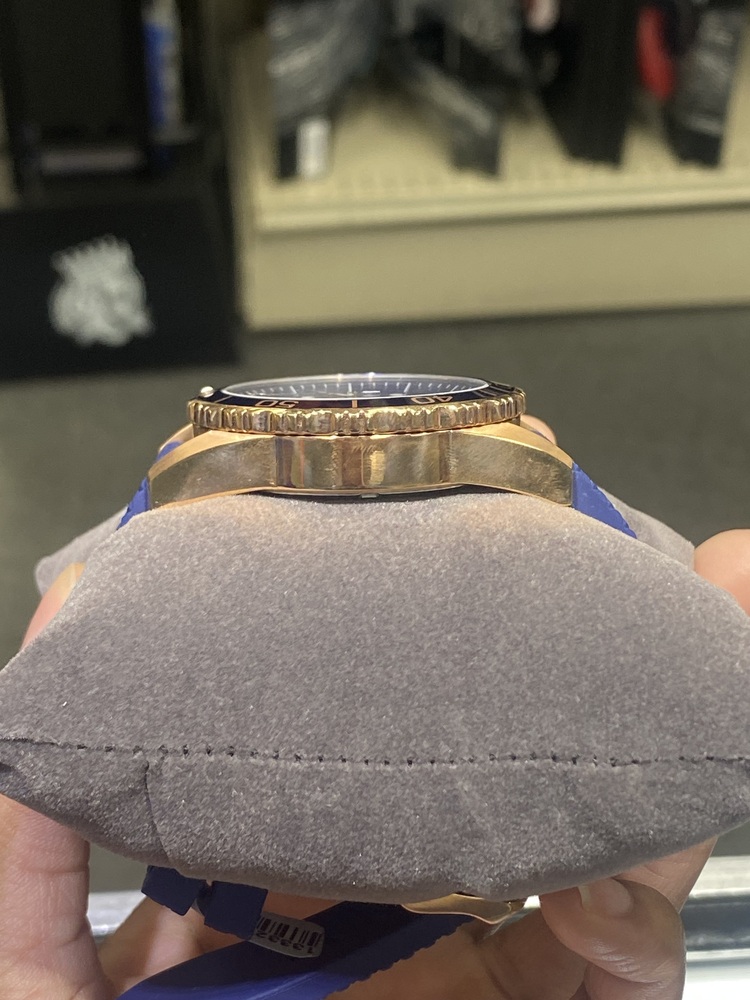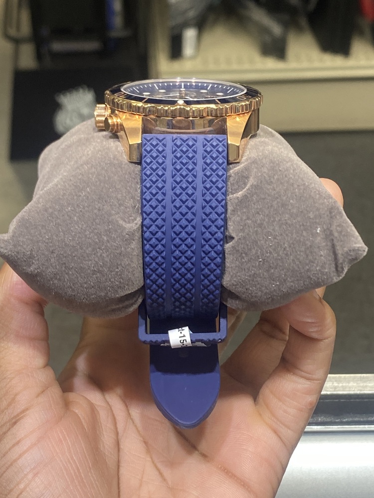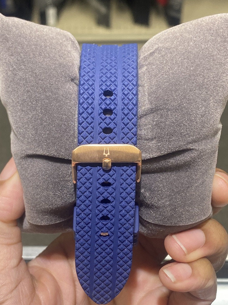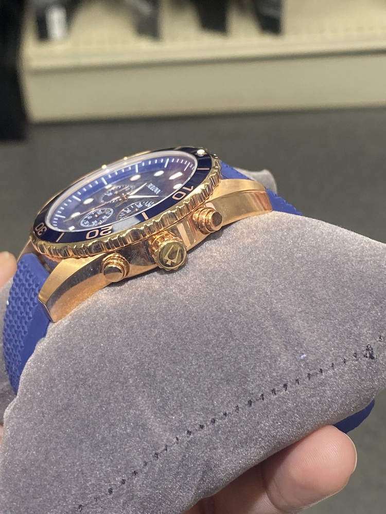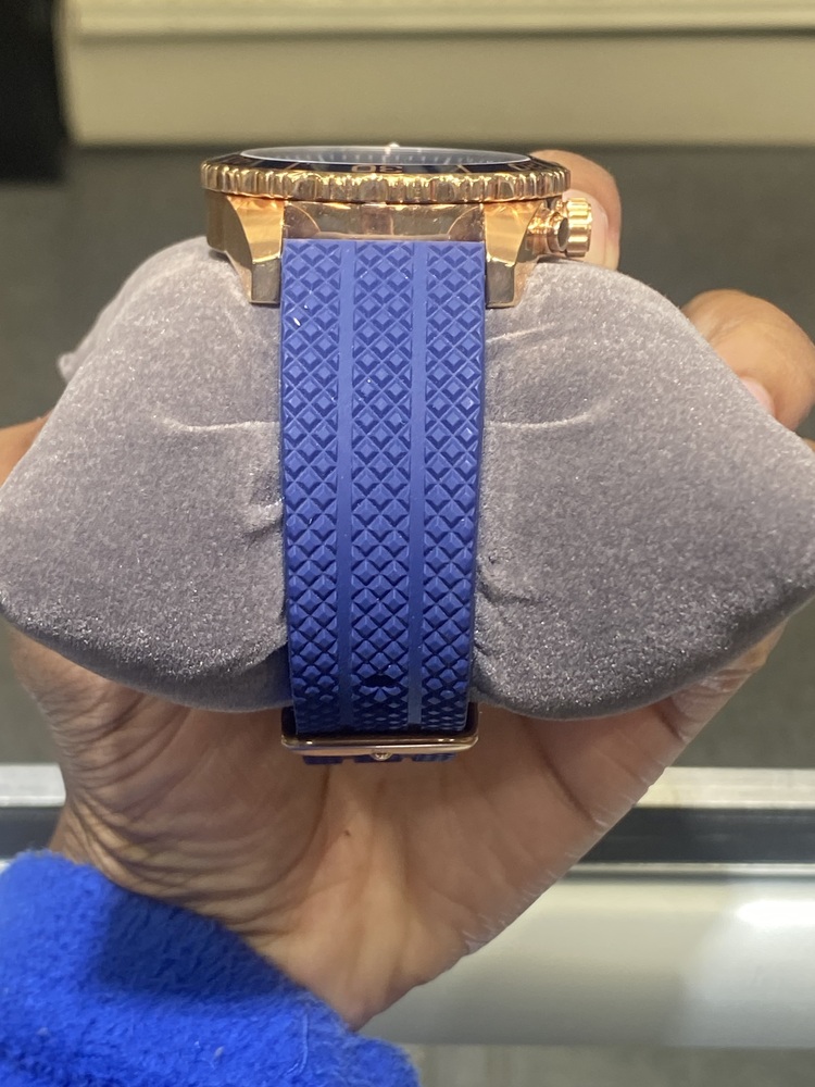 - Case: round rose gold-tone stainless steel; 43mm; blue bezel; mineral crystal