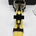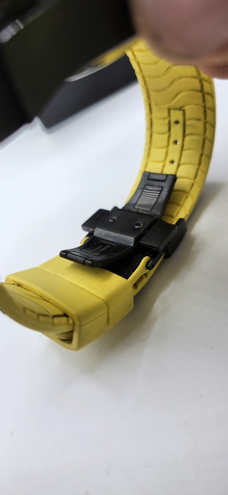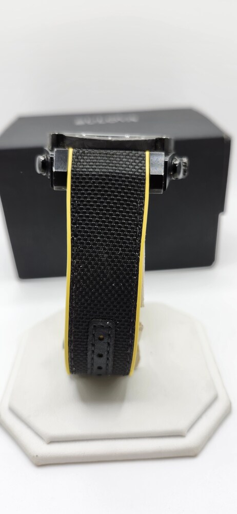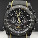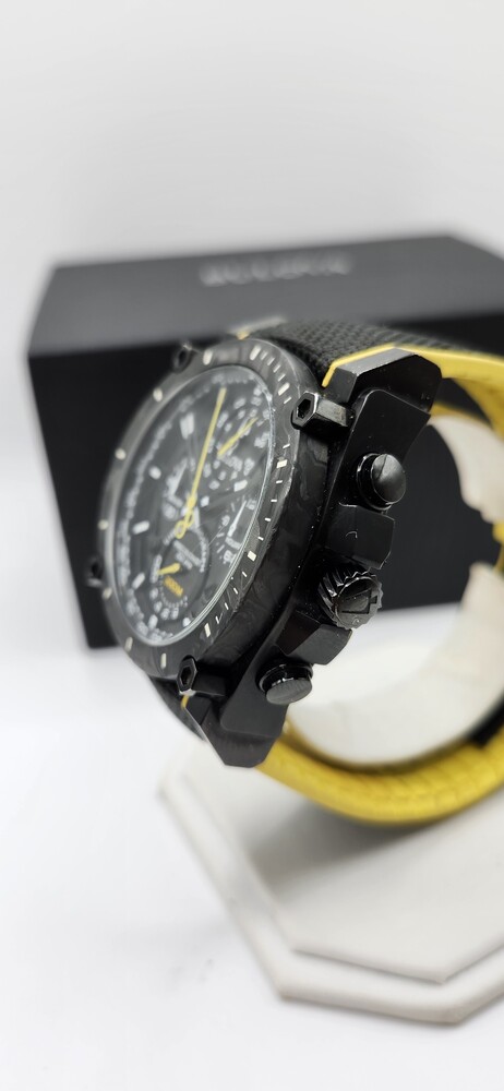 Black ion-plated case with carbon fiber accents and black/yellow strap.
