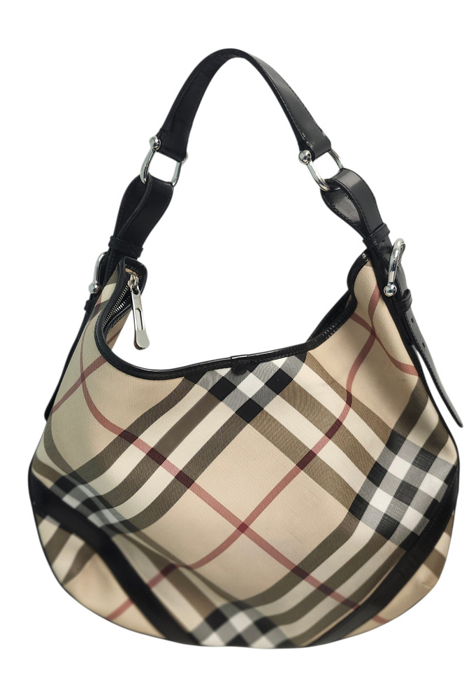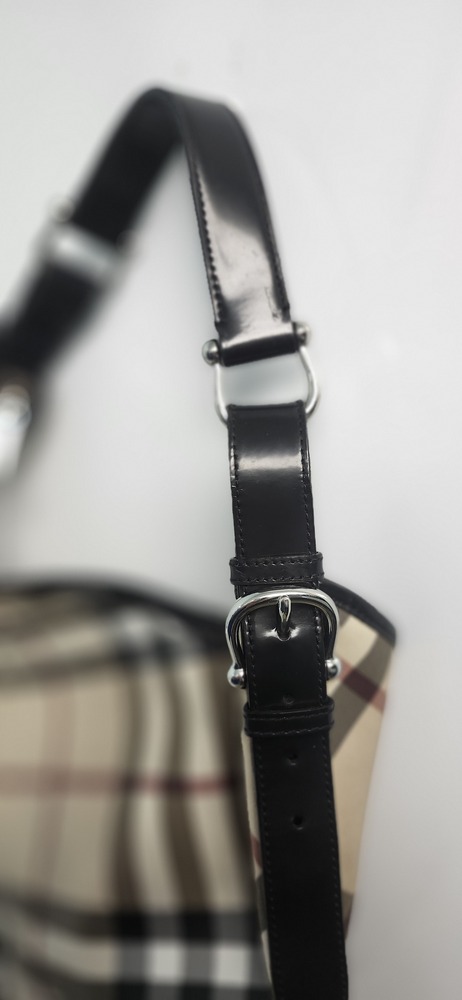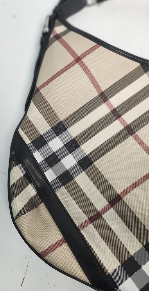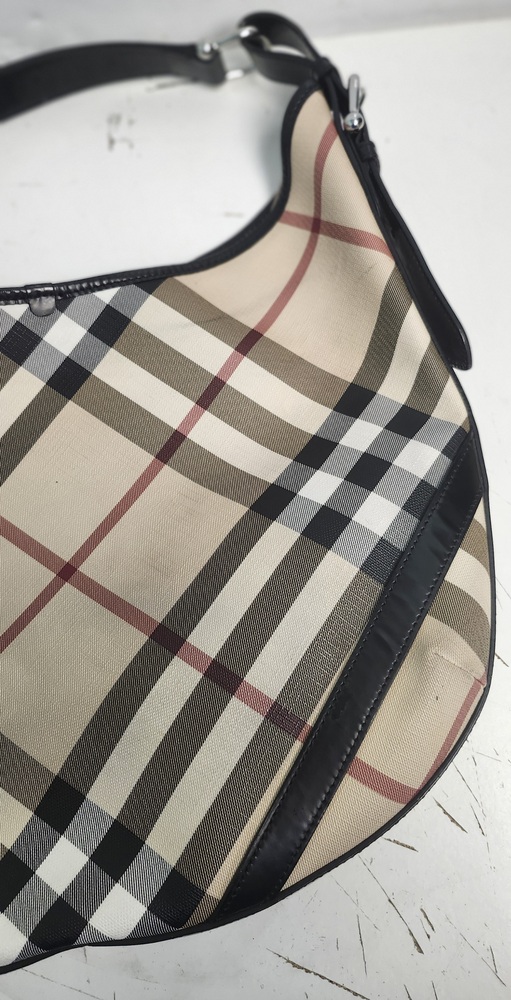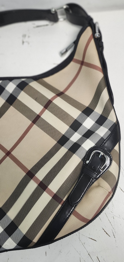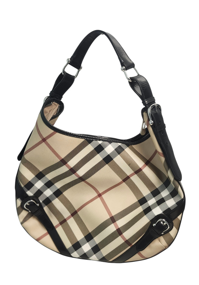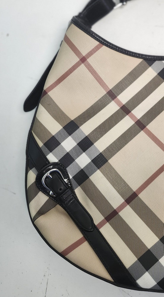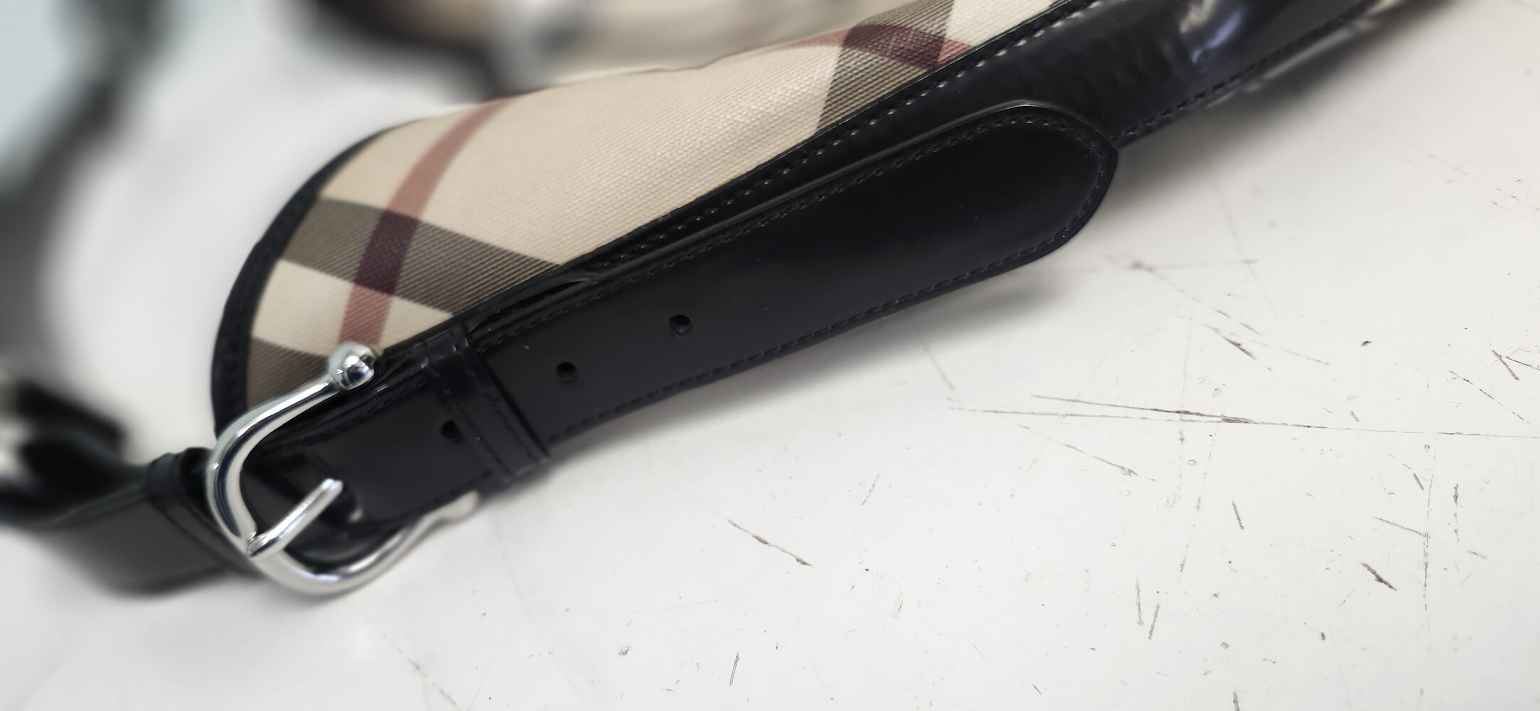 Burberry London Nova Check Hobo Shoulder Bag. Classic beige/black/red Nova Check coated canvas with black patent leather trim and silver-tone hardware. Adjustable shoulder strap with buckle accents. Zip-top closure. Inside has a zip pocket and slip pocket. Comes with the original Burberry London dust bag.