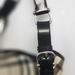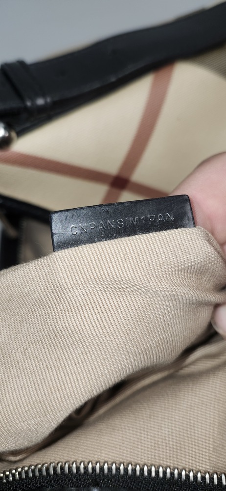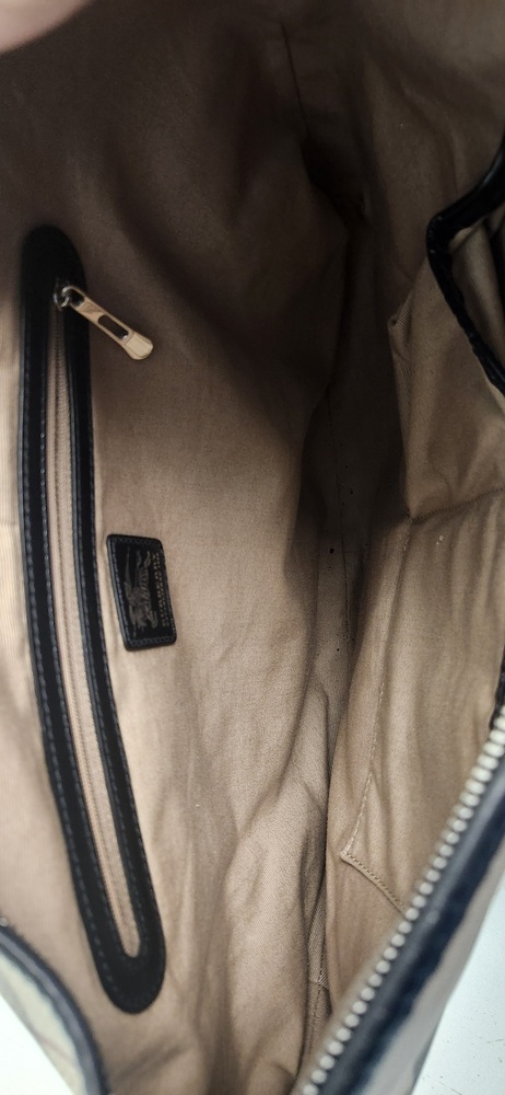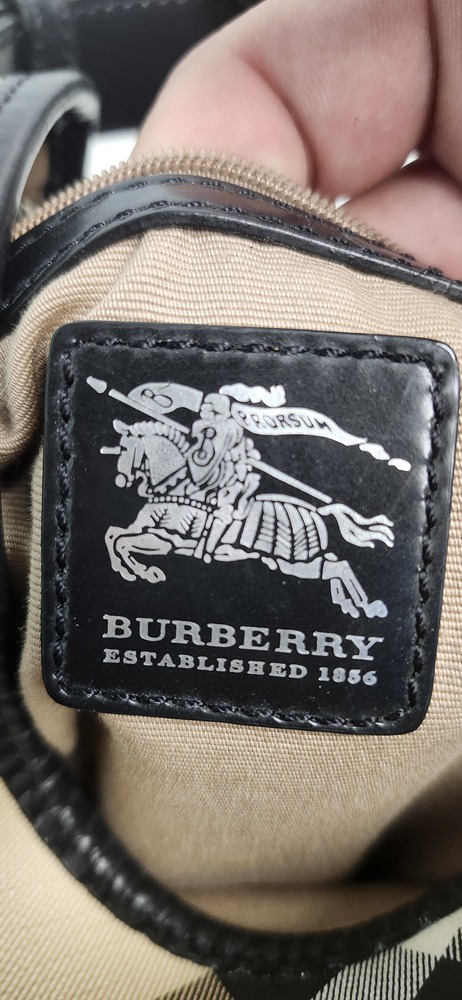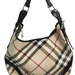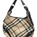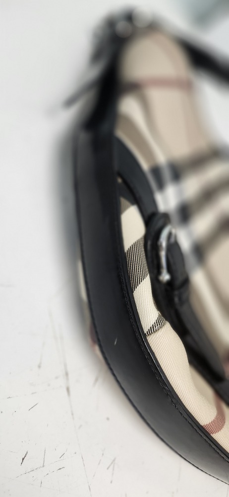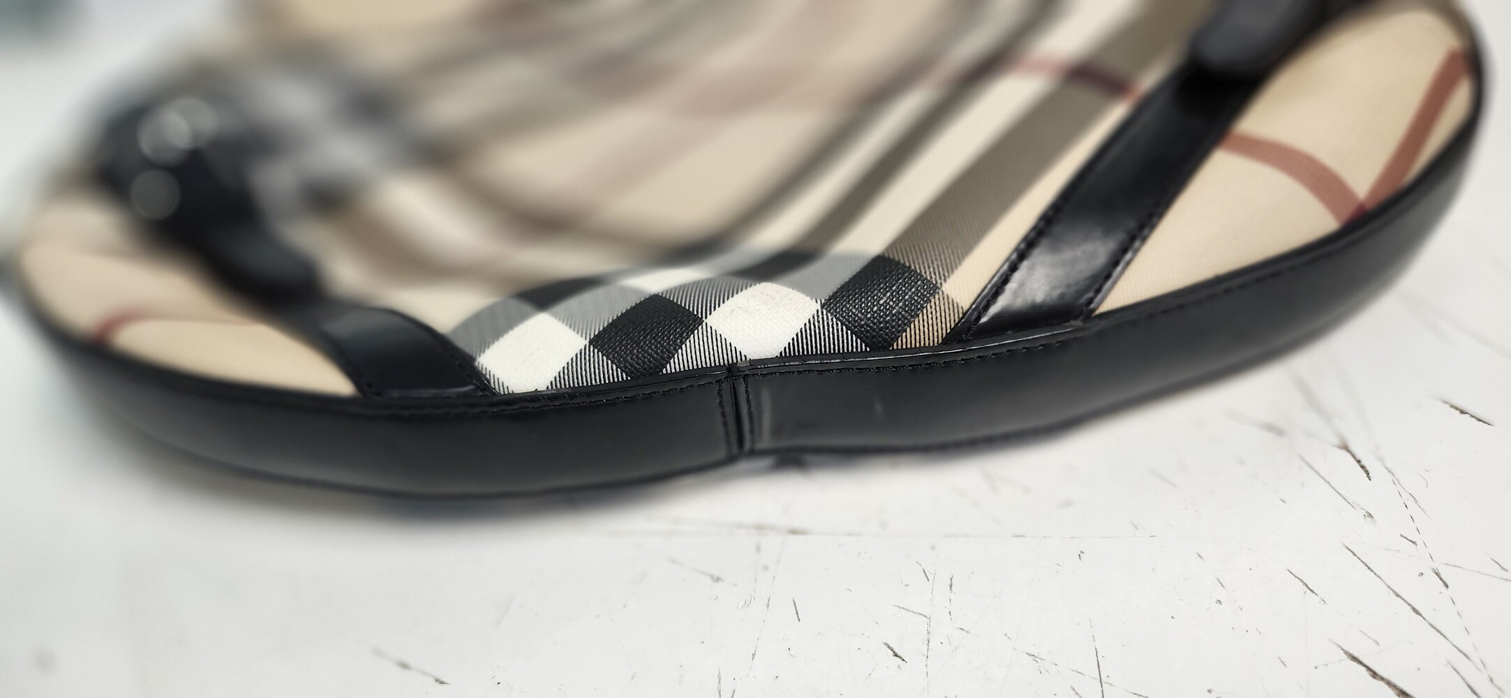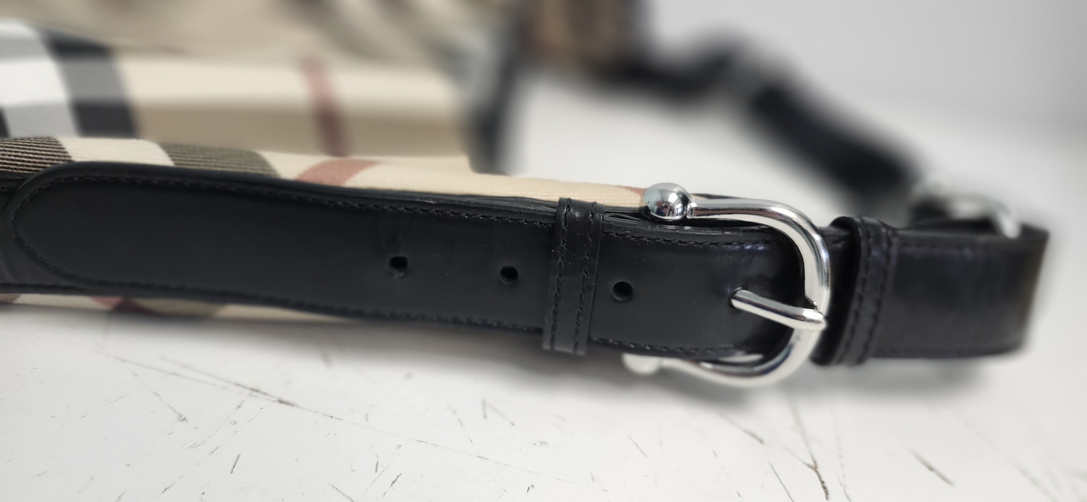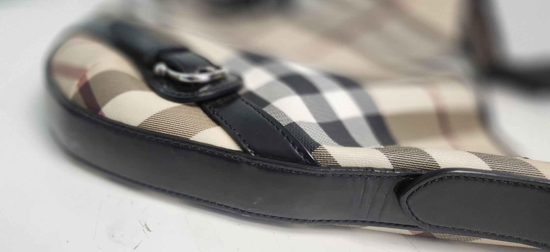 Burberry London Nova Check Hobo Shoulder Bag. Classic beige/black/red Nova Check coated canvas with black patent leather trim and silver-tone hardware. Adjustable shoulder strap with buckle accents. Zip-top closure. Inside has a zip pocket and slip pocket. Comes with the original Burberry London dust bag.