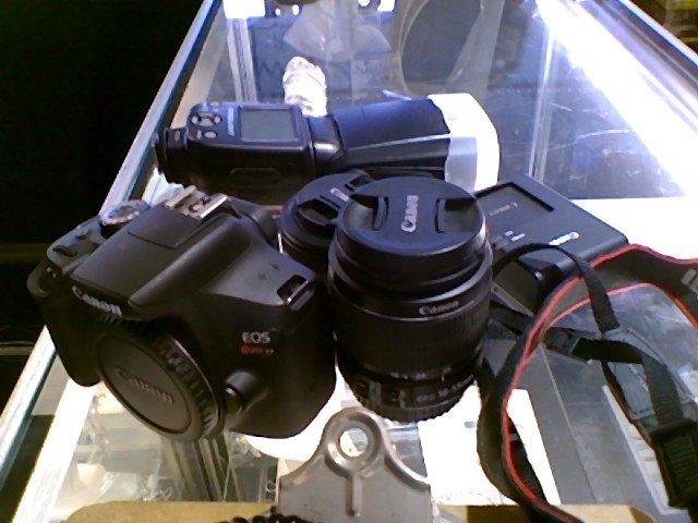 Canon EOS Rebel T7 DSLR in good working condition. Includes 18–55mm zoom lens, 24mm f/2.8 STM lens, external flash, battery charger, and Canon strap. Clean body with normal light wear from use. Great starter or backup DSLR setup.