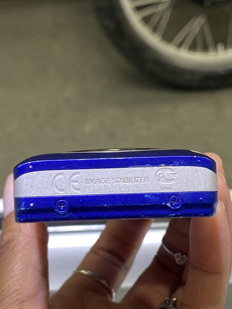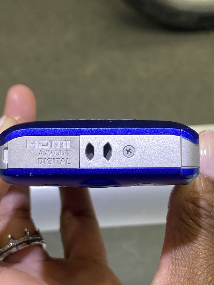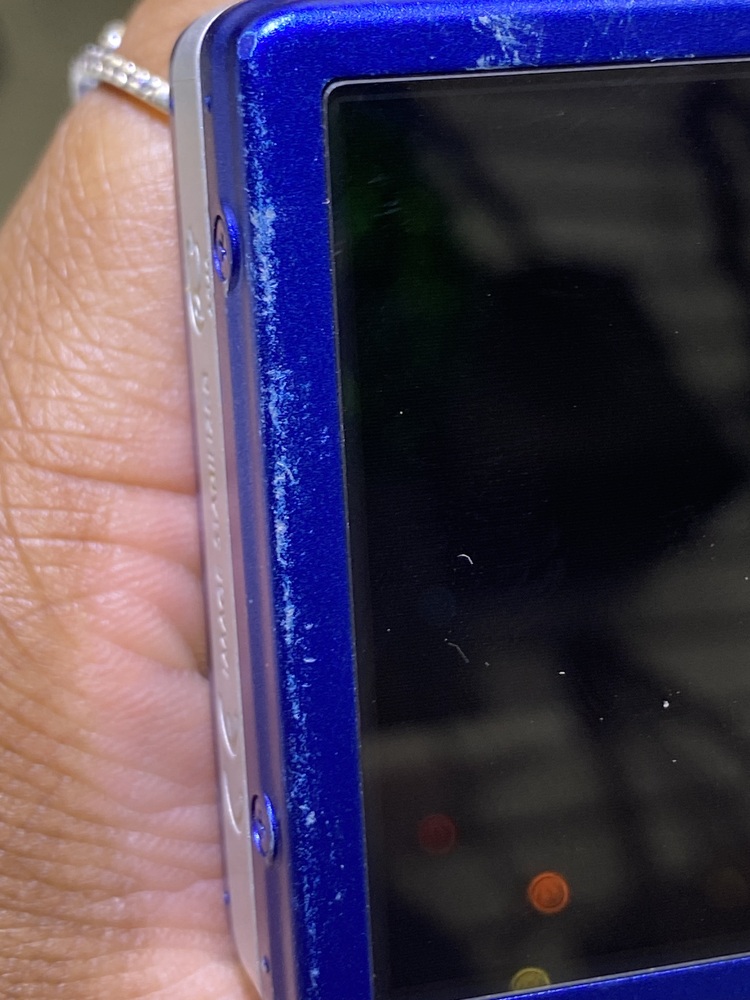 This camera is preowned, works well and is in great condition. There are no scratches on the screen or lens. The paint is dicolored on the side. SEED PICTURES. Comes with Battery, charger and 4GB SD card.