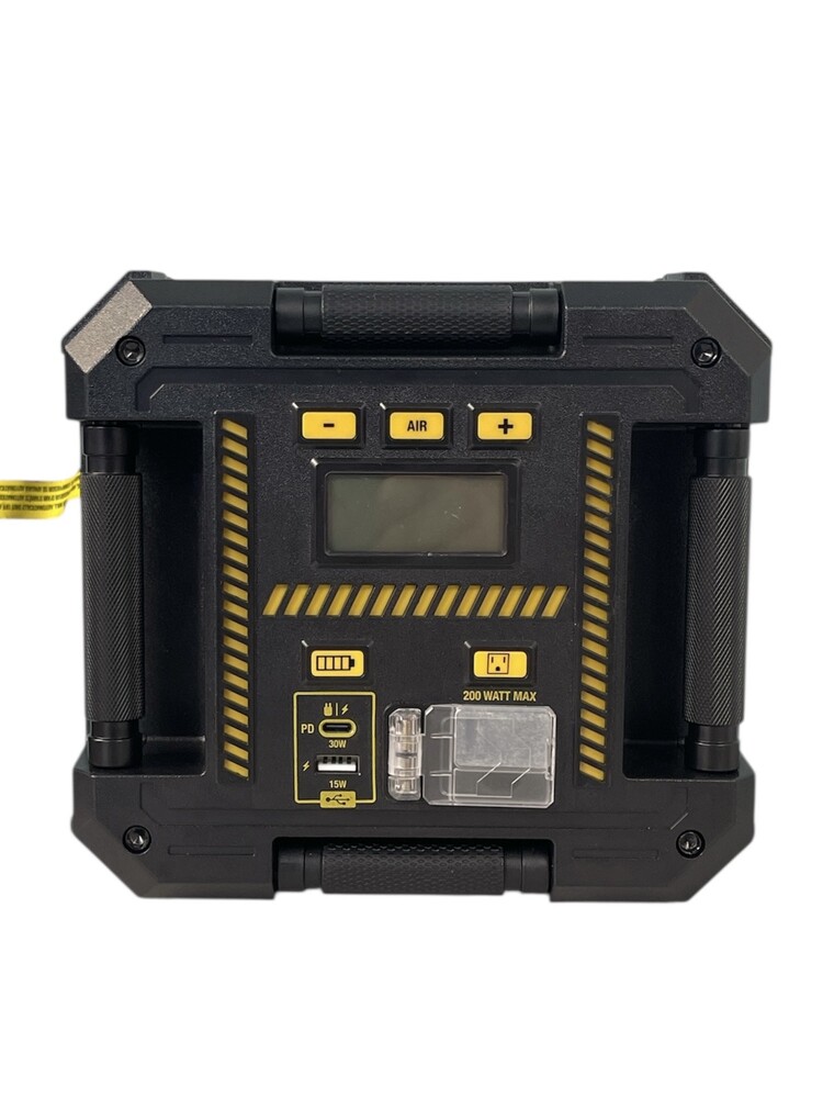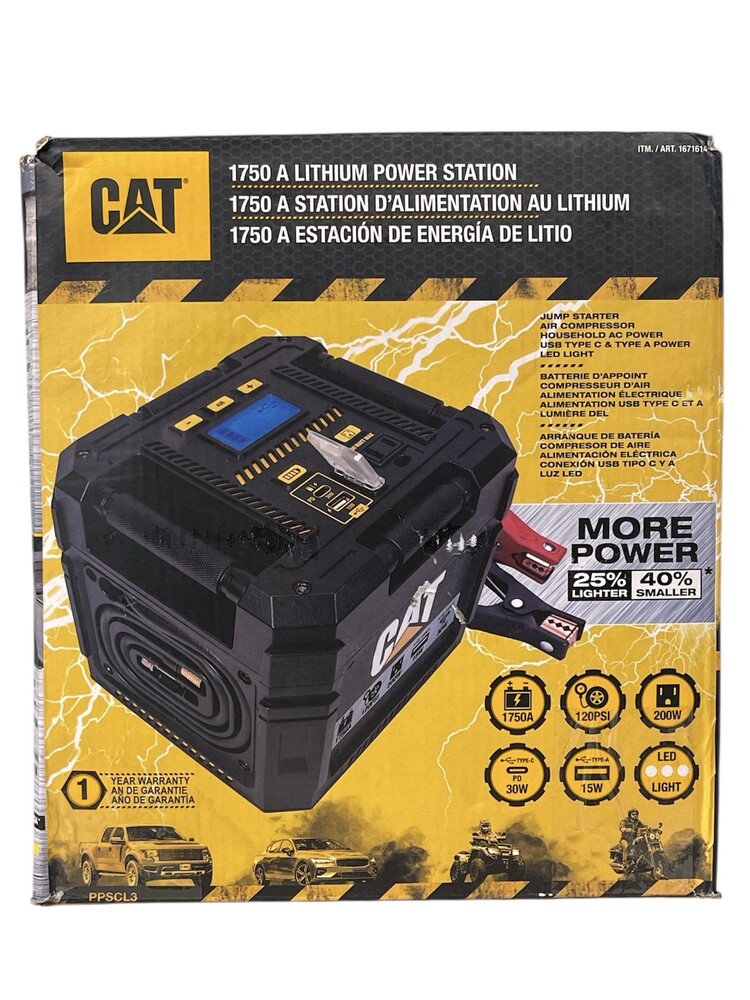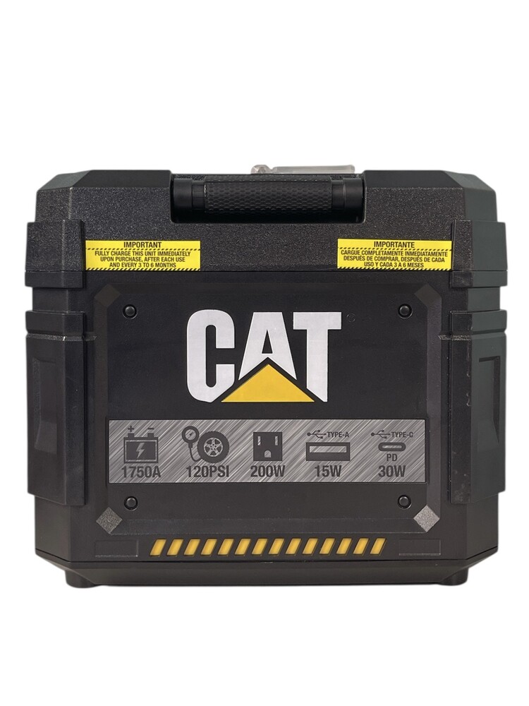CAT Cube Lithium 4-in-1 Portable Jump Starter The CAT PPSCL3 Lithium Power Station is a 4 in 1 solution. 1750 peak amps of starting power instantly jump-starts 12V cars and trucks up to 8 cylinders, powder coated cables are included. 200 Watts of household power lets you keep small appliances, tools and more going on the road or in emergencies. While the dual USB ports keep your tablets, phones, gaming devices and more charged up. The 120PSI air compressor inflates tires or spots equipment (sports needle adapter included.). The Auto Shut Off 10 minute timer to avoid damage from heat, should the compressor be left on unintentionally or unattended.