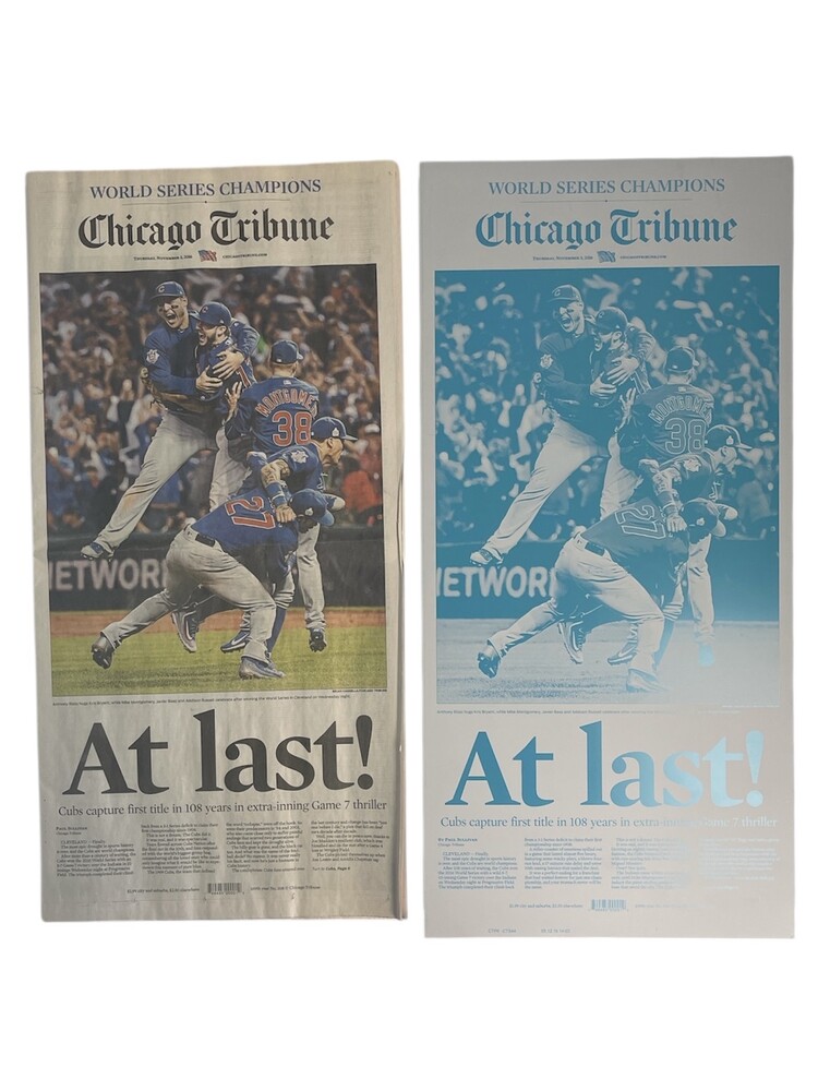 From November 3, 2016, a Chicago Tribune limited edition exclusive. This press plate is a replica of the front cover of the Chicago Tribune following the Chicago's 2016 championship on November 2, 2016.All plates have minor water marks and scratching due to the making of them. Press plates are metal plates used to transfer text and images on a printing line.