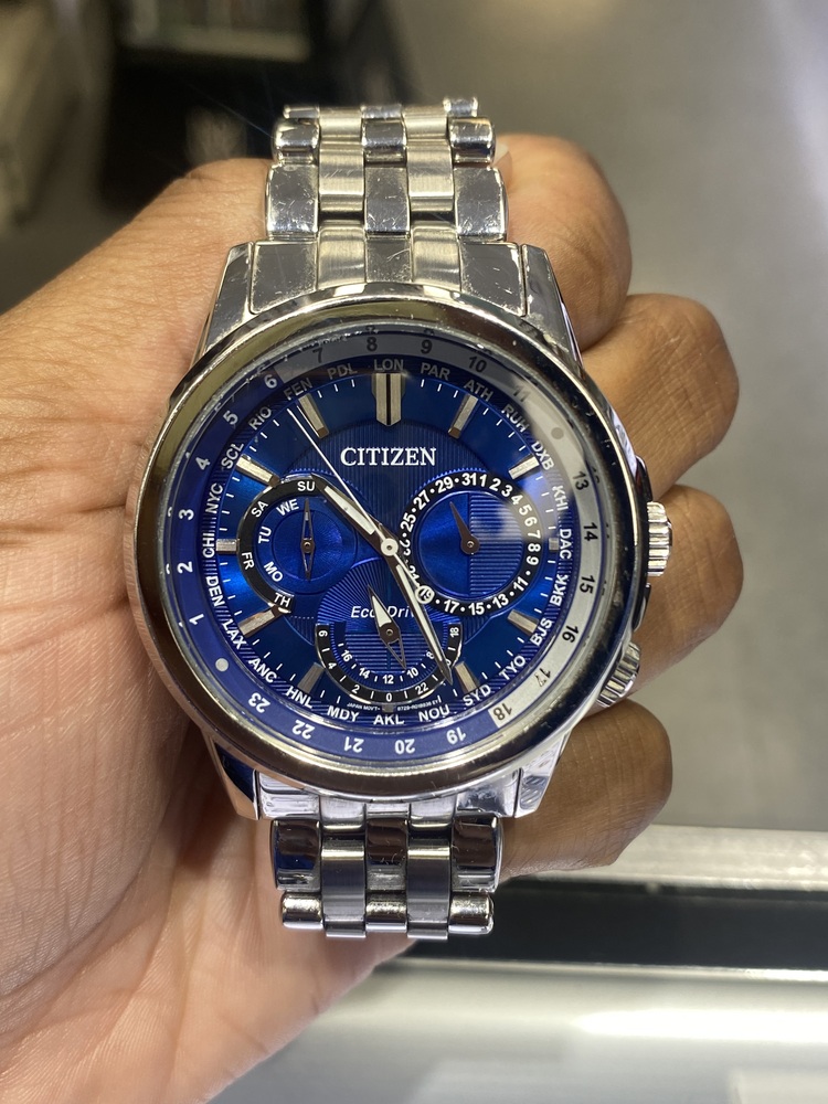 Bring sophistication to your day with the CITIZEN Calendrier. This timeless watch features 12/24-hour time, world time in 24 cities and day/date. Featured with stainless steel case and bracelet with dark blue dial. Featuring our Eco-Drive technology – powered by light, any light. Never needs a battery. Caliber number 8729.