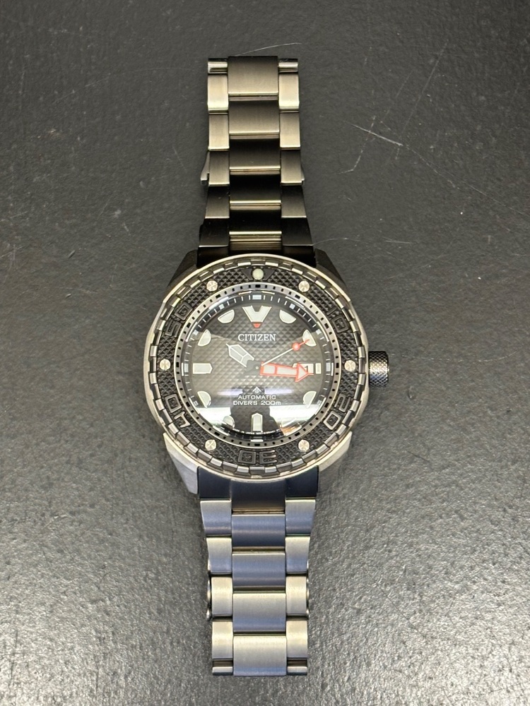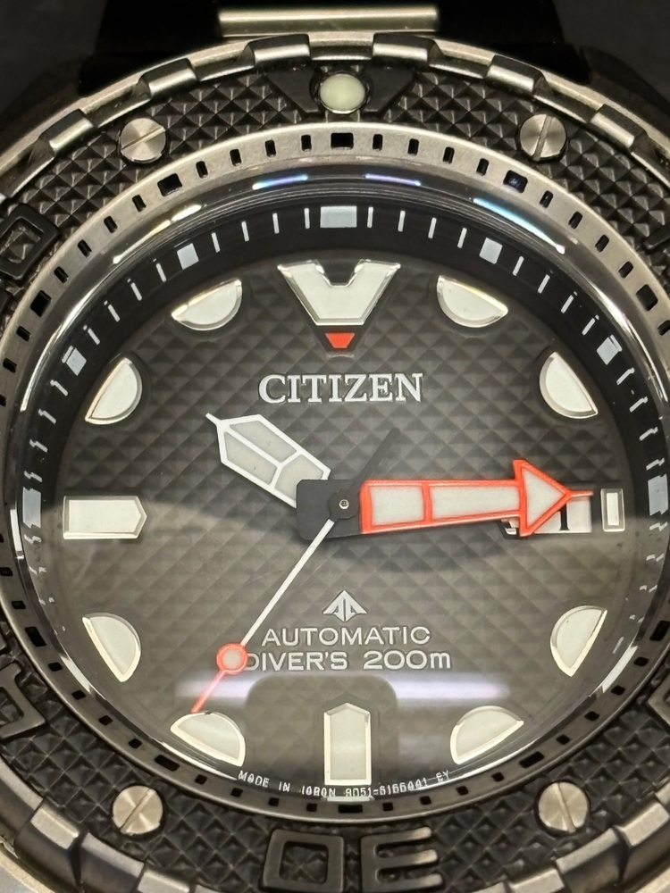 The Citizen Promaster Automatic Diver 200M is built from lightweight yet durable Super Titanium™, combining strength with comfort. Featuring a bold pyramid stud bezel and dial, anti-reflective dual-sphere sapphire crystal, and a striking black dial, this watch delivers both style and performance. Powered by your wrist’s movement, it offers a 42-hour power reserve with luminous hands and markers for clear visibility in the dark or underwater. ISO-compliant and water resistant to 200 metres, it comes in an exclusive collector’s tank box, making it the perfect blend of sport, innovation, and precision.