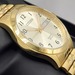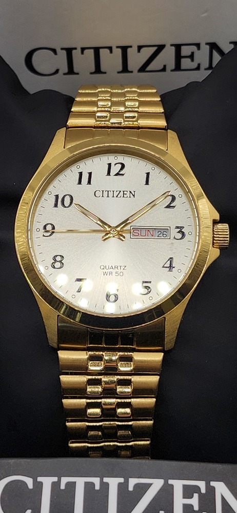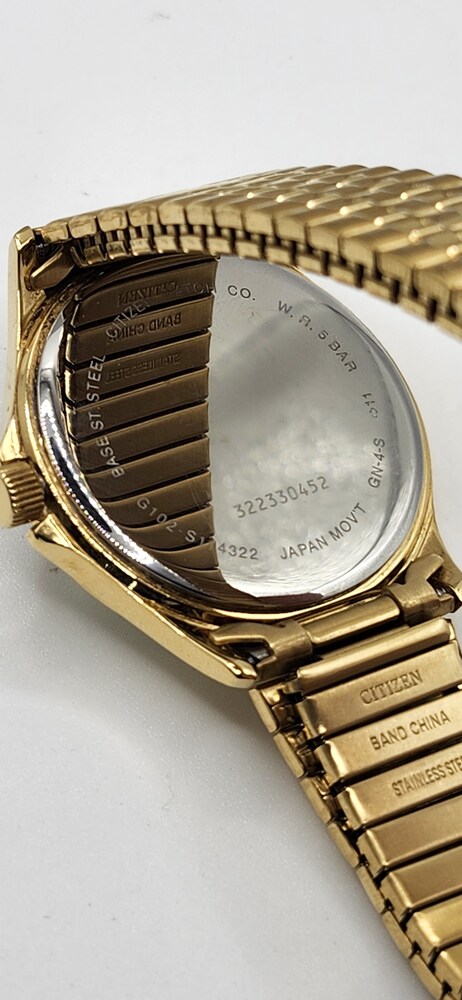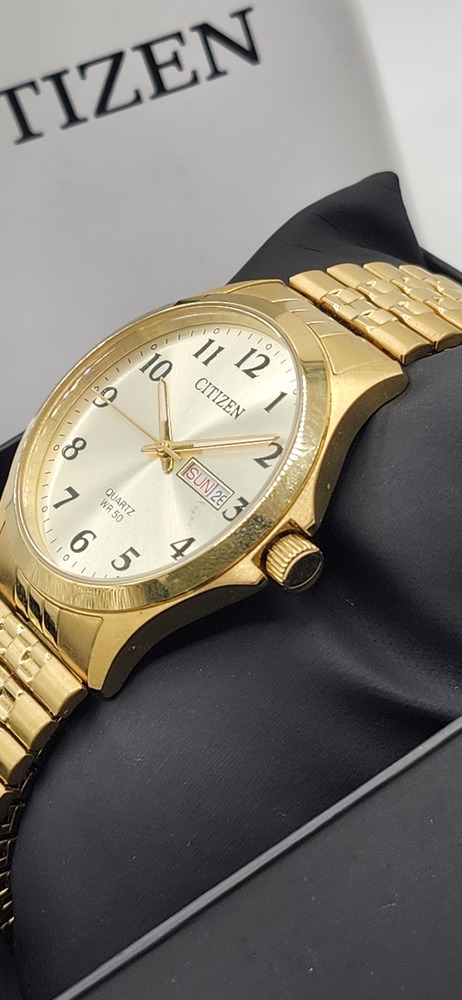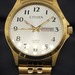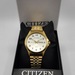 Citizen men’s quartz wristwatch with gold-tone case and band. White dial with black numbers, gold hands, and day/date display. 50M water resistant, Japan movement (model GN-4-S / G102-S14322).