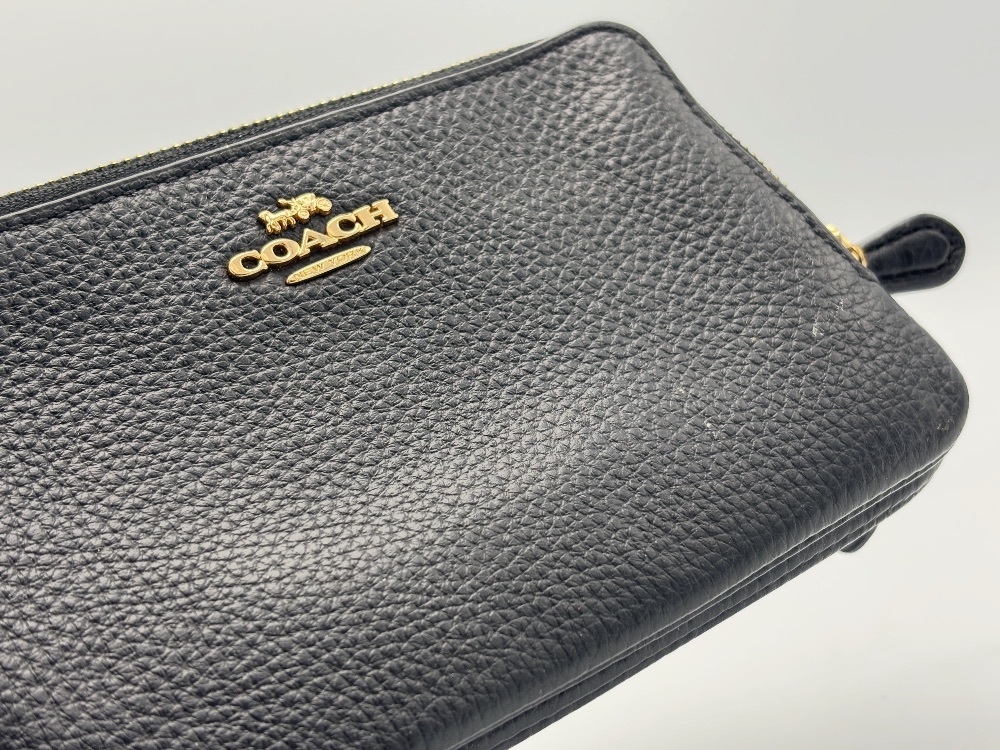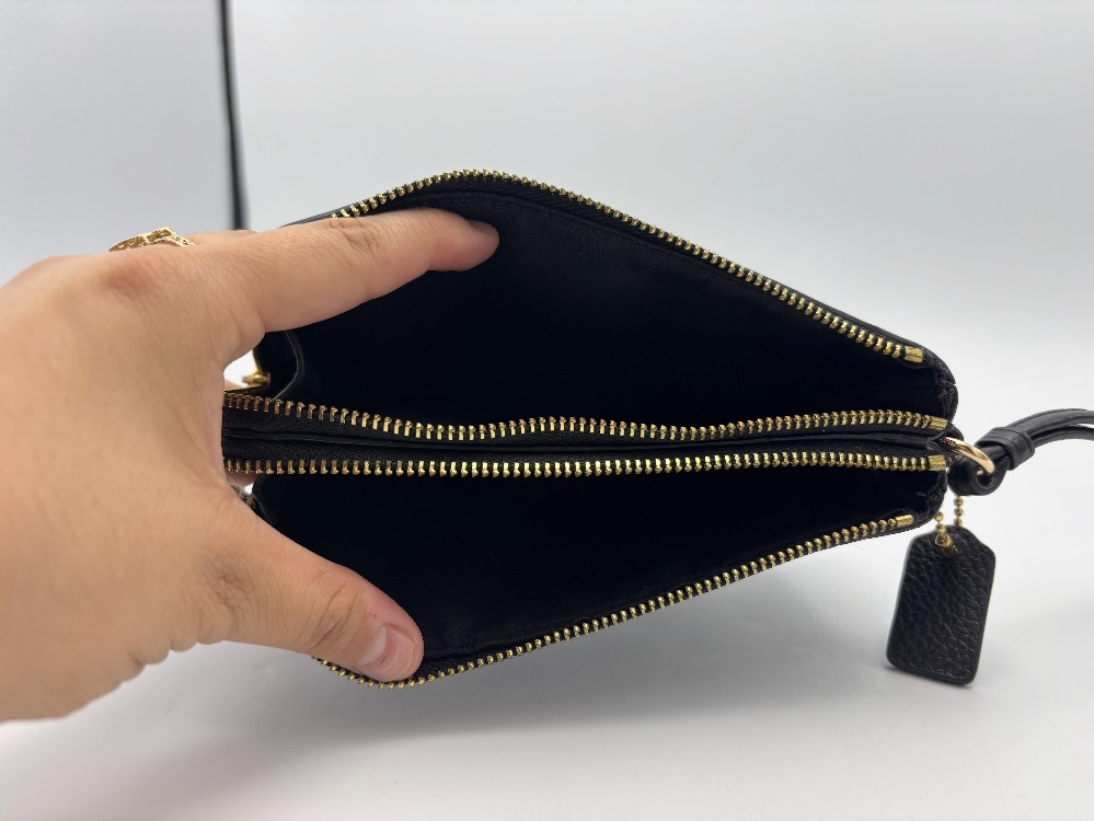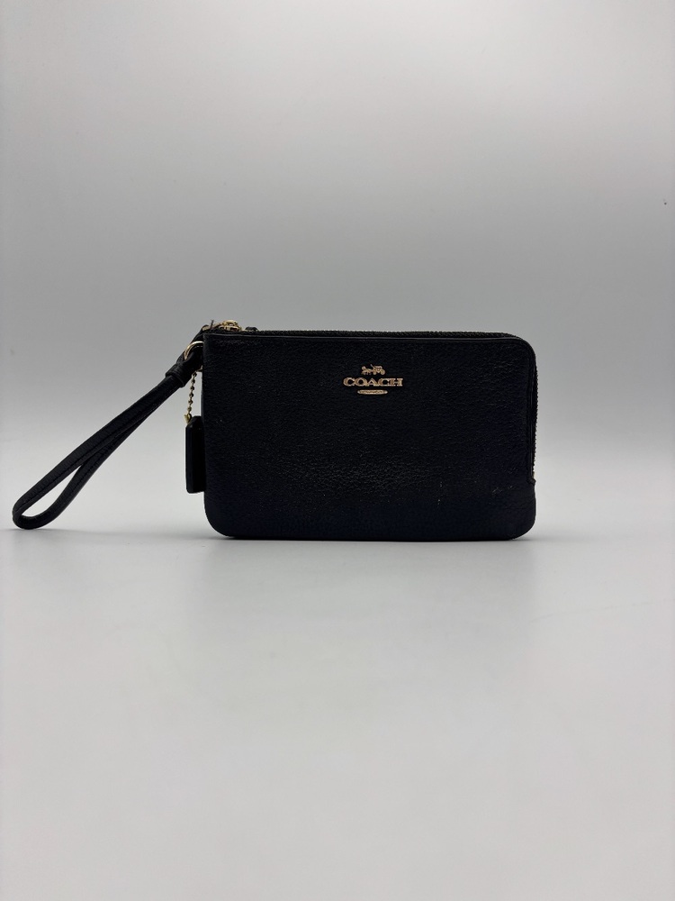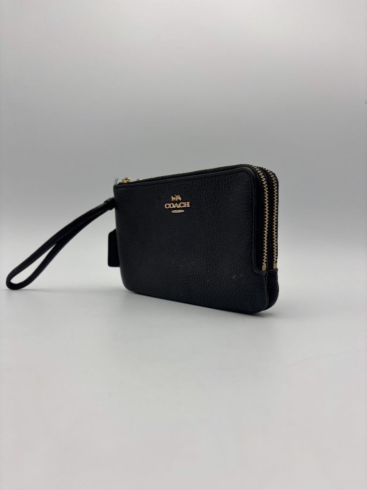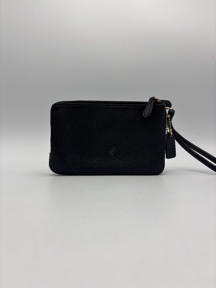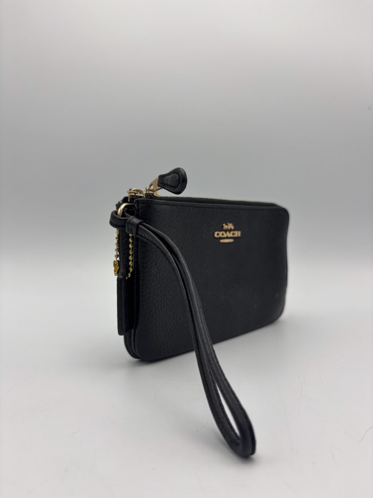 Classic black Coach wristlet clutch in good pre owned condition. Features a wrist strap for easy carrying and multiple compartments for cards, cash, and essentials. Hardware and exterior show light, normal wear with minor marks.