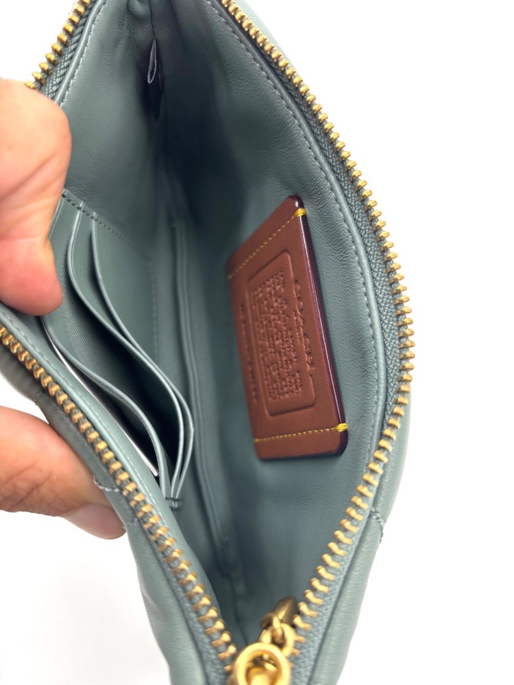 Features: Zip-top closure, three internal credit-card slots, detachable wrist strap + detachable chain strap (29 cm drop)