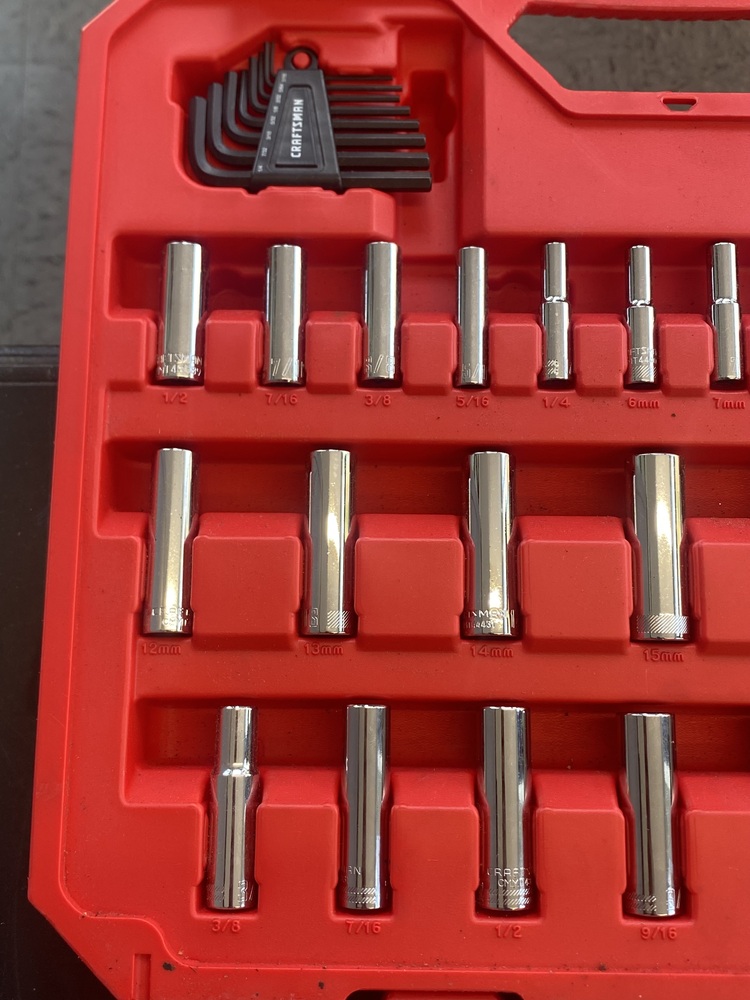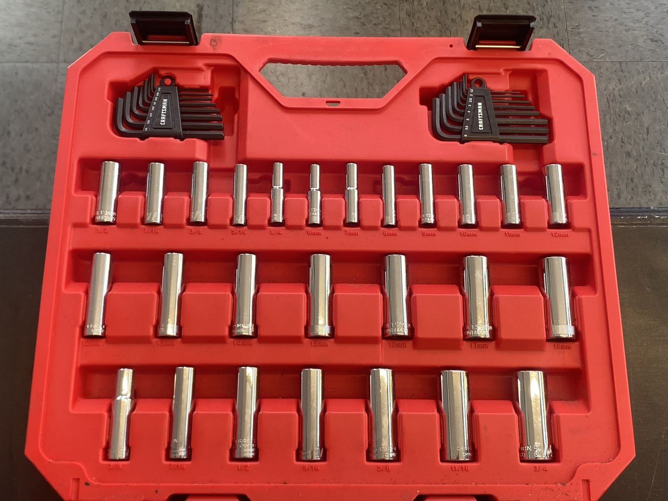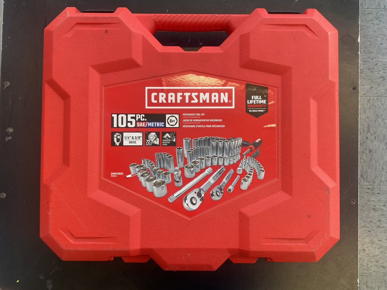 105 pc 1/4-in and 3/8-in Drive Mechanics Tool Set comes equipped with 72 Tooth ratchets, a broad assortment of drive tools, and a rugged blow mold case. This case is constructed with metal hinges for separate sets, and the dimensions are specifically designed to fit into CRAFTSMAN metal storage boxes for easy organization. 105 pc set includes (10) 1/4-in Drive Shallow 6 PT Sockets SAE (5/32, 3/16,7/32, 1/4, 9/32, 5/16, 11/32, 3/8, 7/16, 1/2-in), (9) 1/4-in Drive Shallow 6 PT Sockets Metric (4, 5, 6, 7, 8, 9, 10, 11, 12mm), (5) 1/4-in Drive Deep 6 PT Sockets SAE (1/4, 5/16, 3/8 , 7/16, 1/2-in), (7) 1/4-in Drive Deep 6 PT Sockets Metric (6, 7, 8, 9, 10, 11, 12mm), (11) 3/8-in Drive Shallow 6 PT Sockets SAE (1/4, 5/16, 3/8, 7/16, 1/2, 9/16, 5/8, 11/16, 3/4, 13/16, 7/8-in), (14) 3/8-in Drive Shallow 6 PT Sockets Metric (8, 9, 10, 11, 12, 13, 14, 15, 16, 17, 18, 19, 21, 22mm), (7) 3/8-in Drive Deep 6 PT Sockets SAE (3/8, 7/16, 1/2, 9/16, 5/8, 11/16, 3/4-in), (7) 3/8-in Drive Deep 6 PT Sockets Metric (12, 13, 14, 15, 16, 17, 18mm), (1) 1/4-in Drive Ext Bar (3-in), (1) 3/8-in Drive Ext Bar (6-in), (2) 3/8-in Drive Spark Plug Sockets (5/8-in and 13/16-in), (1) 1/4-in Drive Bit Driver, (16) Short Arm Hex Keys, (1) 1/4-in Drive Ratchet, (1) 3/8-in Drive Ratchet, (1) 3/8-in Drive Size Adapter (1/4-in), (1) 3/8-in Drive Universal Joint and (10) Specialty Bits.