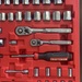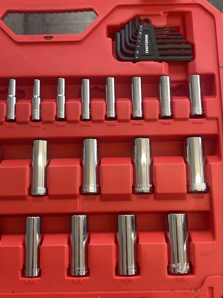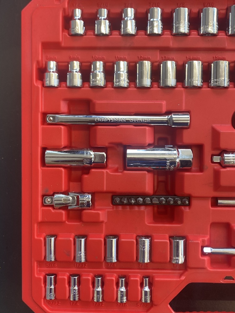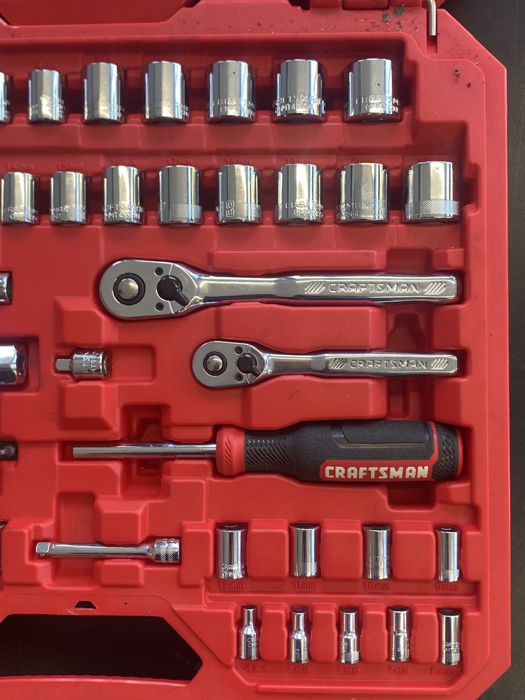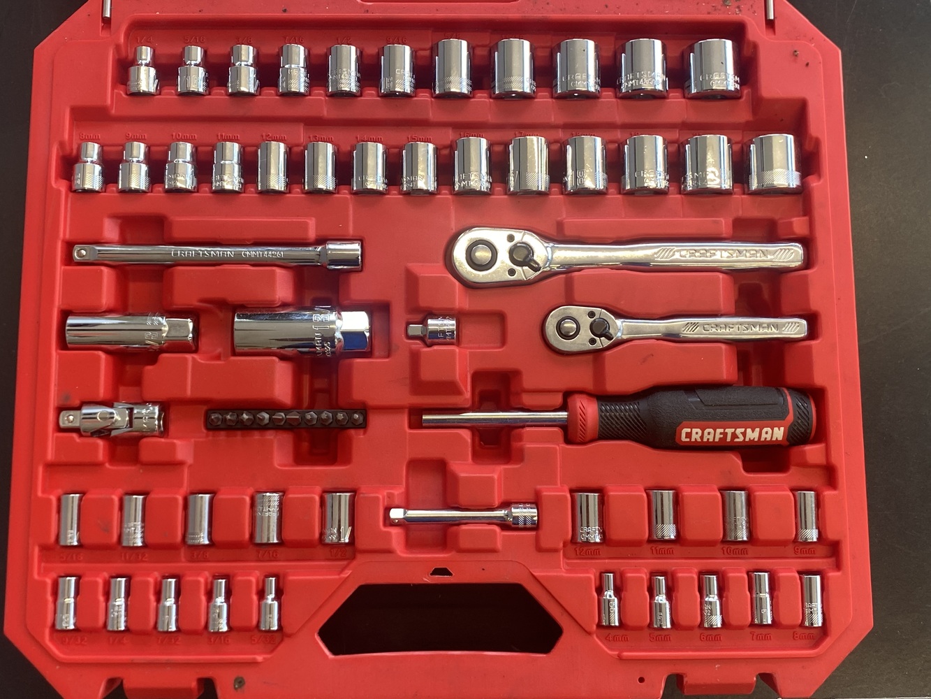 105 pc 1/4-in and 3/8-in Drive Mechanics Tool Set comes equipped with 72 Tooth ratchets, a broad assortment of drive tools, and a rugged blow mold case. This case is constructed with metal hinges for separate sets, and the dimensions are specifically designed to fit into CRAFTSMAN metal storage boxes for easy organization. 105 pc set includes (10) 1/4-in Drive Shallow 6 PT Sockets SAE (5/32, 3/16,7/32, 1/4, 9/32, 5/16, 11/32, 3/8, 7/16, 1/2-in), (9) 1/4-in Drive Shallow 6 PT Sockets Metric (4, 5, 6, 7, 8, 9, 10, 11, 12mm), (5) 1/4-in Drive Deep 6 PT Sockets SAE (1/4, 5/16, 3/8 , 7/16, 1/2-in), (7) 1/4-in Drive Deep 6 PT Sockets Metric (6, 7, 8, 9, 10, 11, 12mm), (11) 3/8-in Drive Shallow 6 PT Sockets SAE (1/4, 5/16, 3/8, 7/16, 1/2, 9/16, 5/8, 11/16, 3/4, 13/16, 7/8-in), (14) 3/8-in Drive Shallow 6 PT Sockets Metric (8, 9, 10, 11, 12, 13, 14, 15, 16, 17, 18, 19, 21, 22mm), (7) 3/8-in Drive Deep 6 PT Sockets SAE (3/8, 7/16, 1/2, 9/16, 5/8, 11/16, 3/4-in), (7) 3/8-in Drive Deep 6 PT Sockets Metric (12, 13, 14, 15, 16, 17, 18mm), (1) 1/4-in Drive Ext Bar (3-in), (1) 3/8-in Drive Ext Bar (6-in), (2) 3/8-in Drive Spark Plug Sockets (5/8-in and 13/16-in), (1) 1/4-in Drive Bit Driver, (16) Short Arm Hex Keys, (1) 1/4-in Drive Ratchet, (1) 3/8-in Drive Ratchet, (1) 3/8-in Drive Size Adapter (1/4-in), (1) 3/8-in Drive Universal Joint and (10) Specialty Bits.