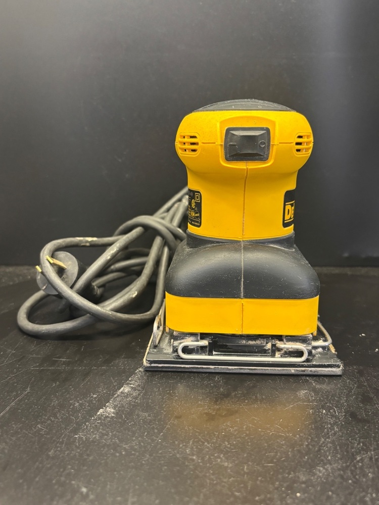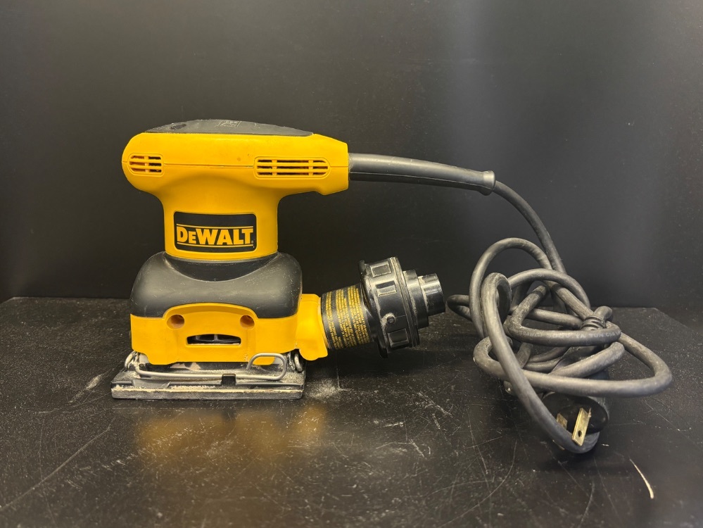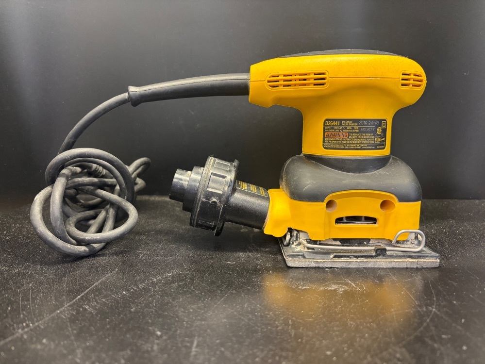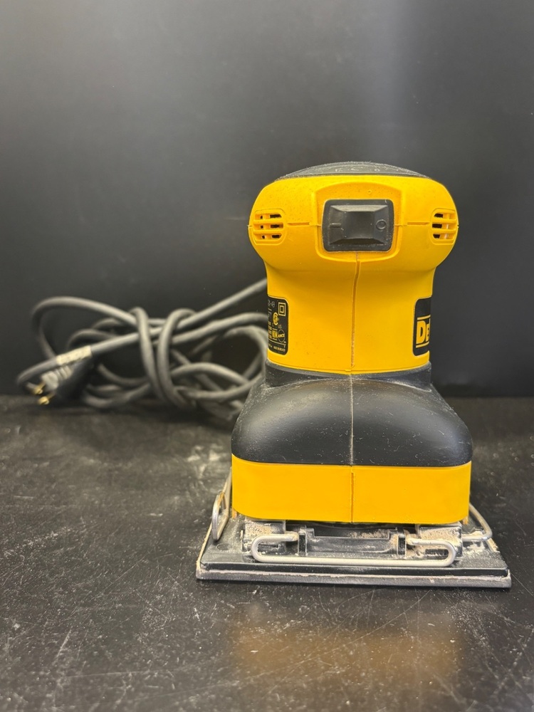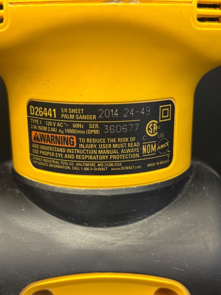 The DEWALT D26441 1/4 Sheet Palm Sander has a 2.4 Amp motor which sands at 14,000 OPM for a superior finish. It features a textured, anti-slip top and body grip, providing the ultimate comfort and control during use. The dust-sealed switch protects the motor against dust ingestion for a longer tool life.