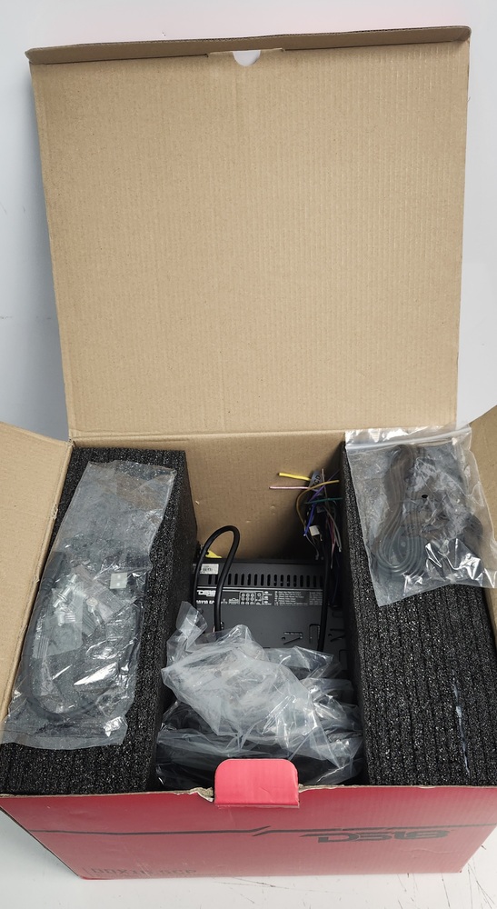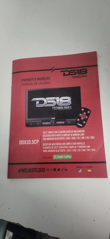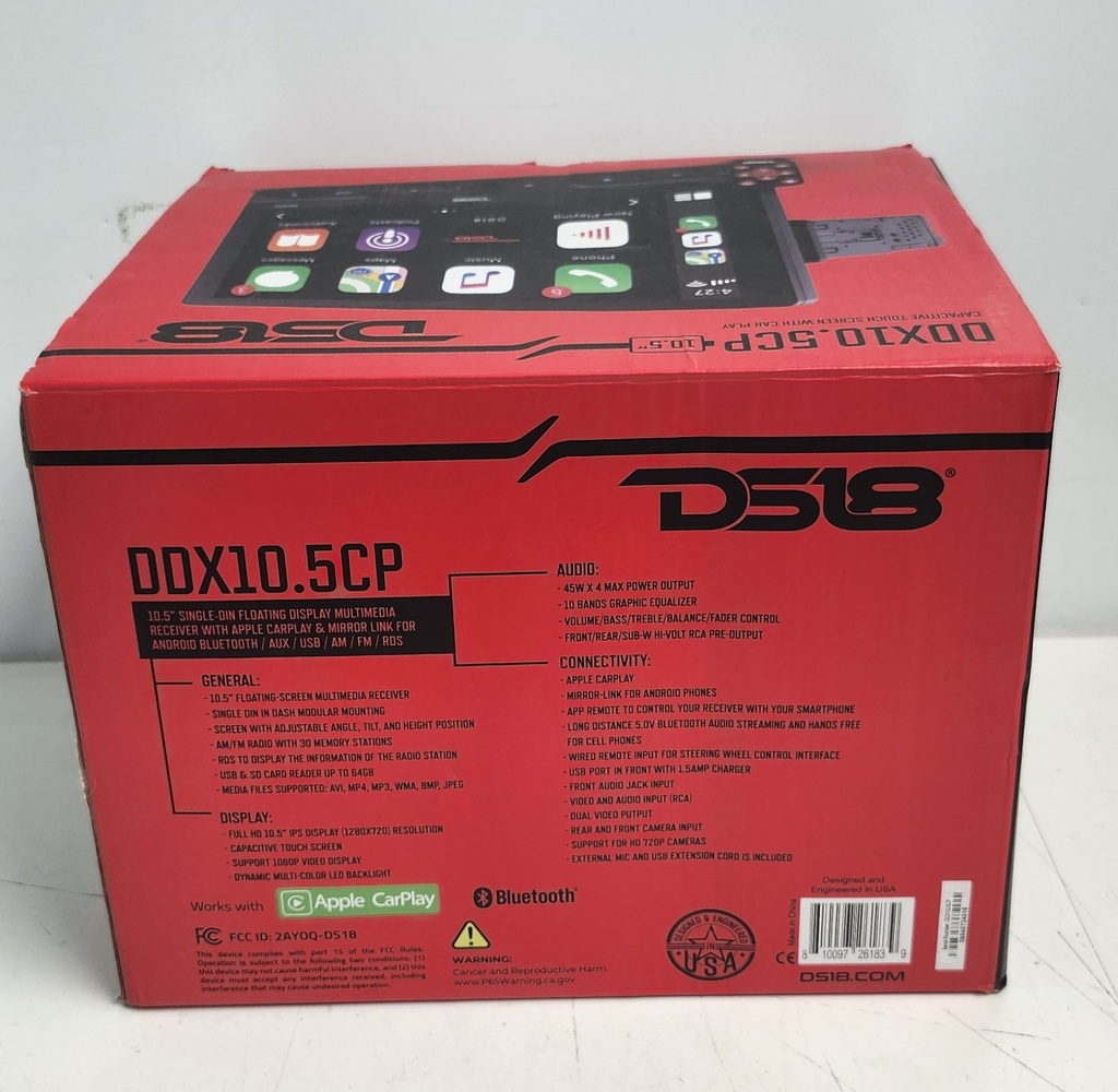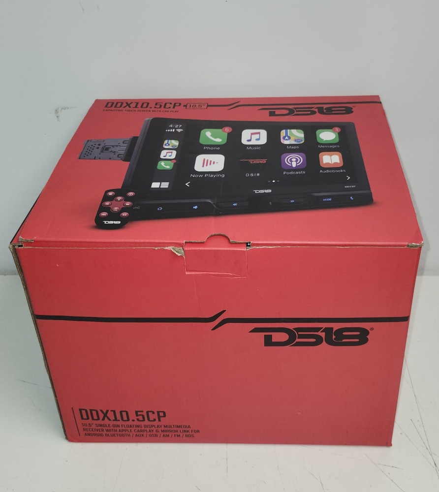 DS18 DDX10.5CP single-DIN floating touchscreen car stereo with a large 10.5" capacitive display. Supports Apple CarPlay, Android mirror link, Bluetooth audio/phone calls, AM/FM radio, USB, AUX, and SD. Includes original box, wiring harness, accessories, and owner’s manual as shown.