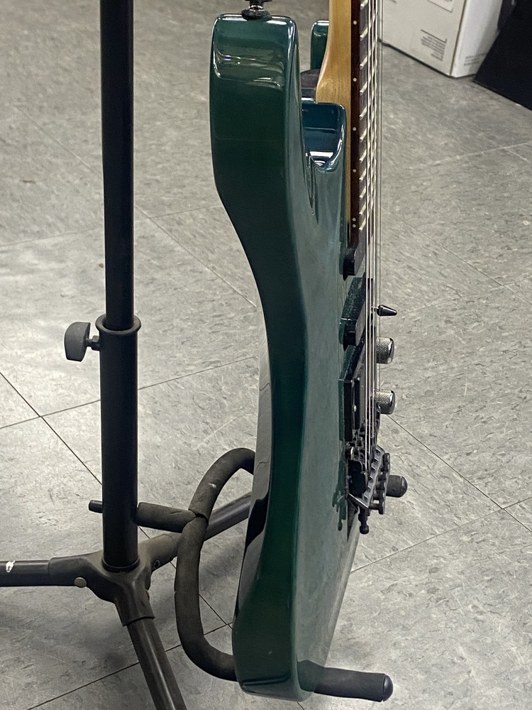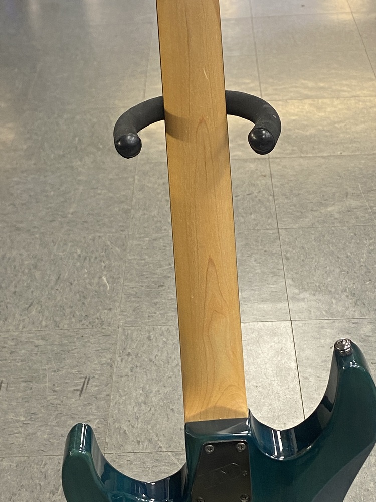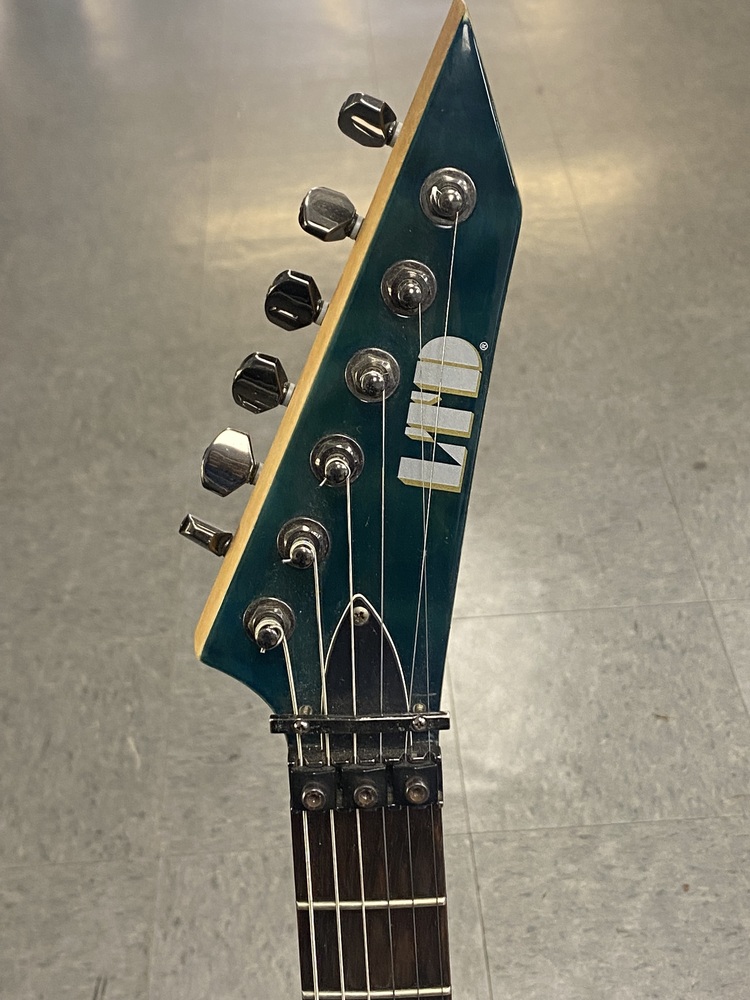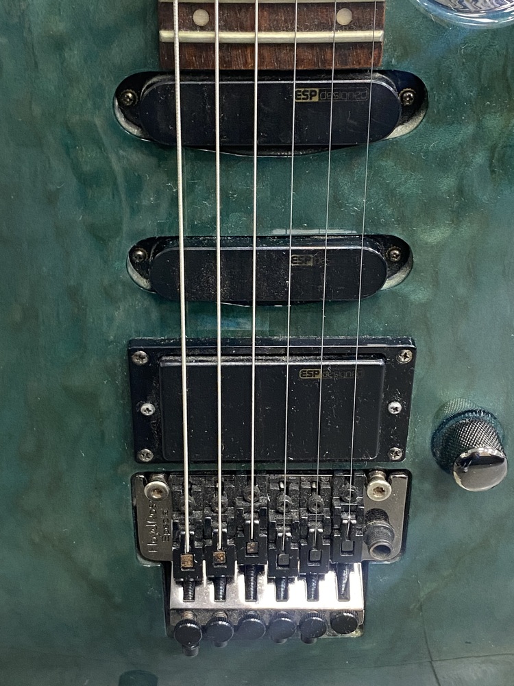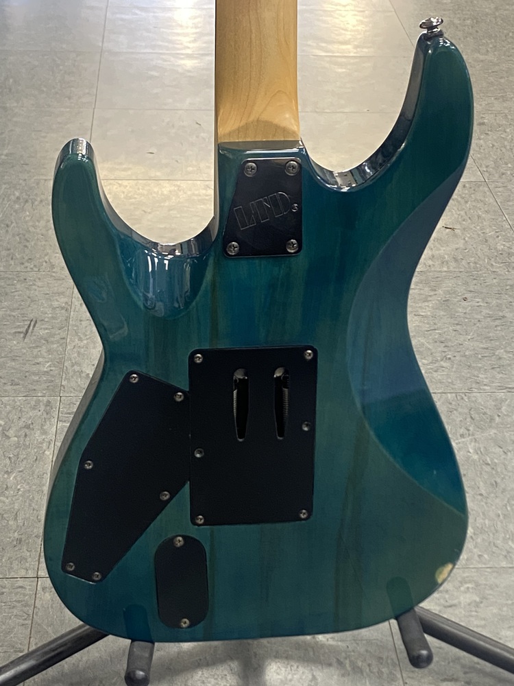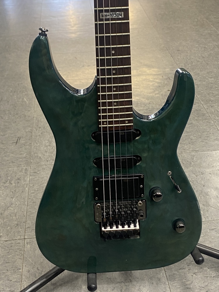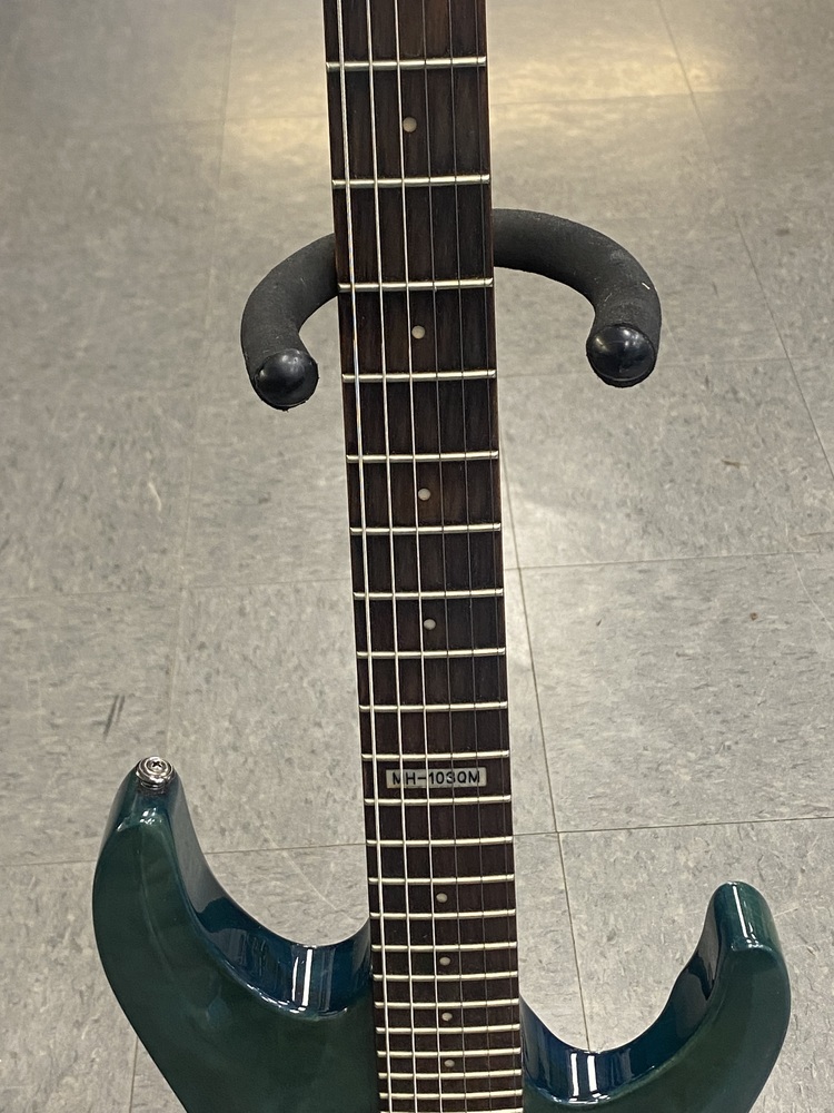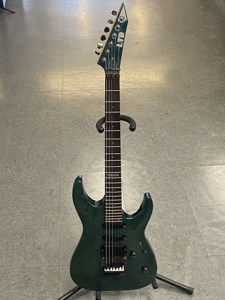 The LTD MH103QM is an electric guitar by ESP's LTD brand, specifically a "SuperStrat" model featuring a transparent green quilted maple top, a basswood body, and a maple neck with a rosewood fingerboard. It is designed for fast play and versatile tone with its HSS pickup configuration (one humbucker and two single-coils), 24 extra-jumbo frets, and a Floyd Rose tremolo system.
