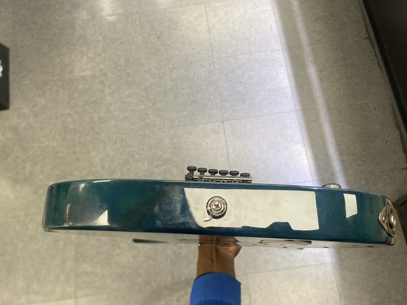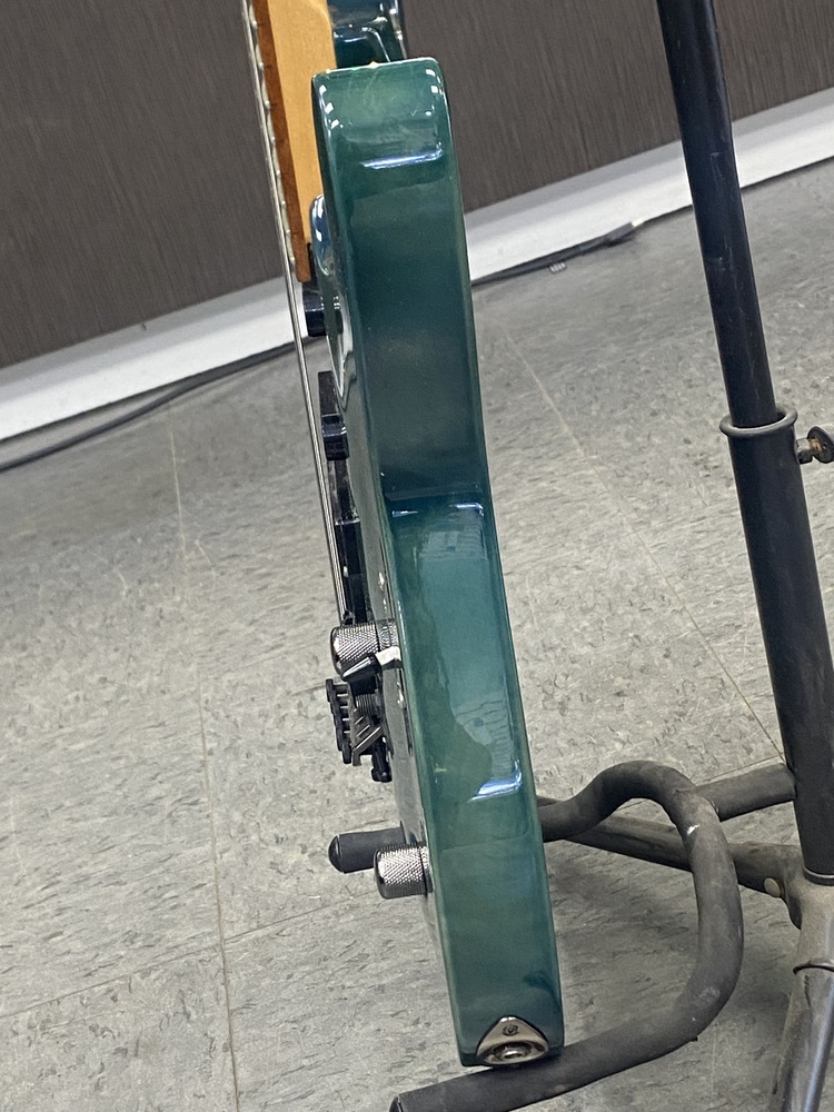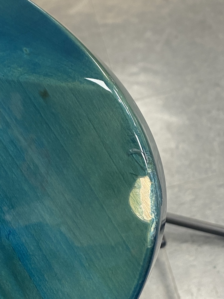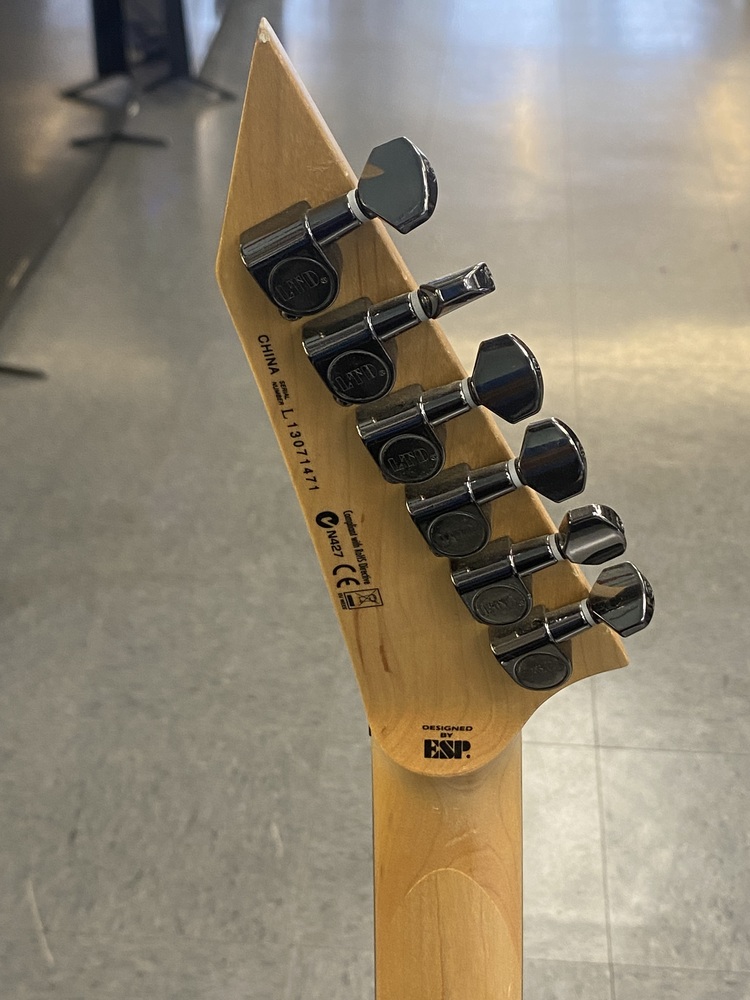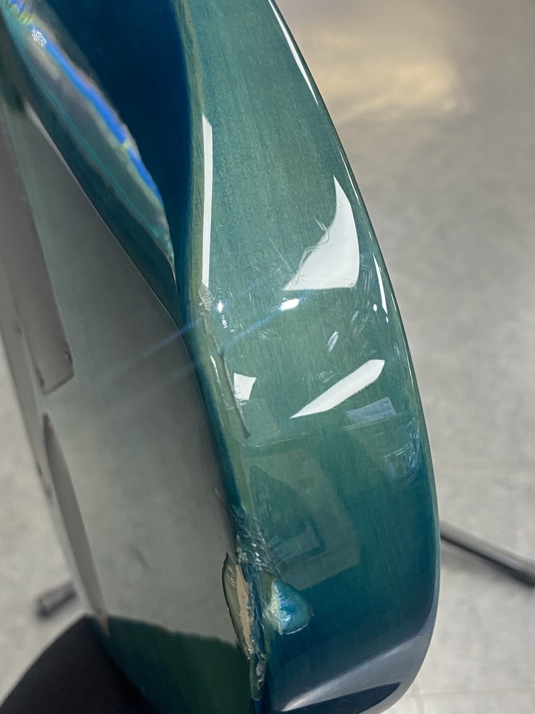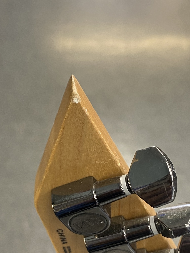 This guitar is preowned and plays well.There is a crack in the laquer with the wood being exposed and a scuff on the side as well. SEE PICTURES.
