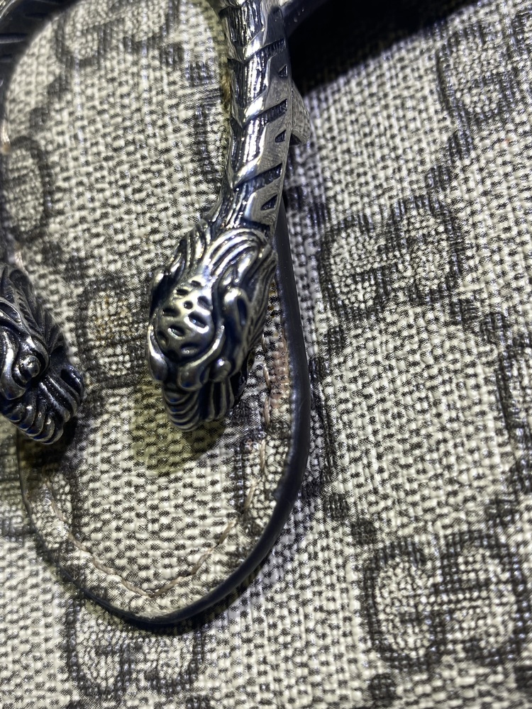 A structured GG Supreme canvas wallet on chain with our textured tiger head spur closure.