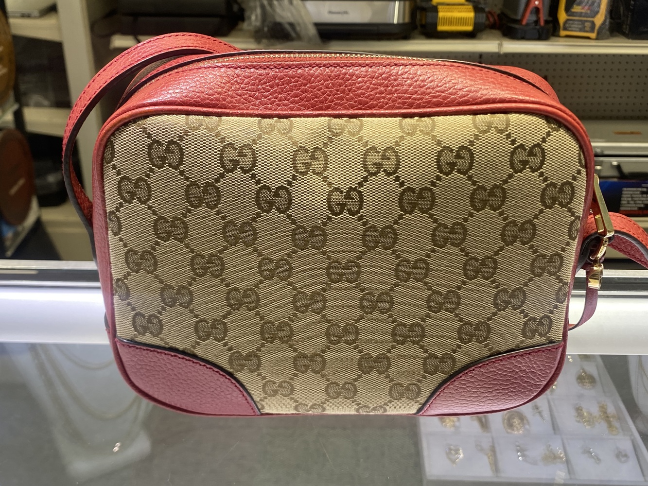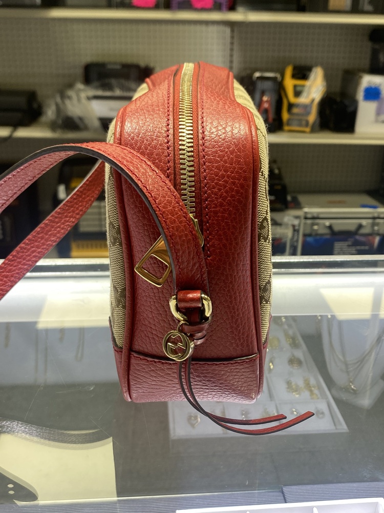 Authentic Gucci GG Canvas Bree Crossbody Bag in Red.