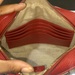 Features Gucci brown and beige monogram canvas with red leather trim, zipper top closure, leather shoulder strap, gold hardware. The crossbody opens to a beige fabric interior with a patch pocket and 8 red leather card slots.