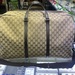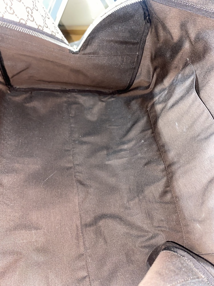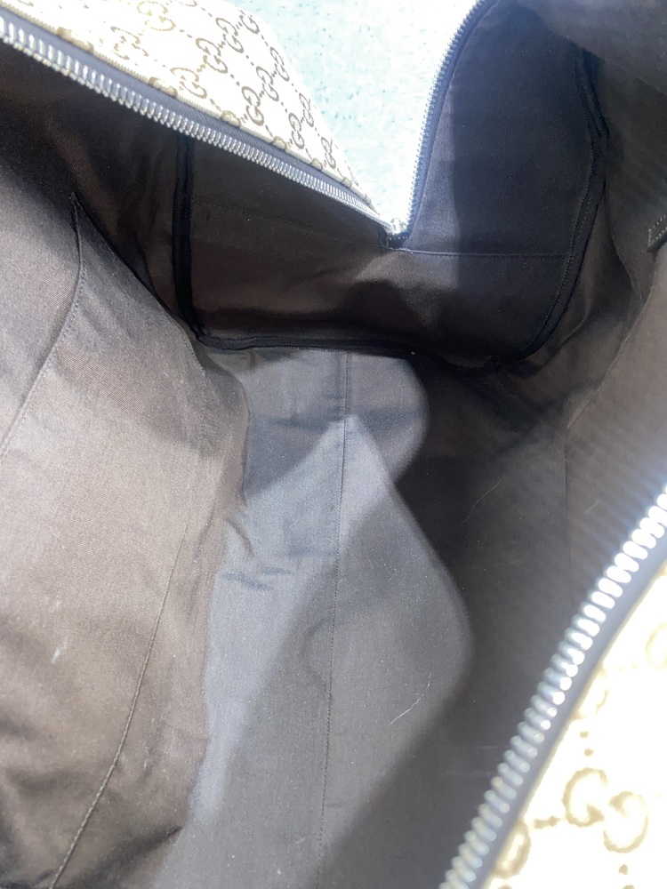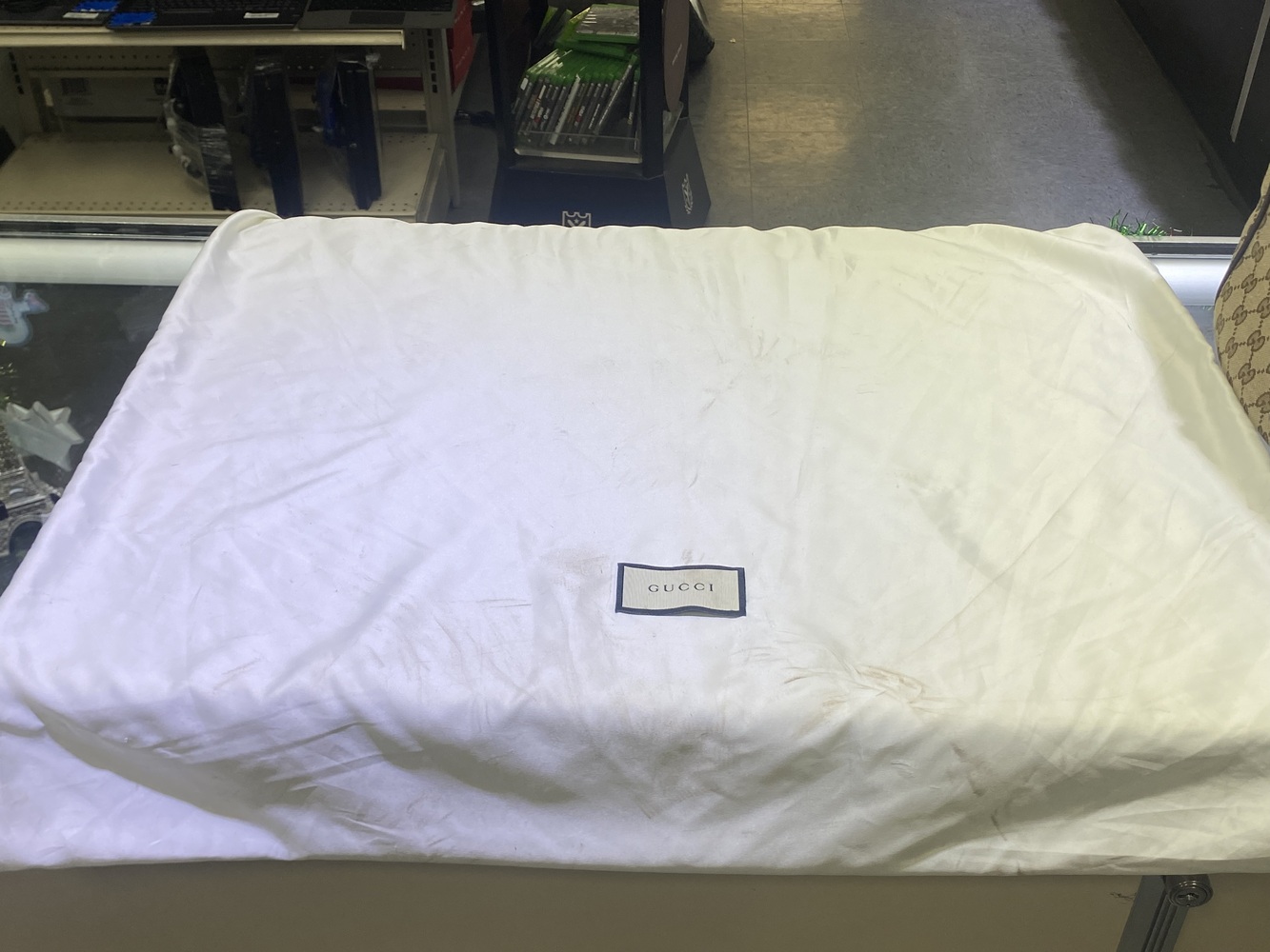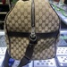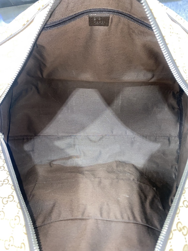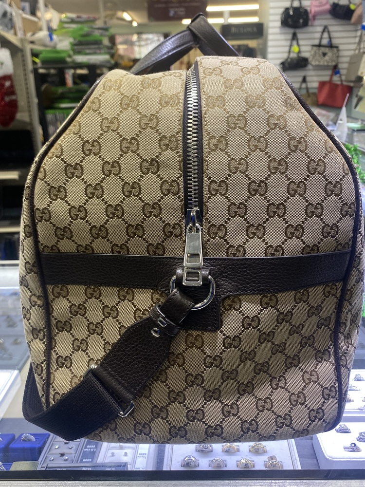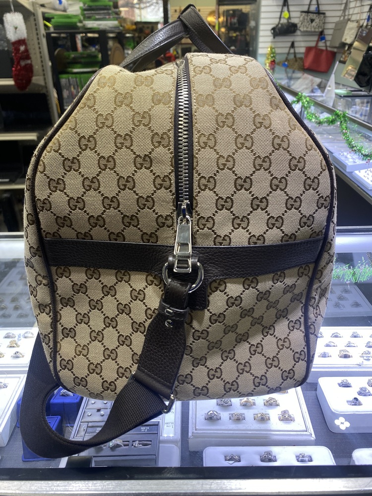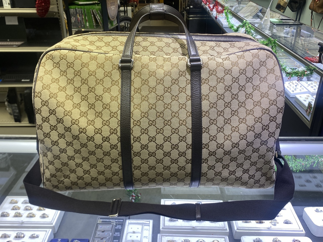 A favorite Gucci travel piece this large beige and brown canvas Gucci GG canvas duffle bag will make your next trip a breeze. This roomy luggage piece has room for clothes, shoes, and toiletries. The leather double handles make carrying by hand easy, but if you need your hands free to hail a cab you can use the adjustable canvas shoulder strap. There's a reason this Gucci duffle is a favorite among many!