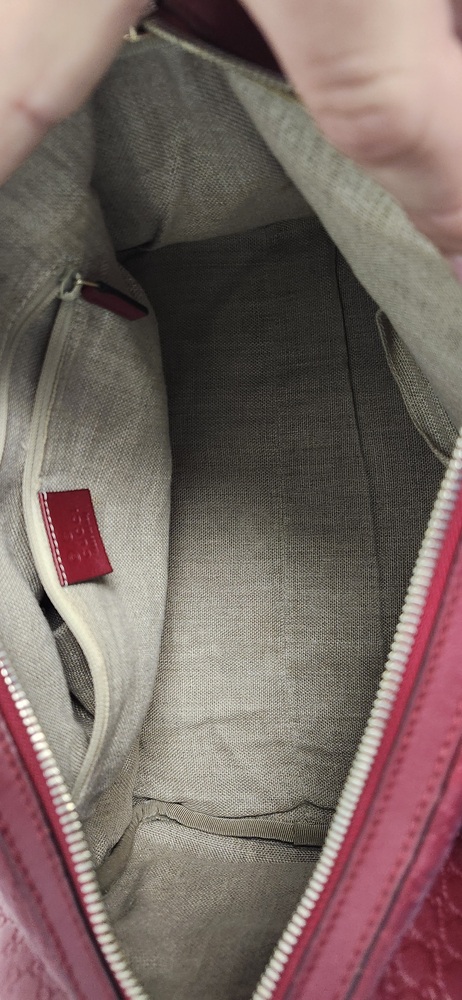 Interior is lined in beige canvas with one zip pocket and two slip pockets.