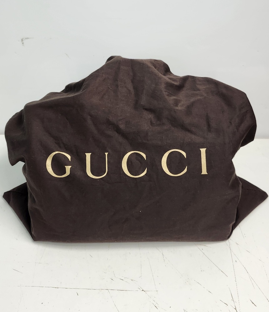 Features embossed GG micro pattern, gold-tone hardware, dual rolled handles, and a detachable shoulder strap.