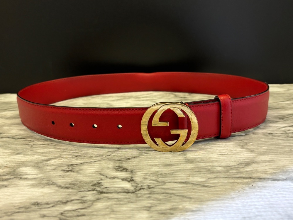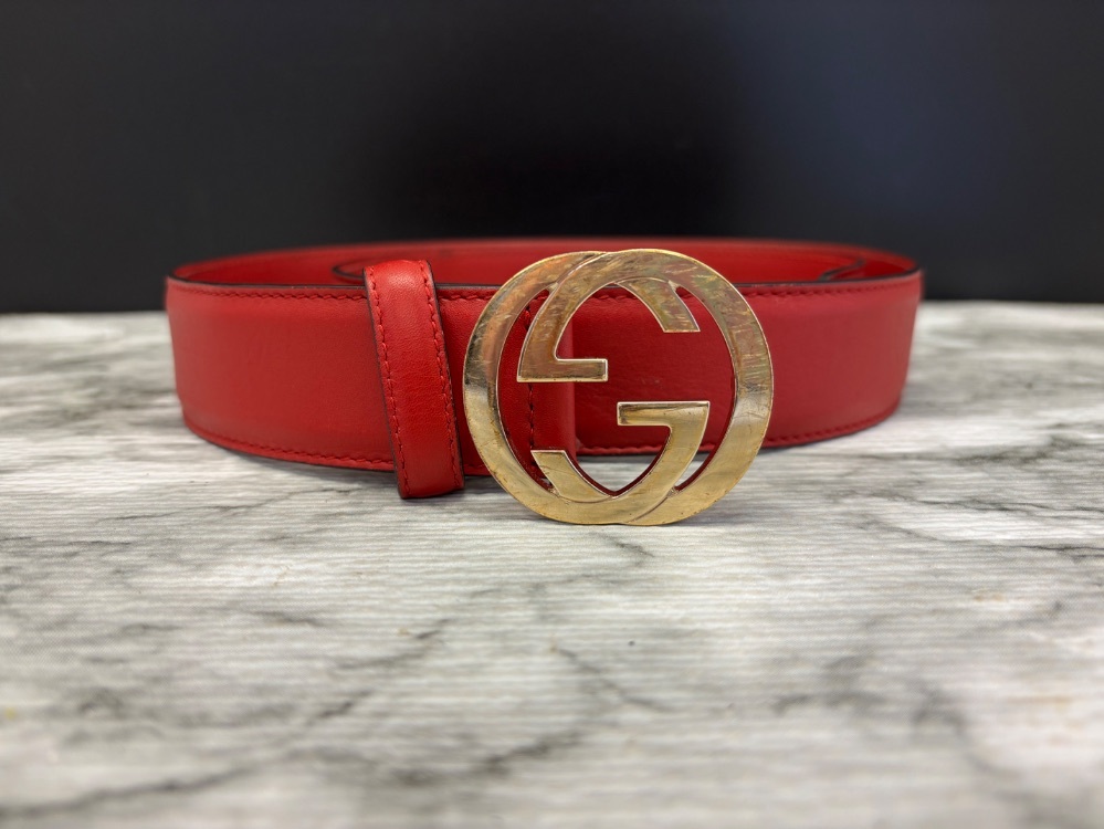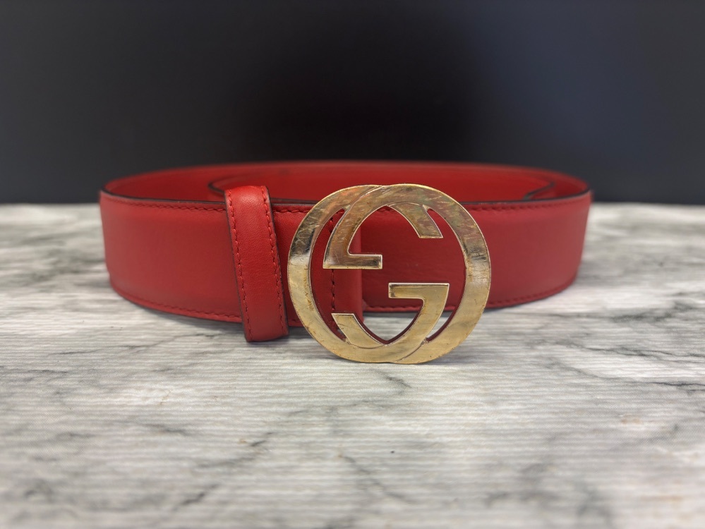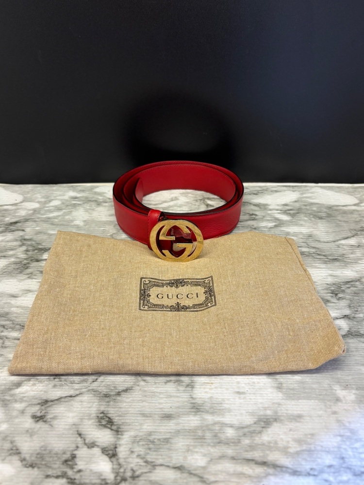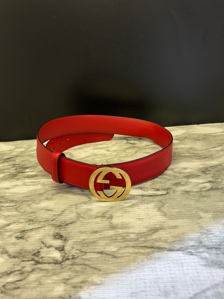 The Gucci Red Leather Interlocking G Buckle Belt is crafted from high-grade, vivid red leather. It features the iconic Interlocking G buckle. The belt measures 4cm in width, assuring durability and a sturdy grip around the waist.