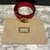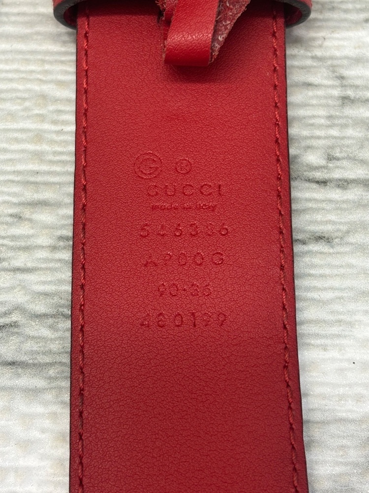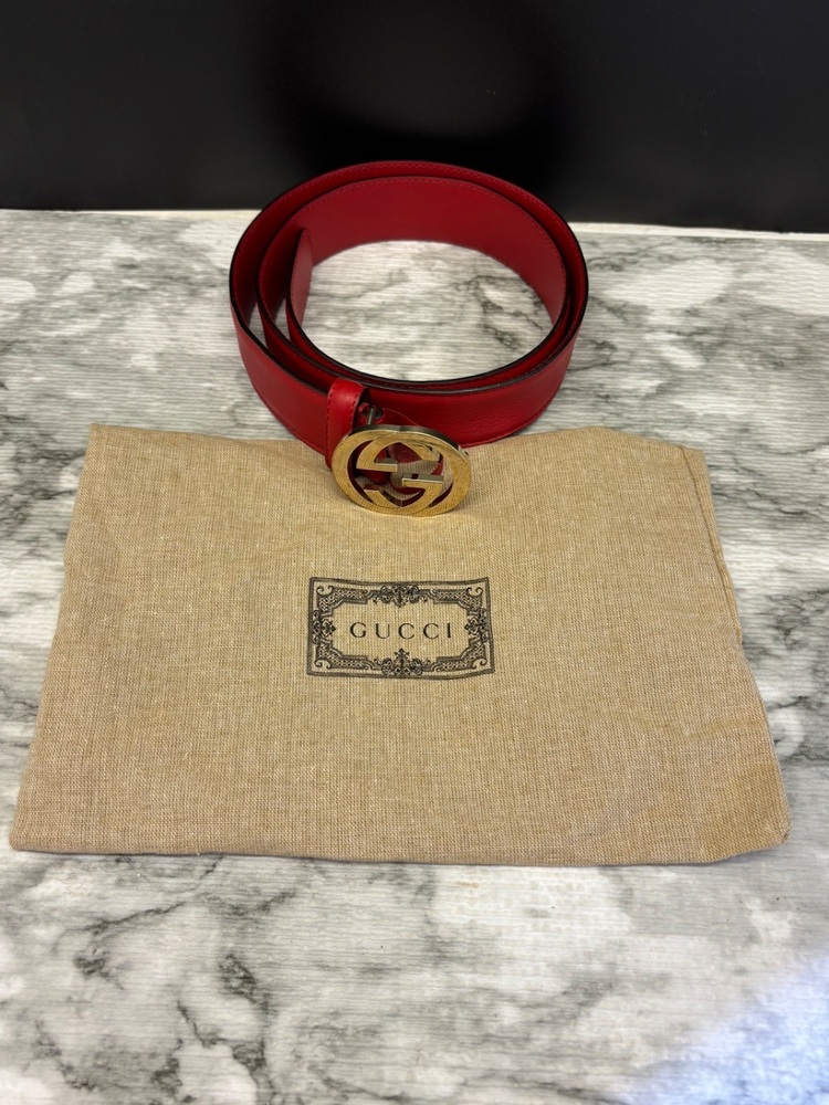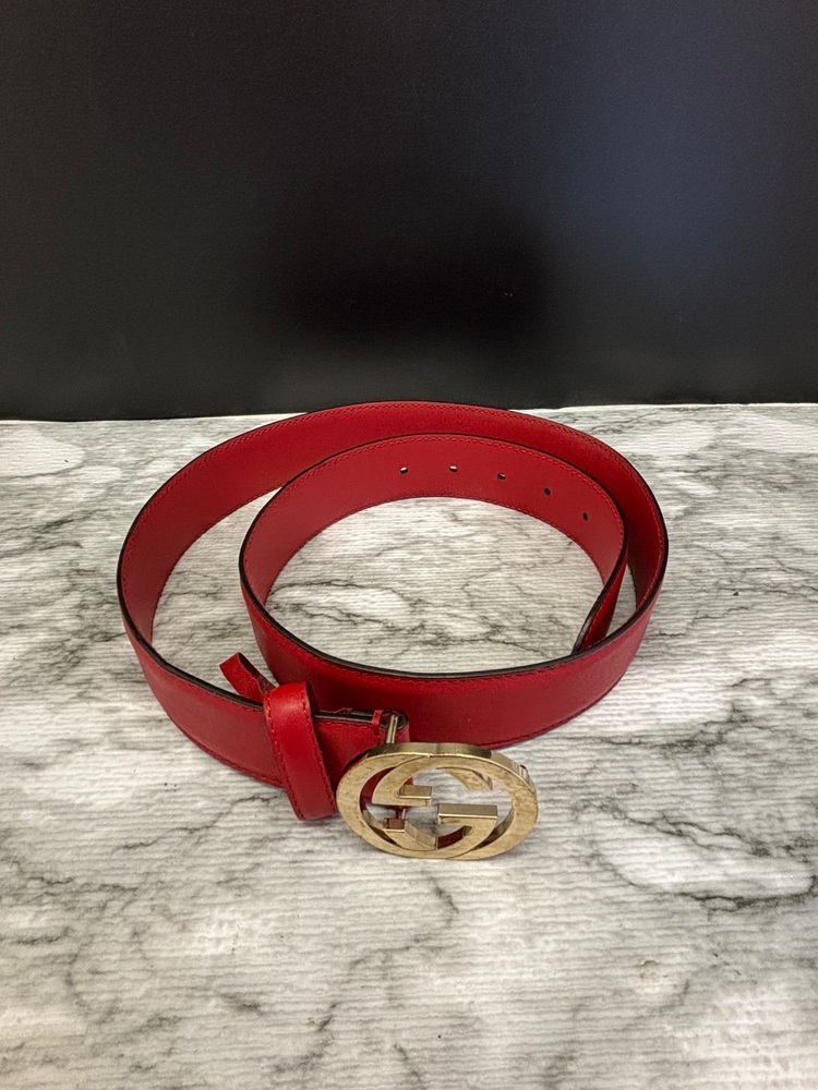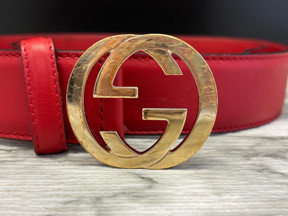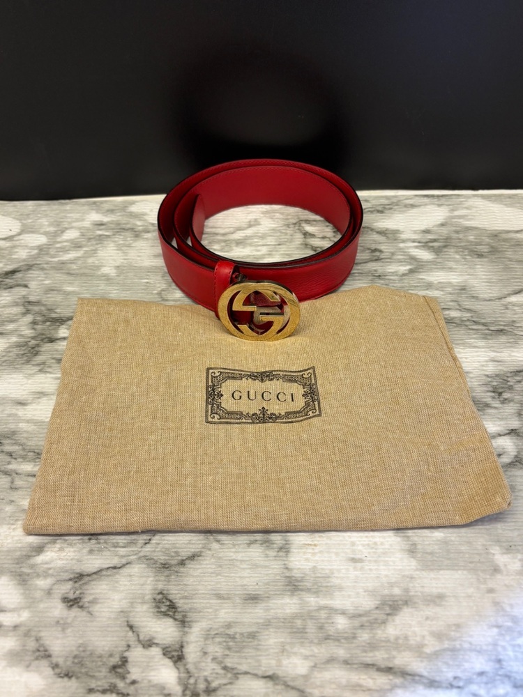The Gucci Red Leather Interlocking G Buckle Belt is crafted from high-grade, vivid red leather. It features the iconic Interlocking G buckle. The belt measures 4cm in width, assuring durability and a sturdy grip around the waist.