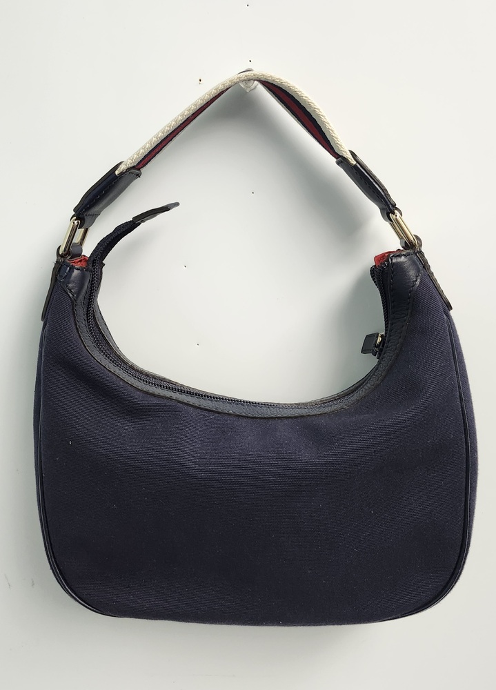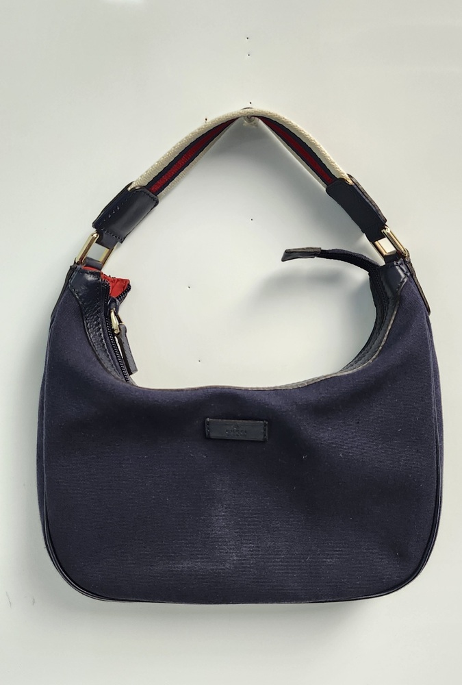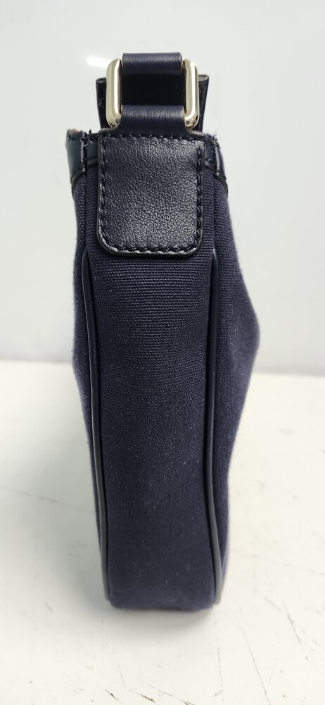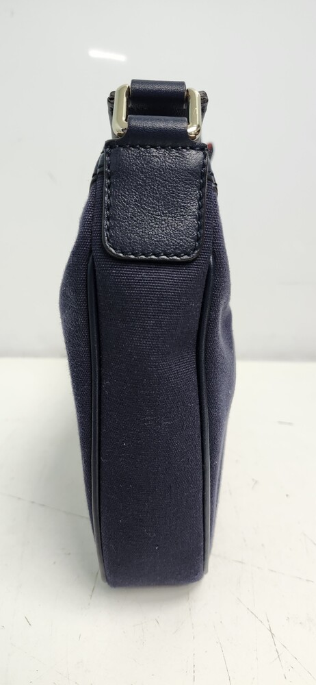 Authentic Gucci Sherry Line shoulder bag in navy GG canvas with dark leather trim.