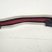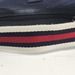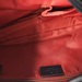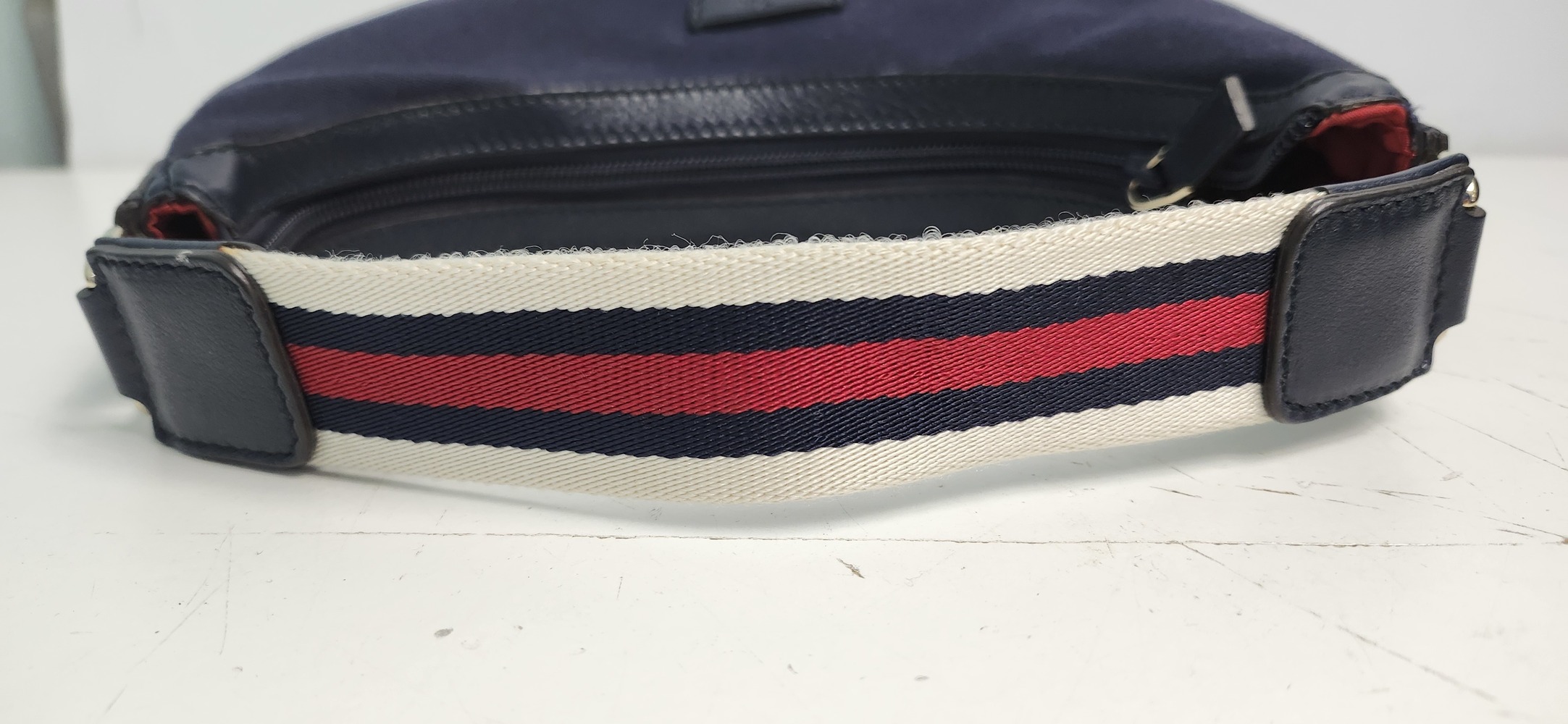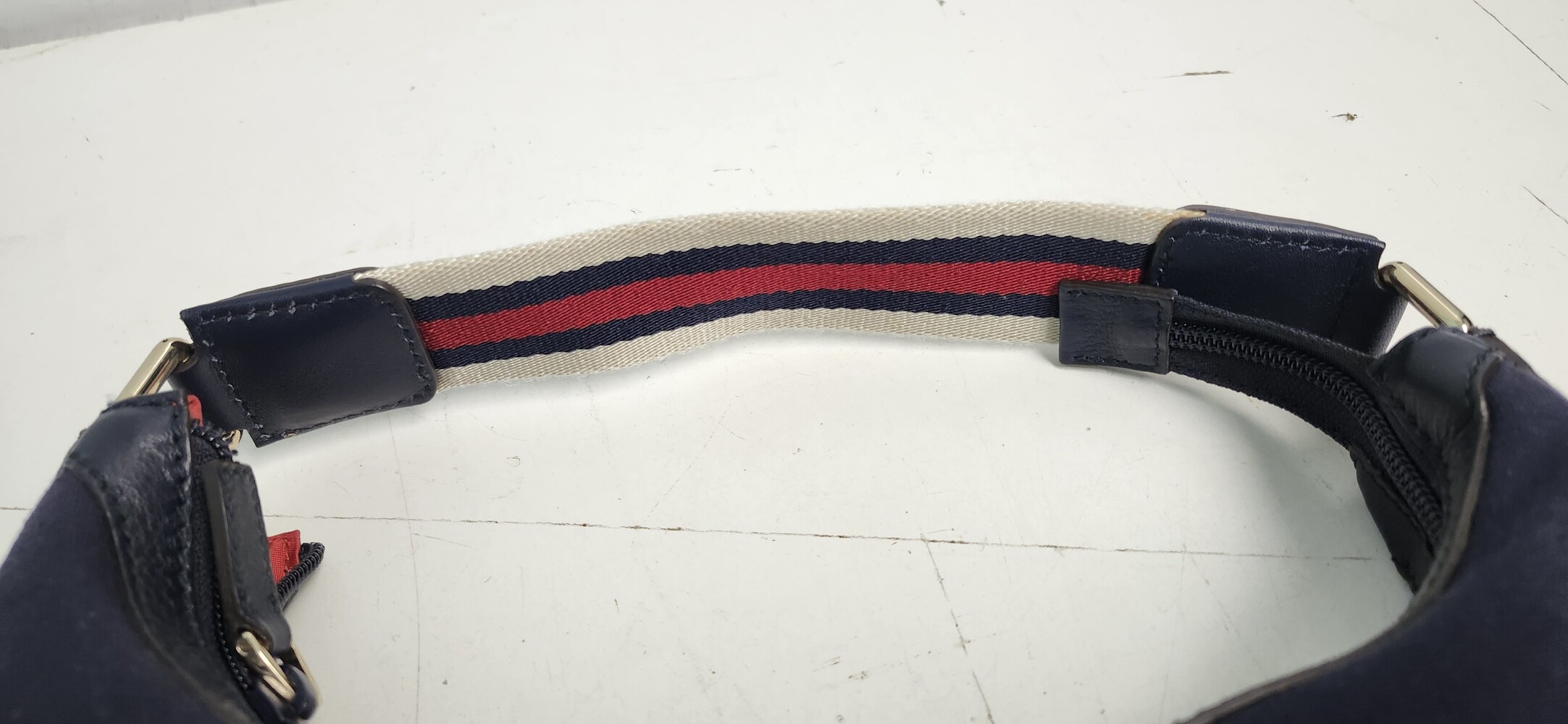 Cream/red/navy web strap, gold-tone hardware, red fabric lining with zip pocket.