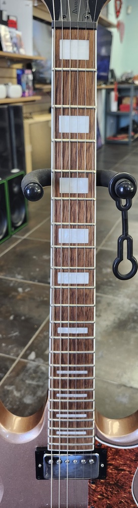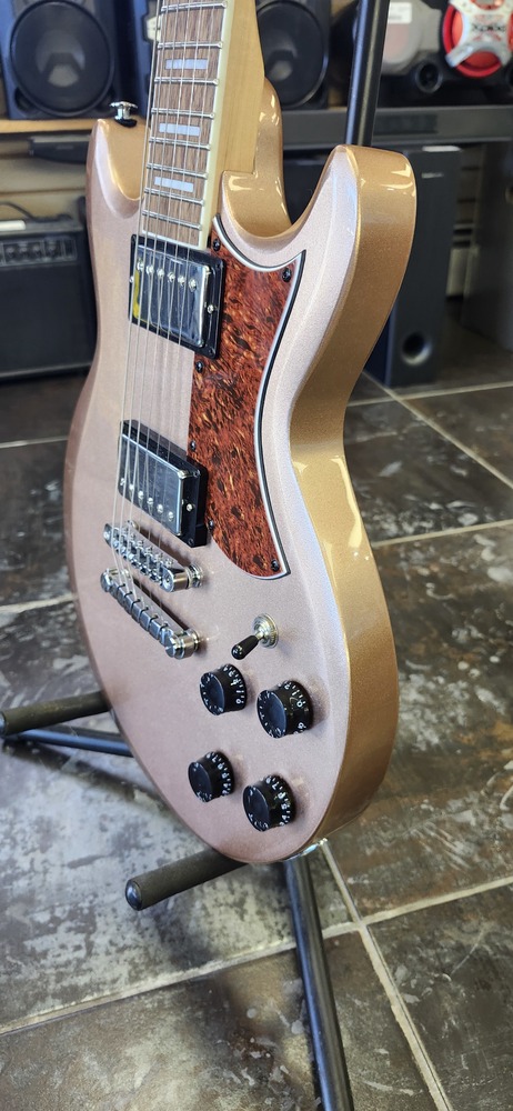 Ibanez AX120 in copper finish. Bolt-on neck, dual humbuckers, and classic 4-knob control layout with 3-way switch. Plays and sounds great, solid LP-style feel. Normal cosmetic wear from use, no major issues. Ready to play.
