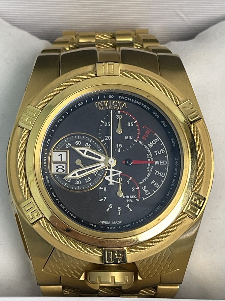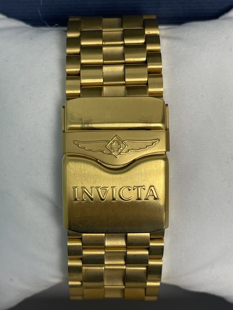 This beautiful Invicta Bolt watch contains a precise Quartz movement in addition to a gold case. Its face displays a black, metal dial protected by a highly resistant Flame Fusion Crystal. This timepiece is completed by a gold, stainless steel band and it offers water resistance of up to 100 m.