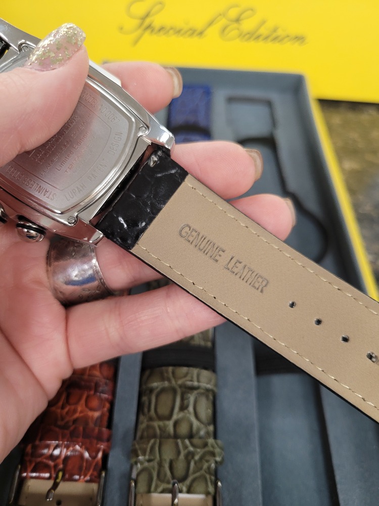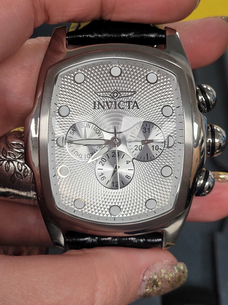 This Invicta Lupah Special Edition watch is a bold and stylish statement piece. It features a polished stainless steel case, silver textured dial with chronograph subdials, and luminous markers for easy readability. The set includes five interchangeable genuine leather straps in black, green, red, blue, and brown — perfect for switching up your look anytime.