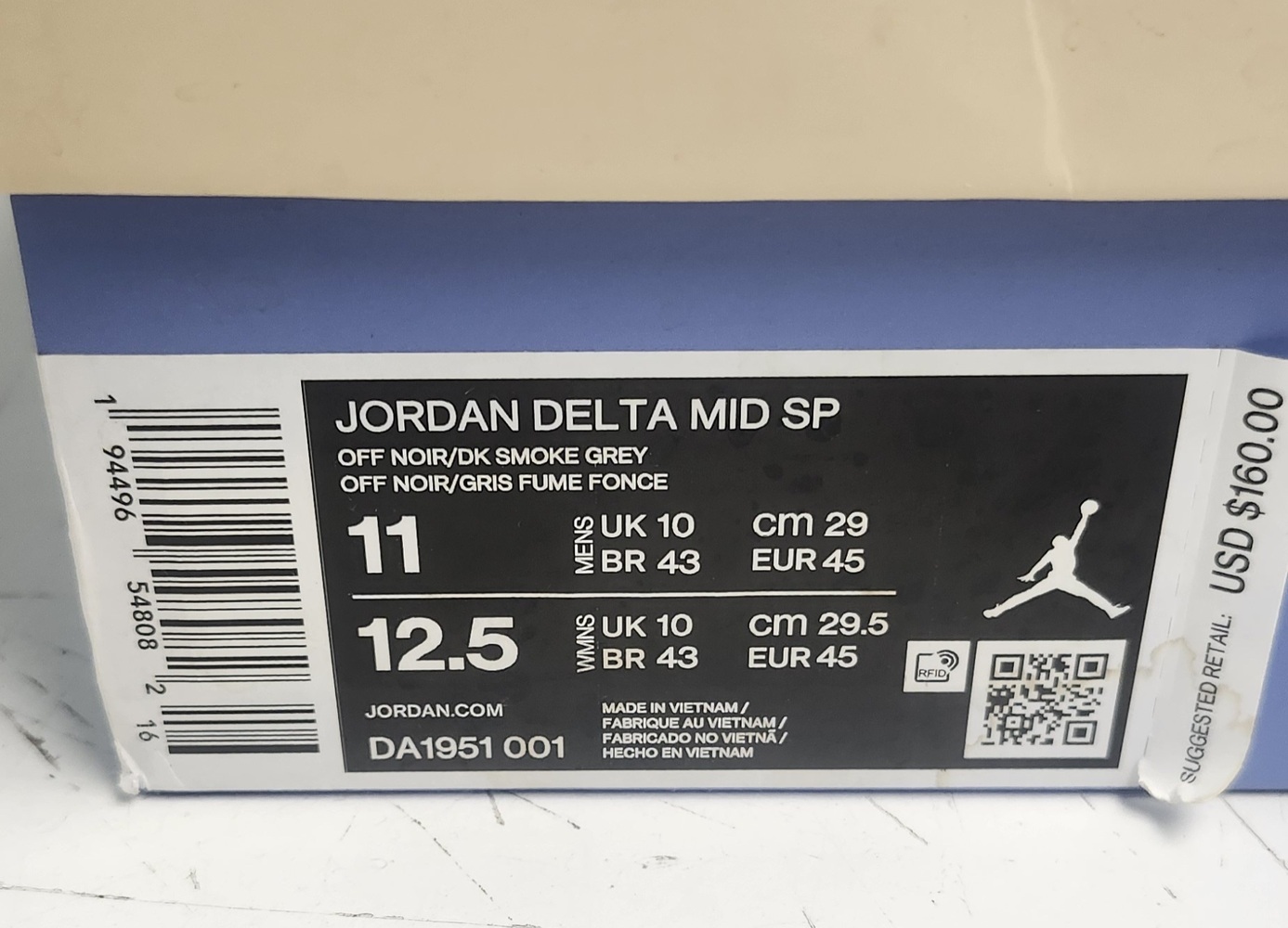 Jordan Delta Mid SP sneakers in Off Noir/Dark Smoke Grey, men’s size 11. Pre-owned with normal wear from use; see photos for outsole condition. Structurally solid with original box included.