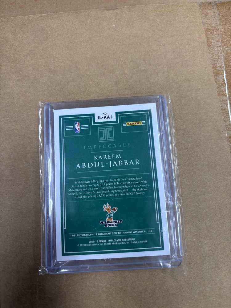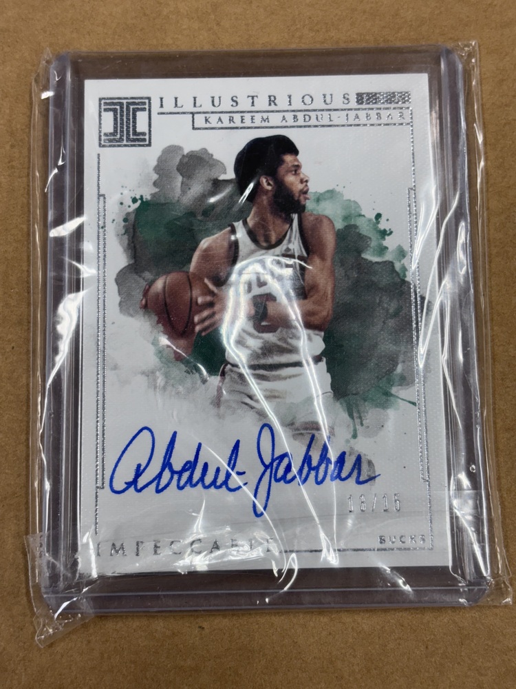 Add a true legend to your collection with this Kareem Abdul-Jabbar Illustrious Ink autographed card from the 2018-19 Panini Impeccable Basketball series. This ultra-rare card is serial-numbered 13/15, featuring a crisp on-card autograph of one of the greatest players in NBA history and a stunning high-end design.