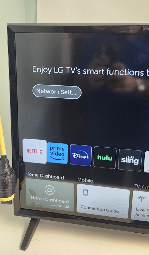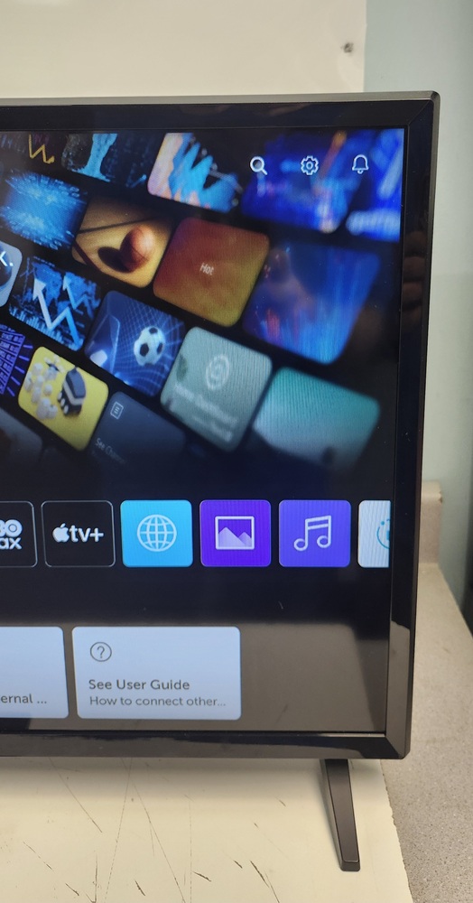 TV is in good working condition. Screen looks clear, sound works, and it connects to apps and menus with no issues. Comes with the original LG remote (AKB76037601) and built-in stand legs. Light signs of normal use on the exterior but nothing that affects performance.