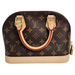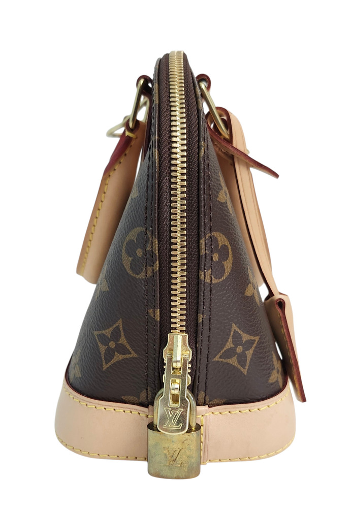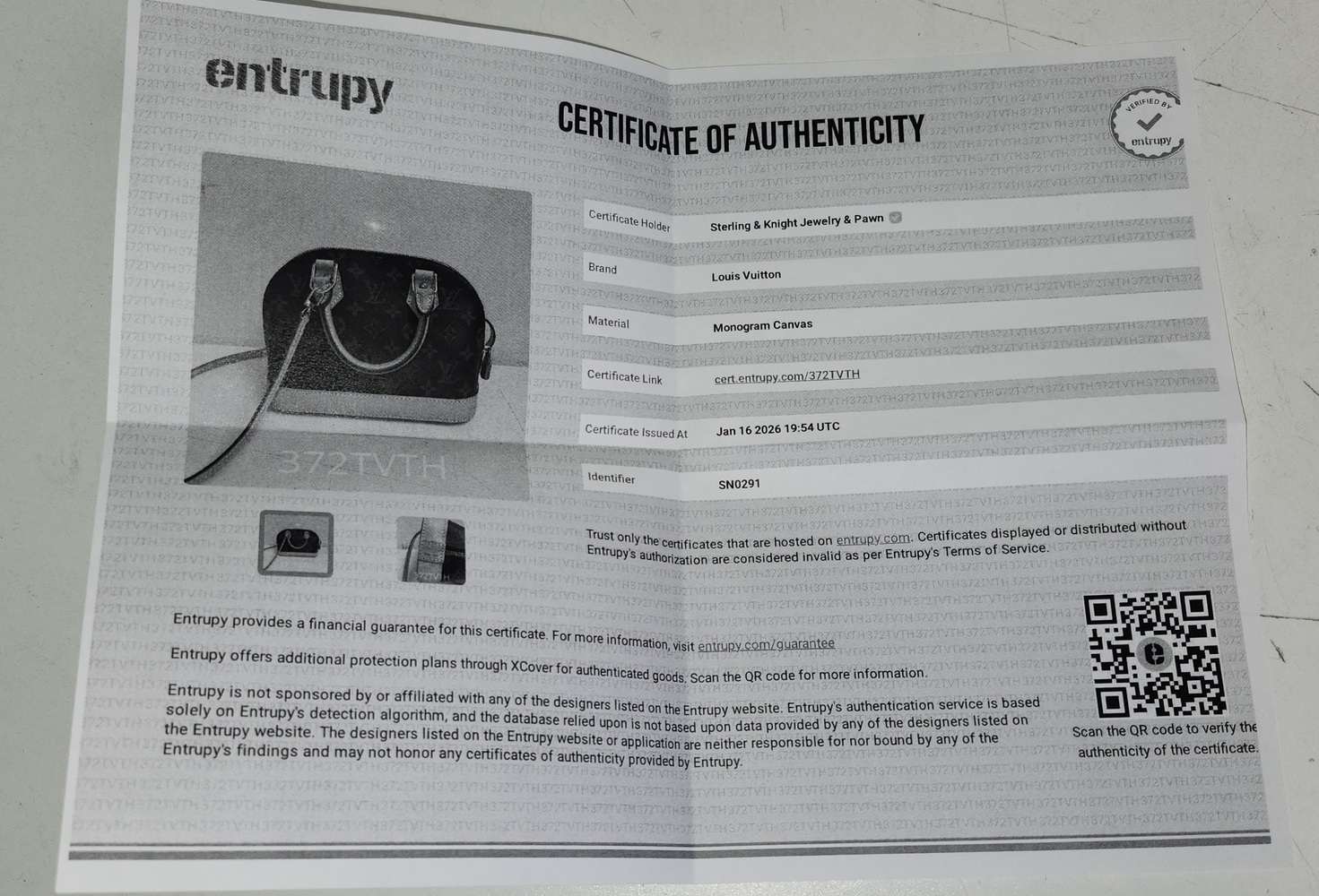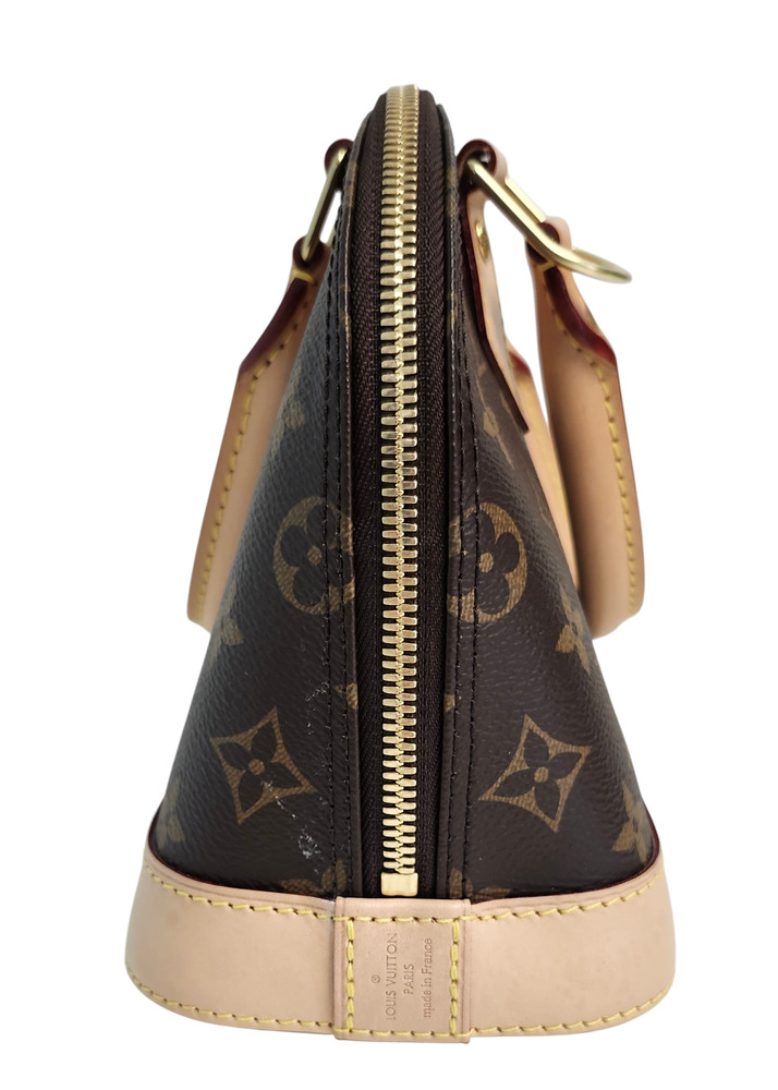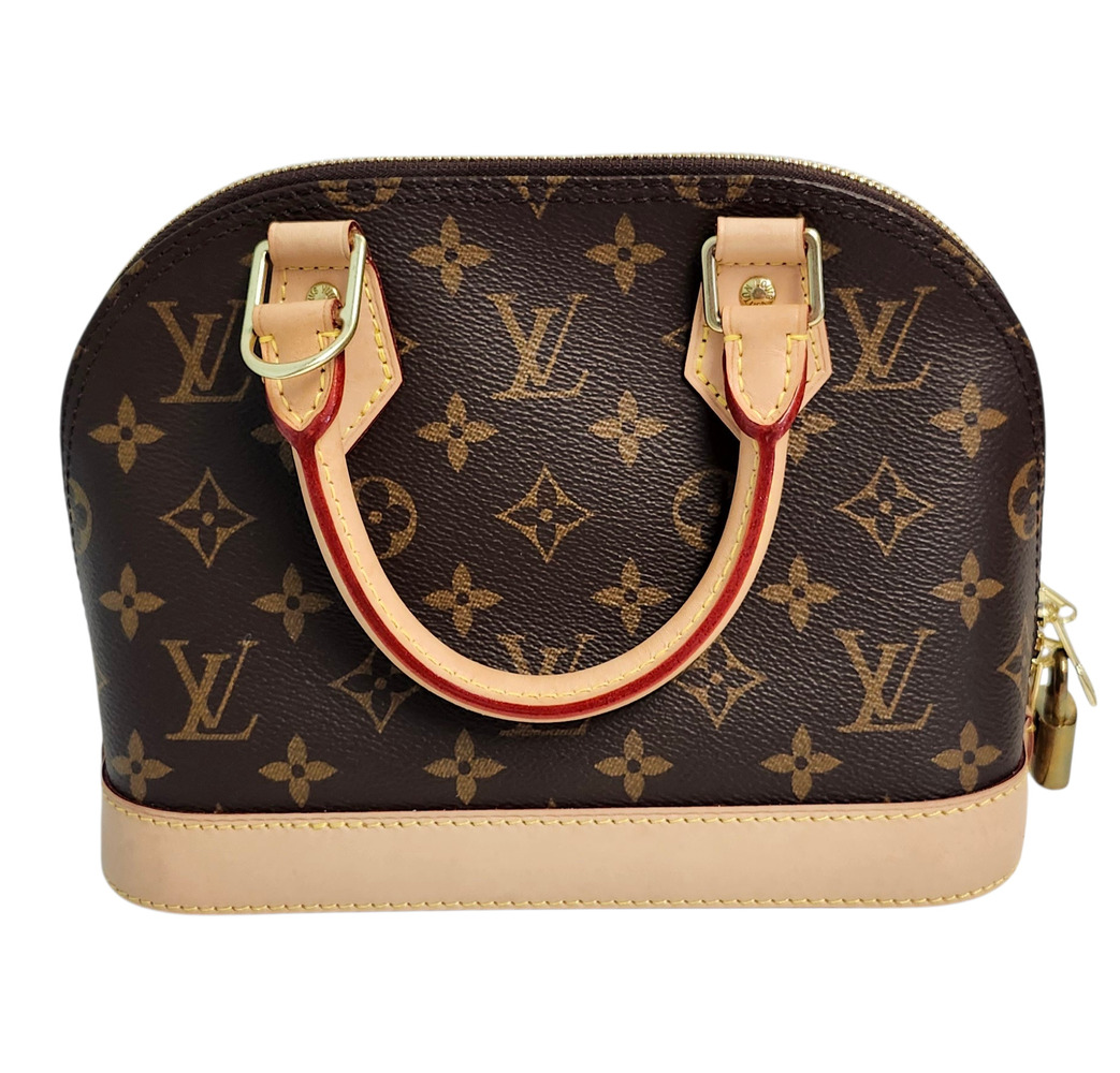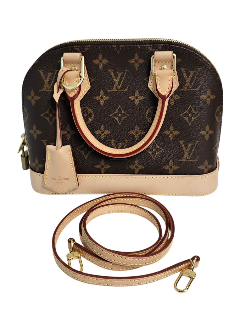 Authentic Louis Vuitton Alma BB in classic Monogram canvas. Includes detachable strap, padlock, keys, and Entrupy certificate of authenticity. Clean interior and solid structure with light wear to leather and hardware from normal use. No box or dustbag included.