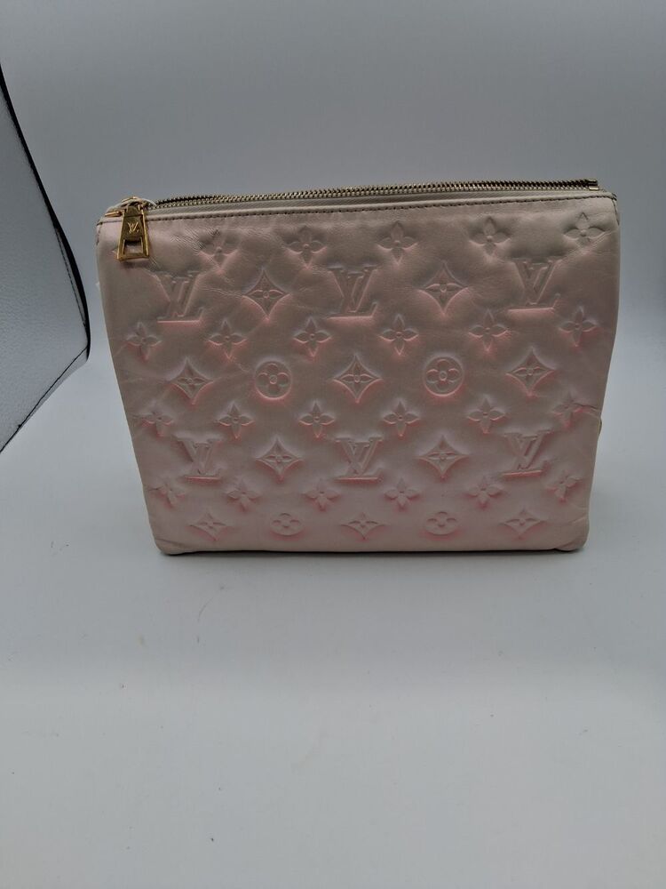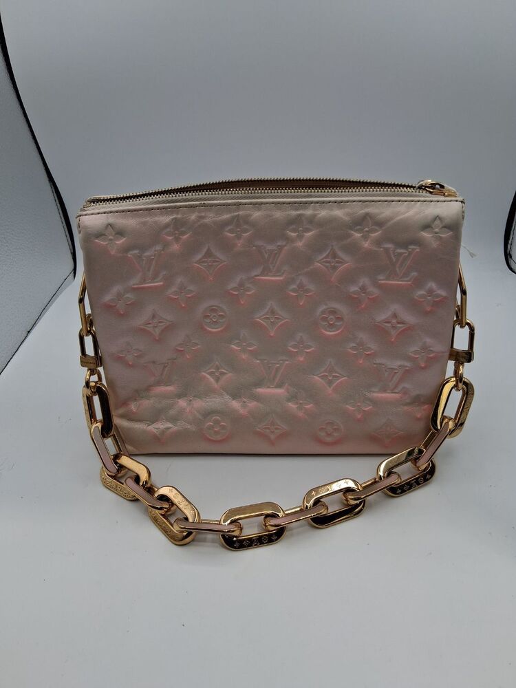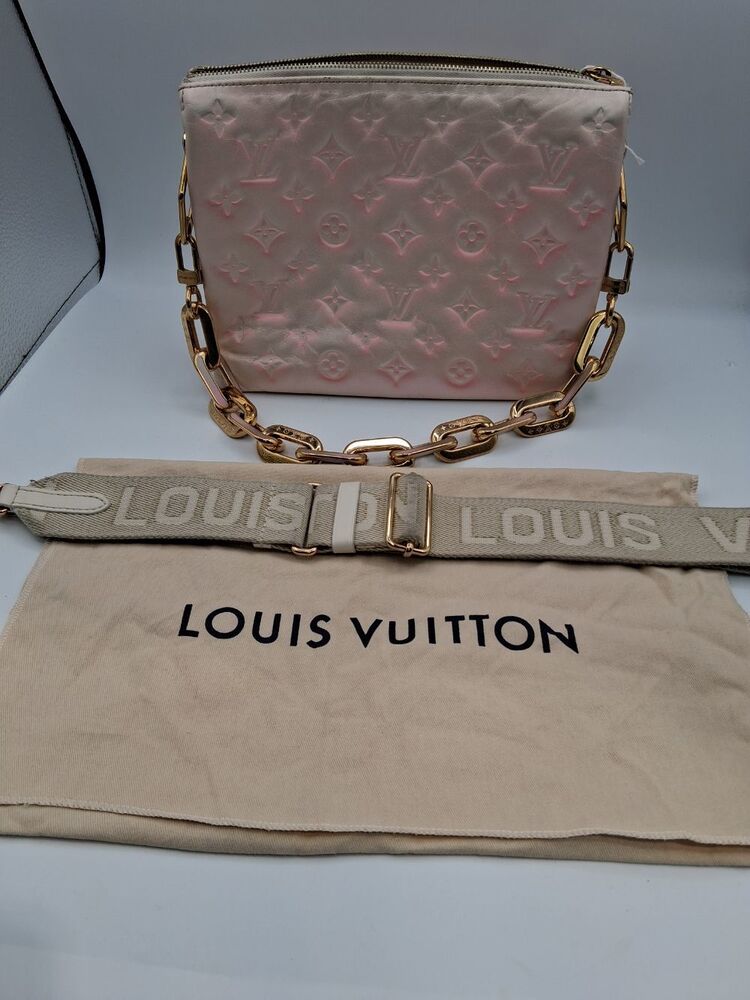 Louis Vuitton Coussin PM handbag in a milky pearl color, embossed with the Monogram motif. Has extra cloth strap and dust bag.