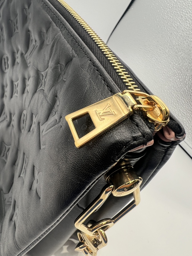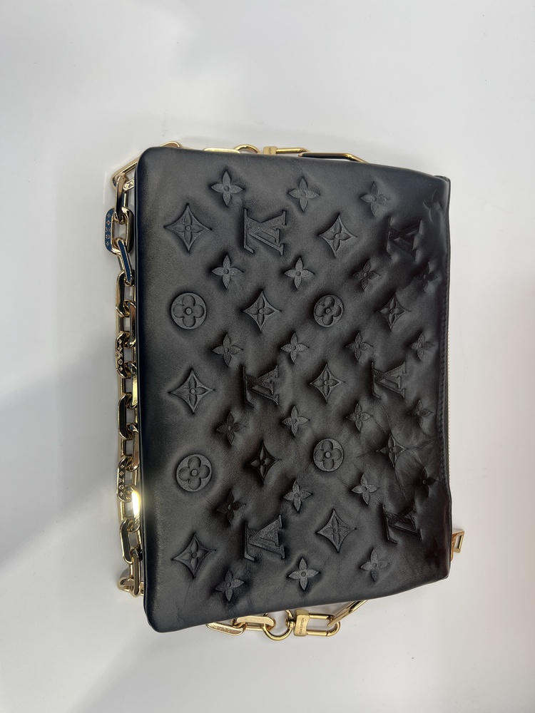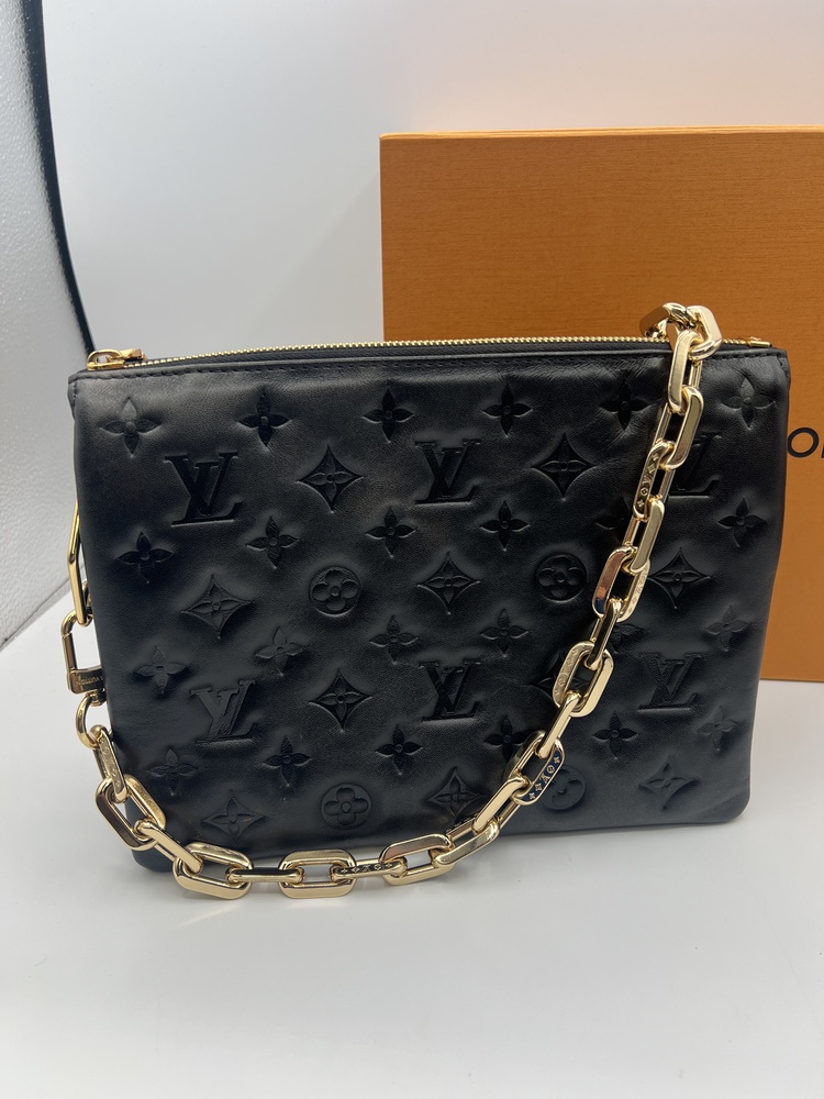 Elevate your style with this stunning Louis Vuitton Coussin PM bag, crafted from luxurious black Monogram Empreinte leather and accented with a bold gold-tone chain strap. This versatile and elegant bag is perfect for day-to-night wear, offering both timeless sophistication and contemporary edge.
