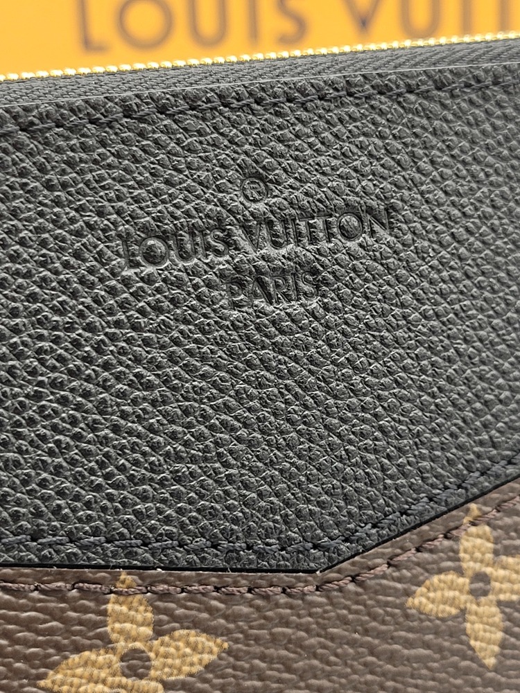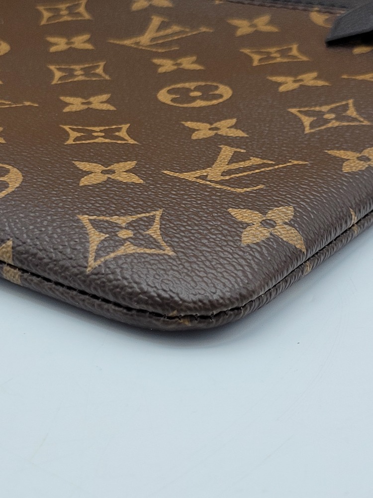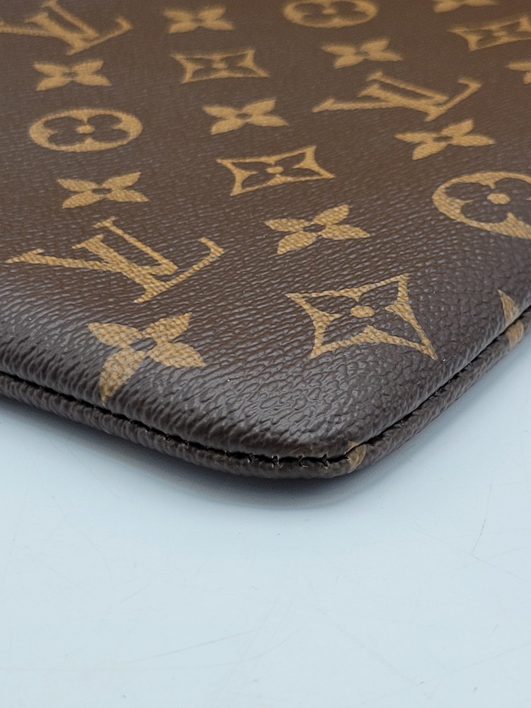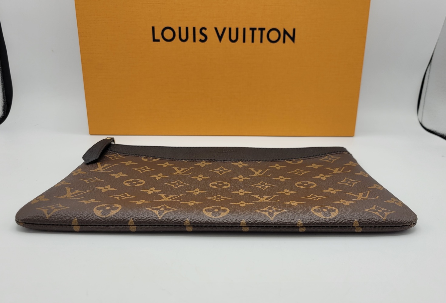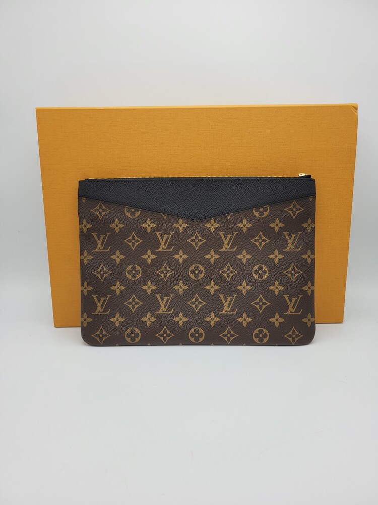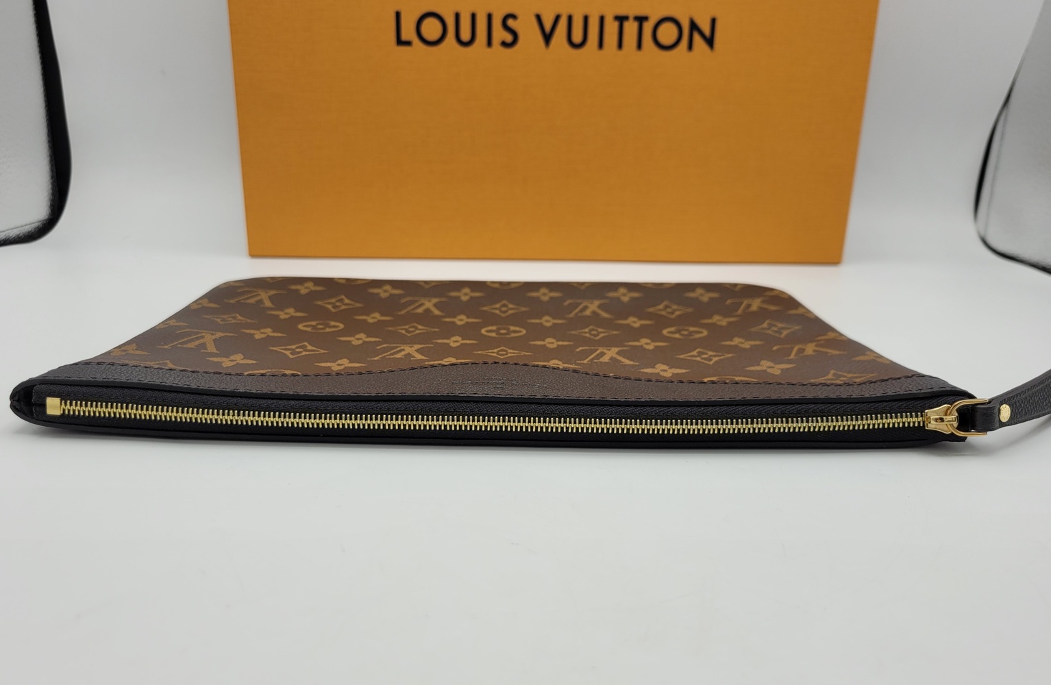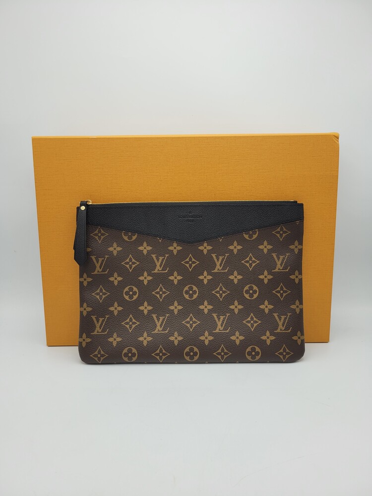 Chic and timeless! This Louis Vuitton Daily Pouch in classic Monogram canvas with black leather trim is the perfect grab-and-go accessory. Crafted in France, it features a gold-tone zipper closure and spacious microfiber-lined interior — ideal for essentials, travel, or use as a sleek clutch.