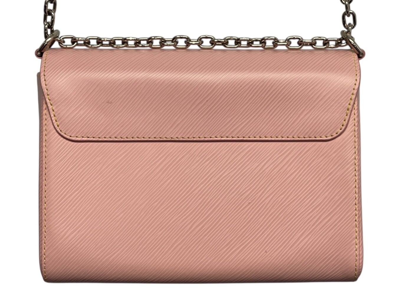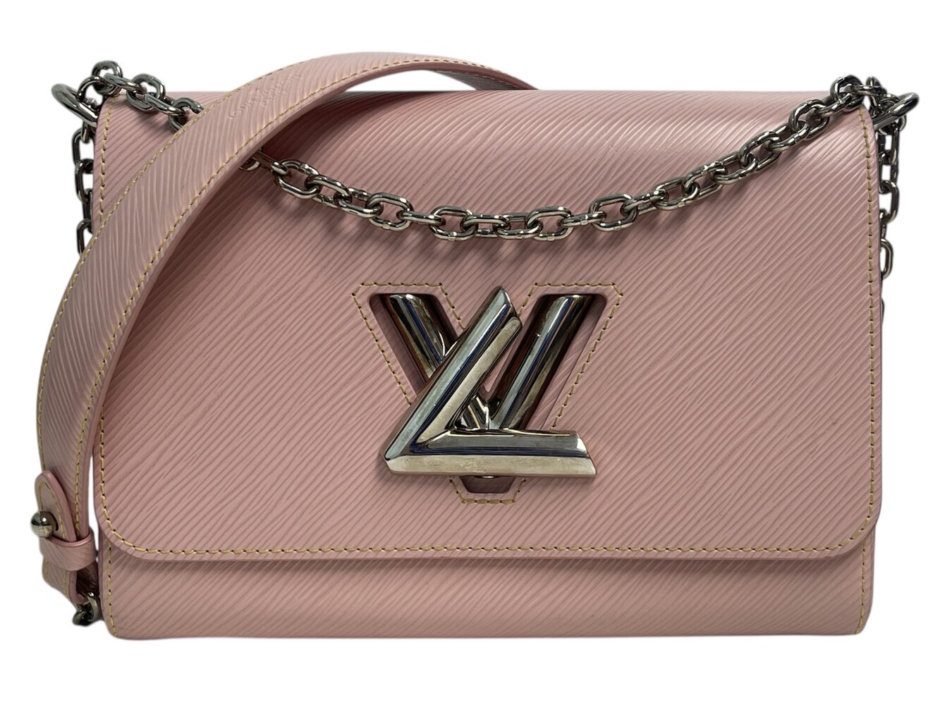 This is an authentic LOUIS VUITTON Epi Twist Shoulder Bag MM in Rose Ballerine. This stylish crossbody bag is crafted of textured Epi leather in pink. The bag features a polished silver chain shoulder strap with a leather shoulder pad and a polished silver LV twist lock on the facing flap. This opens to a beige microfiber interior with a small patch pocket and a compartment slot.