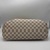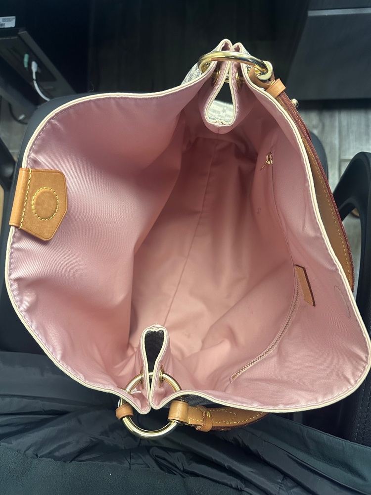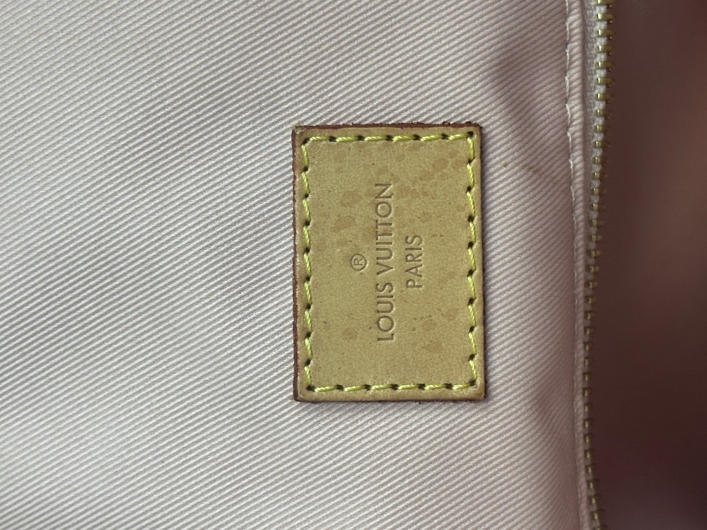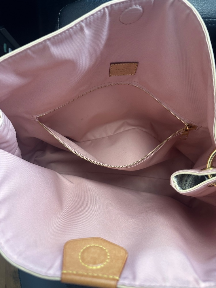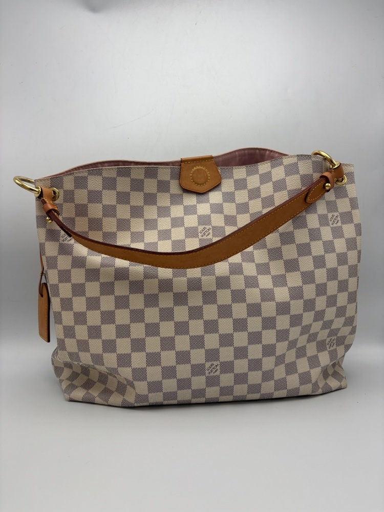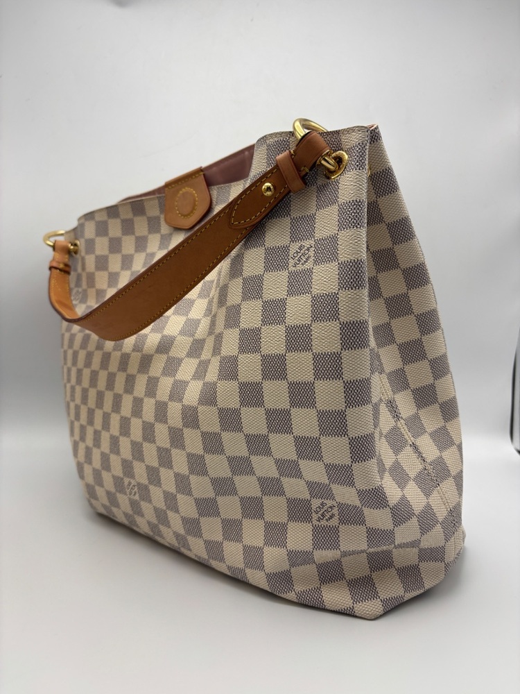 The Louis Vuitton Graceful MM in Damier Azur is a slouchy, large shoulder bag crafted from the brand's signature Damier Azur coated canvas, featuring a light-colored checkered pattern inspired by the Italian Riviera. It is designed with a single, flat natural cowhide leather shoulder strap with polished brass hardware and a magnetic closure that opens to a spacious, often pink, fabric interior with a zip pocket. The bag is noted for its lightweight, pliable, and unstructured shape, which makes it a practical and spacious everyday bag that can fit many essentials.
