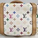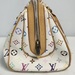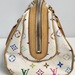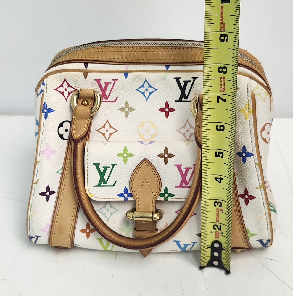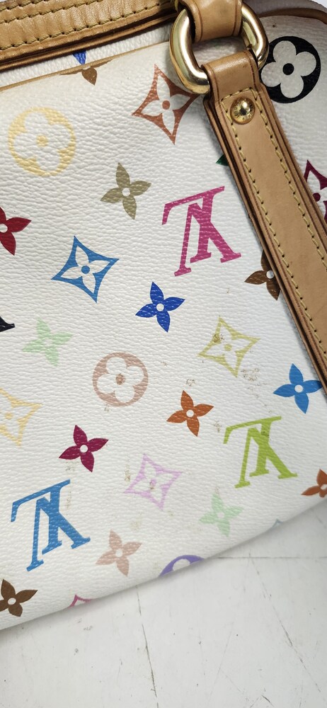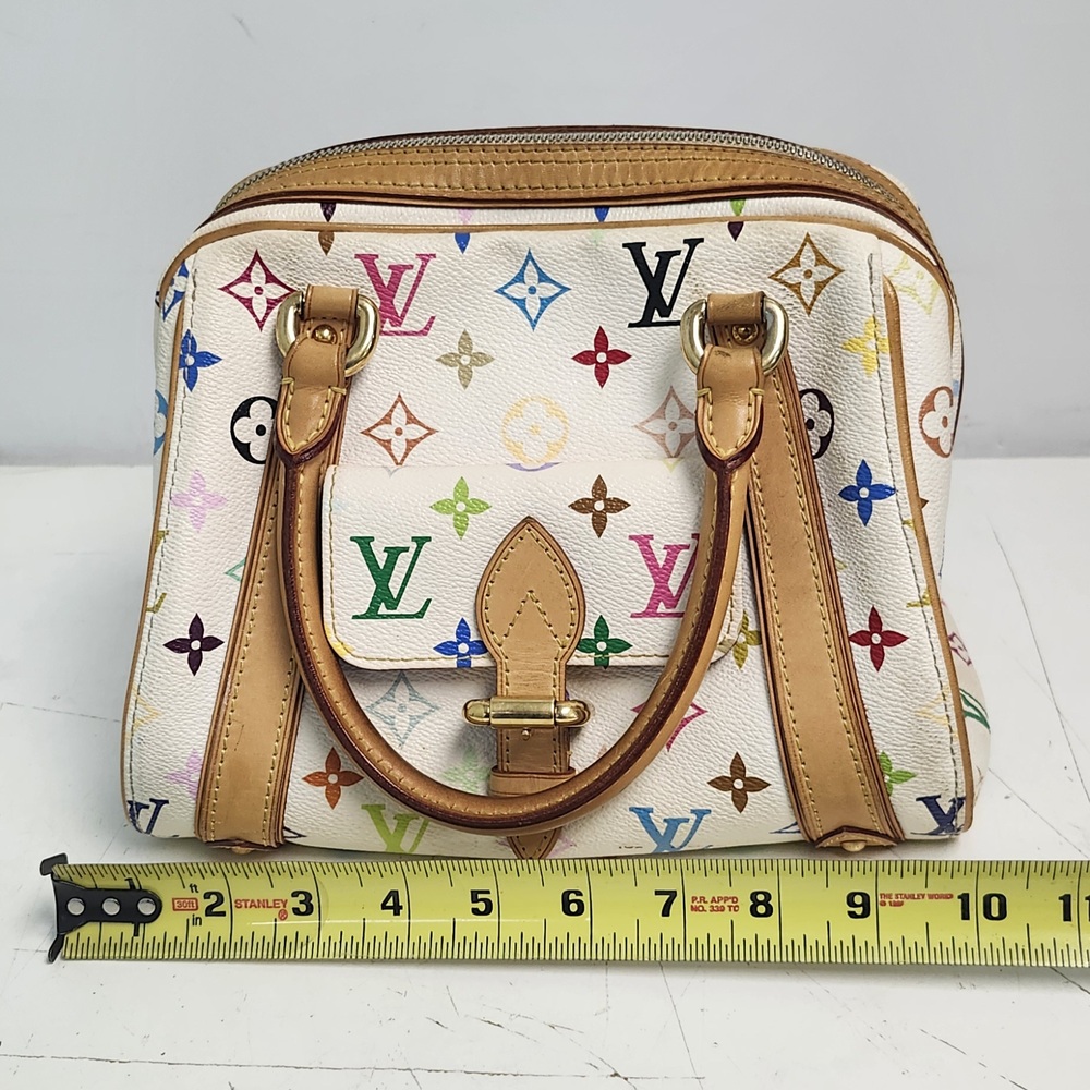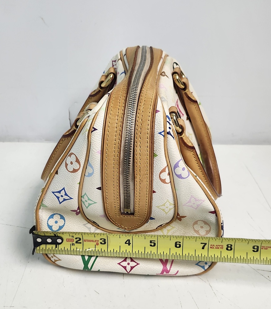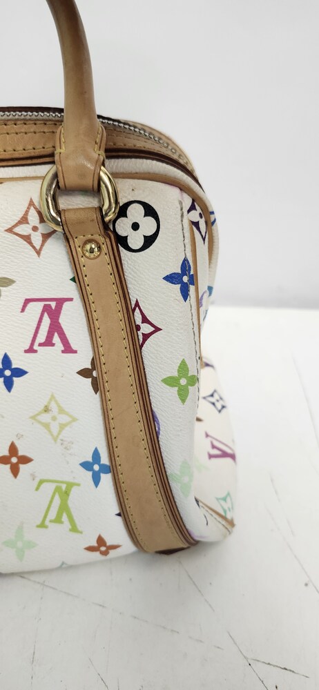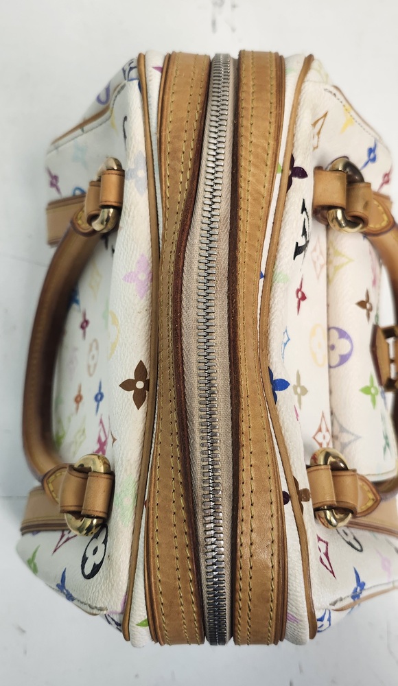 Authentic Louis Vuitton Multicolor Priscilla handbag in Blanc (white). Designed in collaboration with Takashi Murakami, featuring the iconic multicolor monogram canvas, natural Vachetta leather trim, rolled leather handles, front pocket, and gold-tone hardware. Burgundy microfiber interior with slip pocket. Classic LV style from the discontinued Multicolore line.